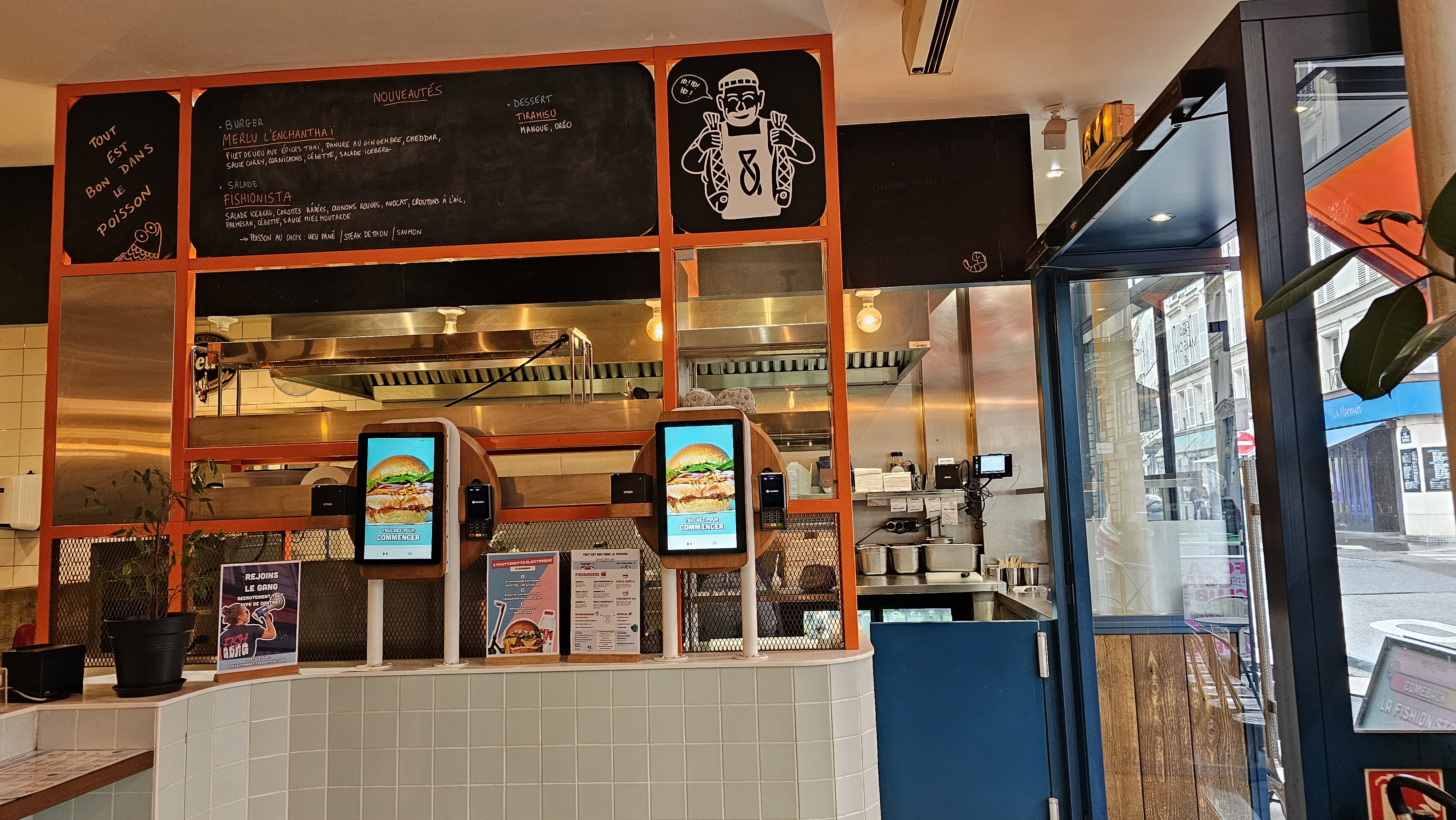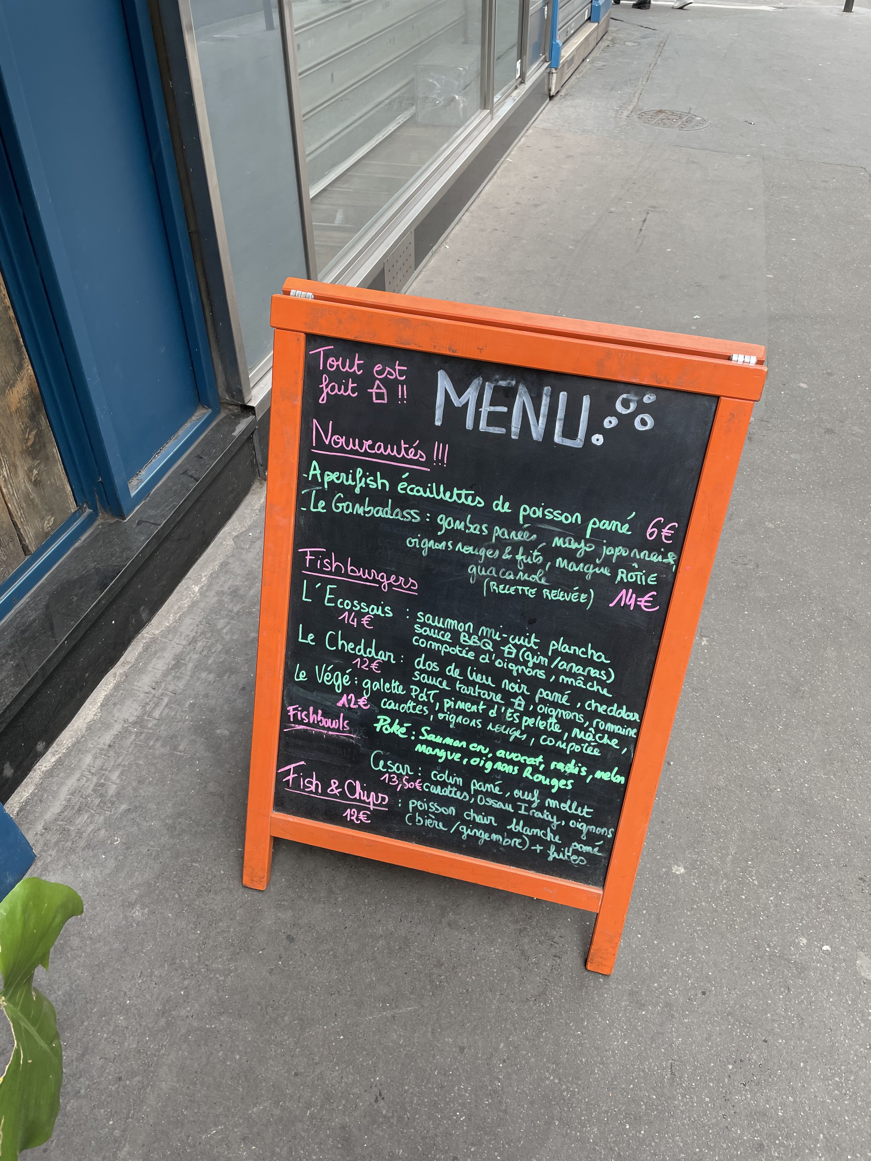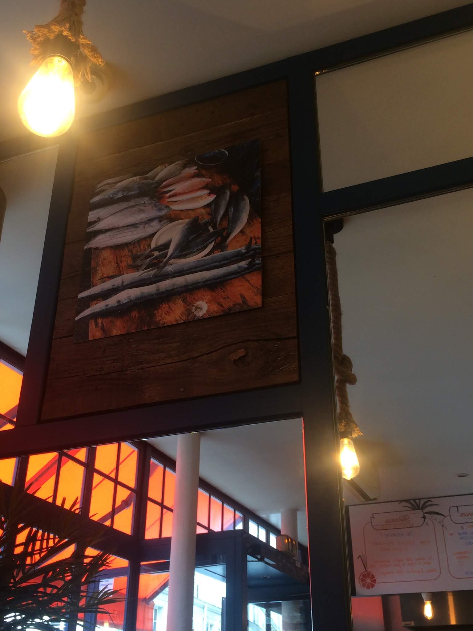 De quoi satisfaire les amoureux de poisson ! Possibilité de l'avoir pané, ou à la plancha (il me semble), en burger ou en assiette. Service très rapide. Possibilité de manger sur place mais il y a beaucoup de demande à emporter ! Le restaurant est situé dans une rue très passante et surtout entourée de bureaux donc il faut s'attendre à un peu de monde. Bonne qualité des produits. Belle décoration et atmosphère agréable pour y manger. C'est un resto effectivement qui porte plus à manger rapidement. Cela ne demande pas d'y passer la journée mais un break fait largement l'affaire !