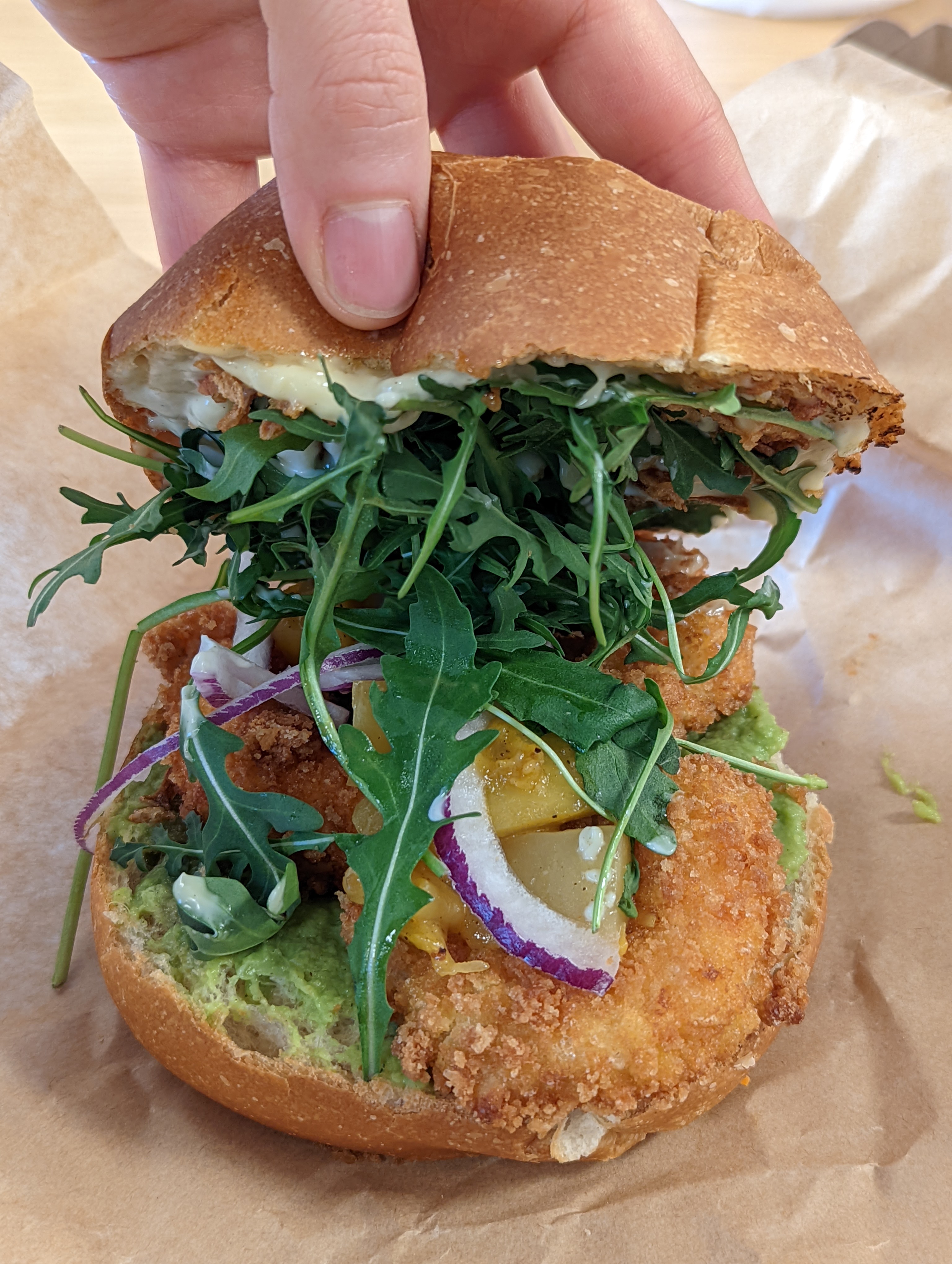 Le resto est un peu petit mais les plats sont délicieux, les crevettes panées sont une tuerie. L’équipe est sympathique! On s’est trompés à la commande et on a commandé un burger vegan mais on voulait goûter un burger saumon et Frankie (le serveur à l’accueil) tellement sympa, nous a offert un burger saumon :) Les deux étaient super bons, le vegan et le saumon!