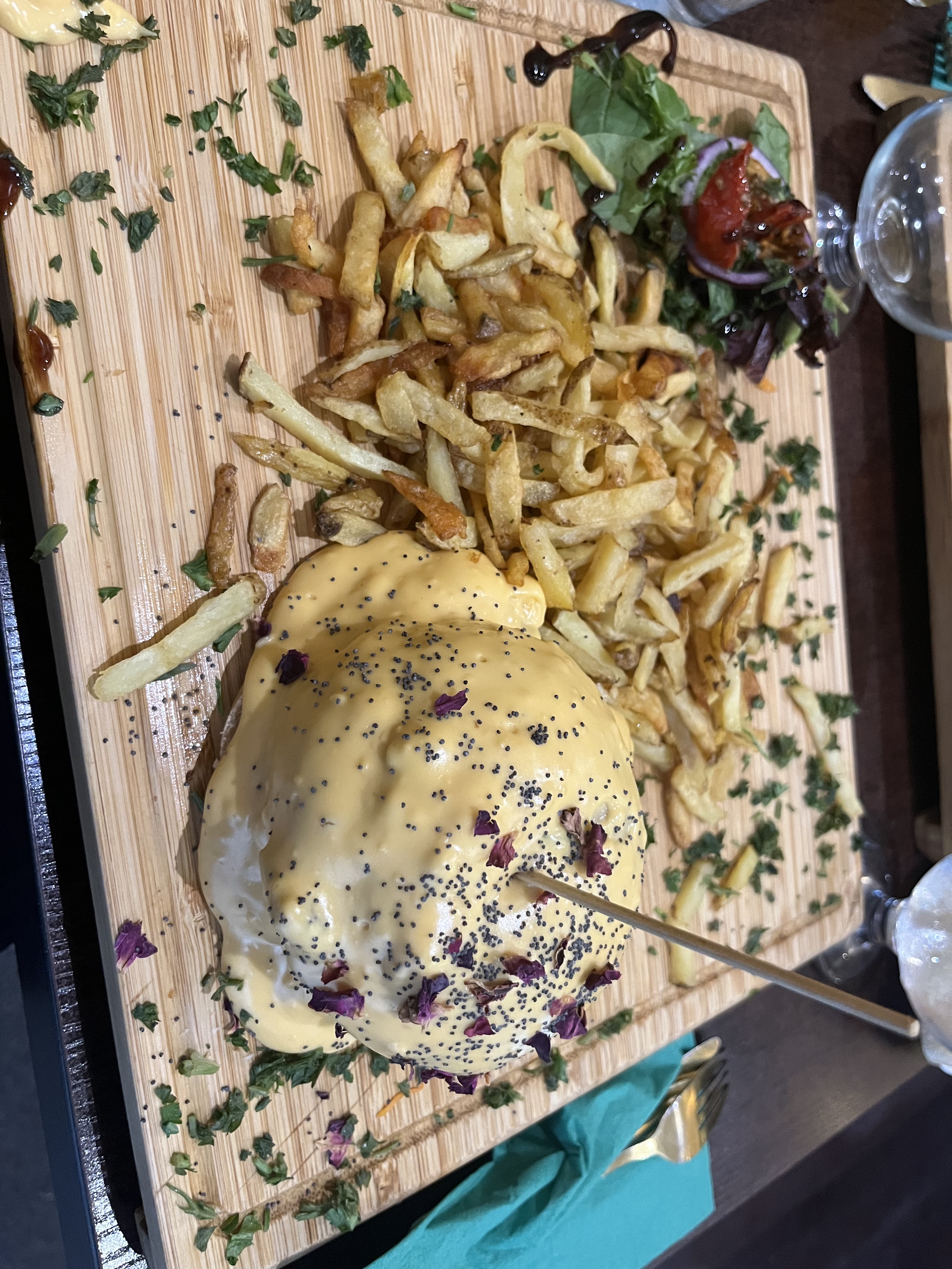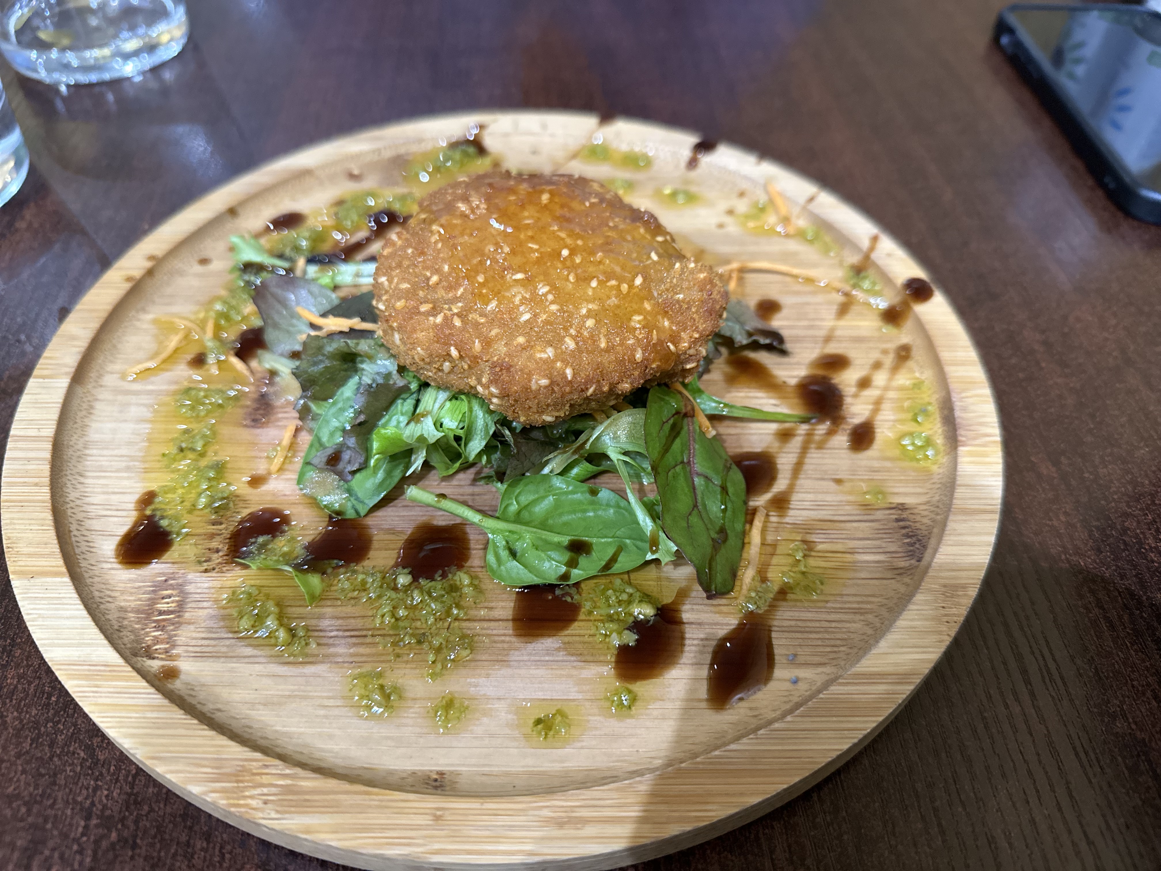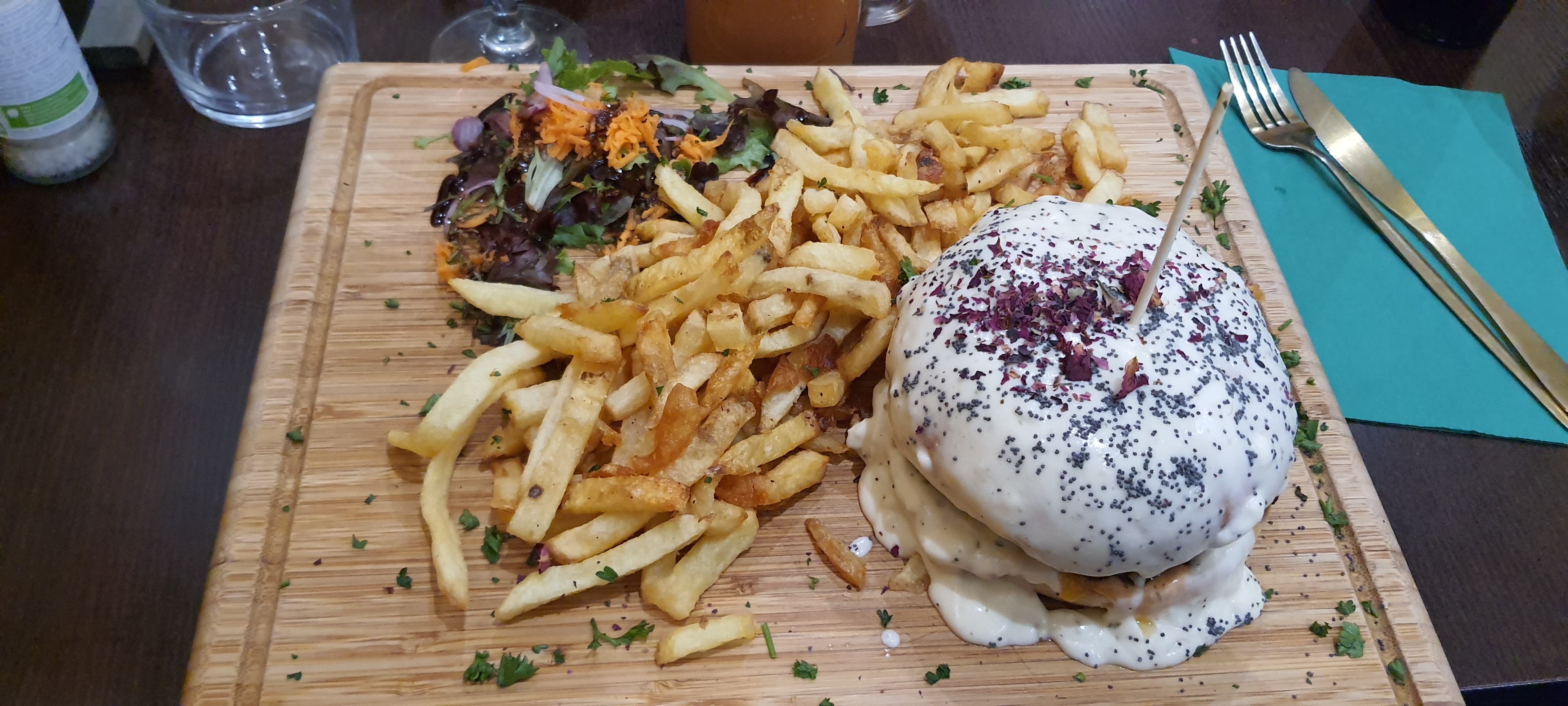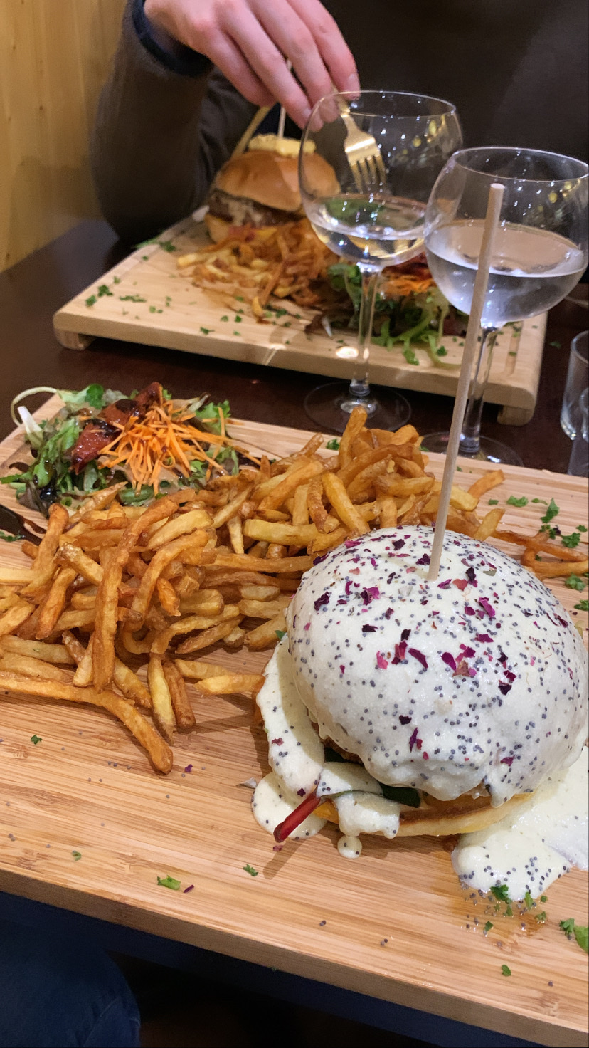 N'étant pas végétarienne j'ai quand même tenté le burger végé avec le chèvre pané et sa sauce secrète, c'était à tomber ! J'ose dire qu'il s'agit du meilleur burger que j'ai pu manger ! Les frites sont faites maison, les produits frais, les quantités très bonnes, personnel super sympathique et resto très convivial ! À recommander 👍🏻