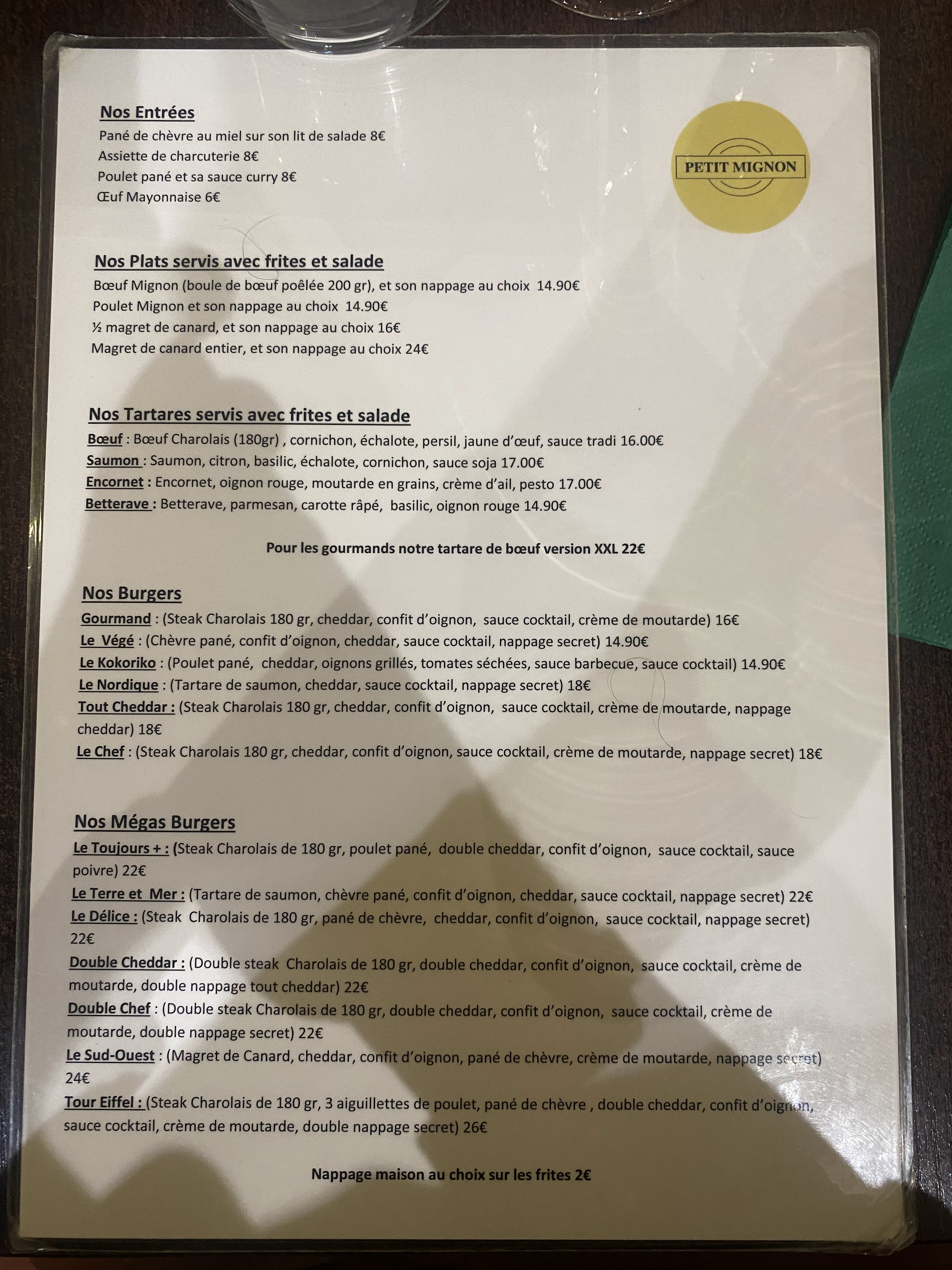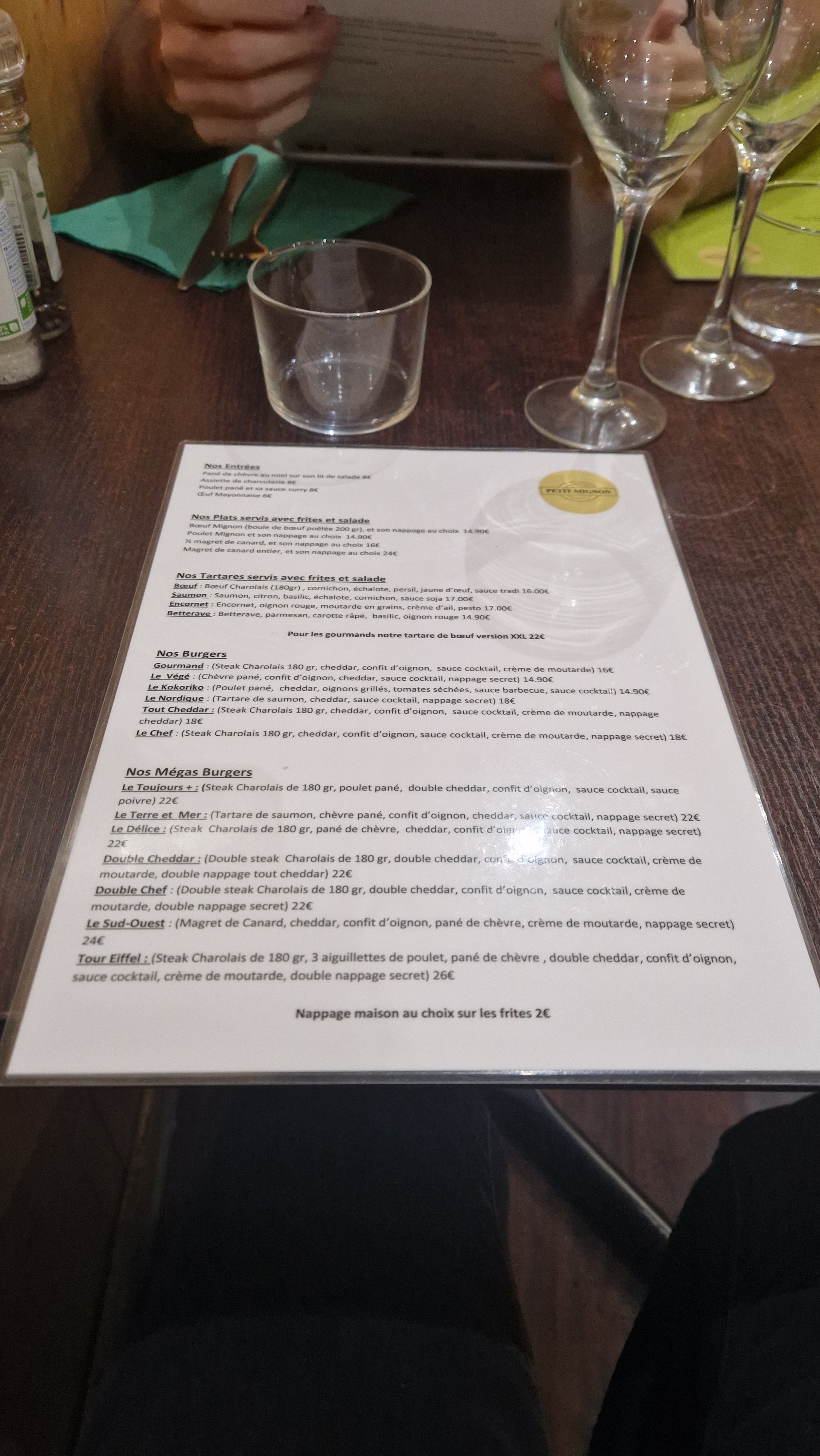 Après y avoir dîner de nombreuses fois je peux dire que le Petit Mignon est indéniablement l'un des meilleurs burger de Bordeaux, toute la carte est excellente, le personnel agréable et les prix justifiés par la qualité.