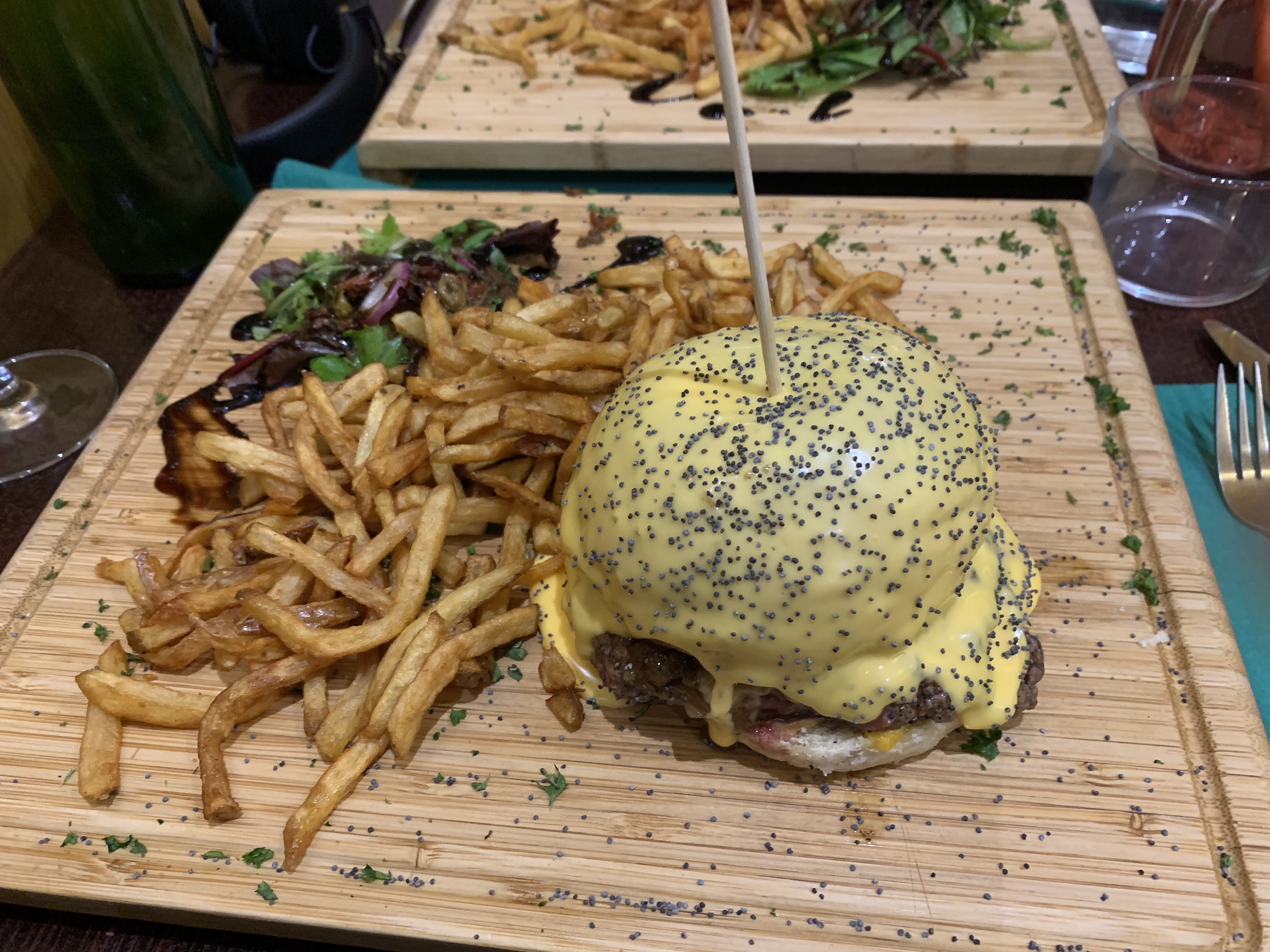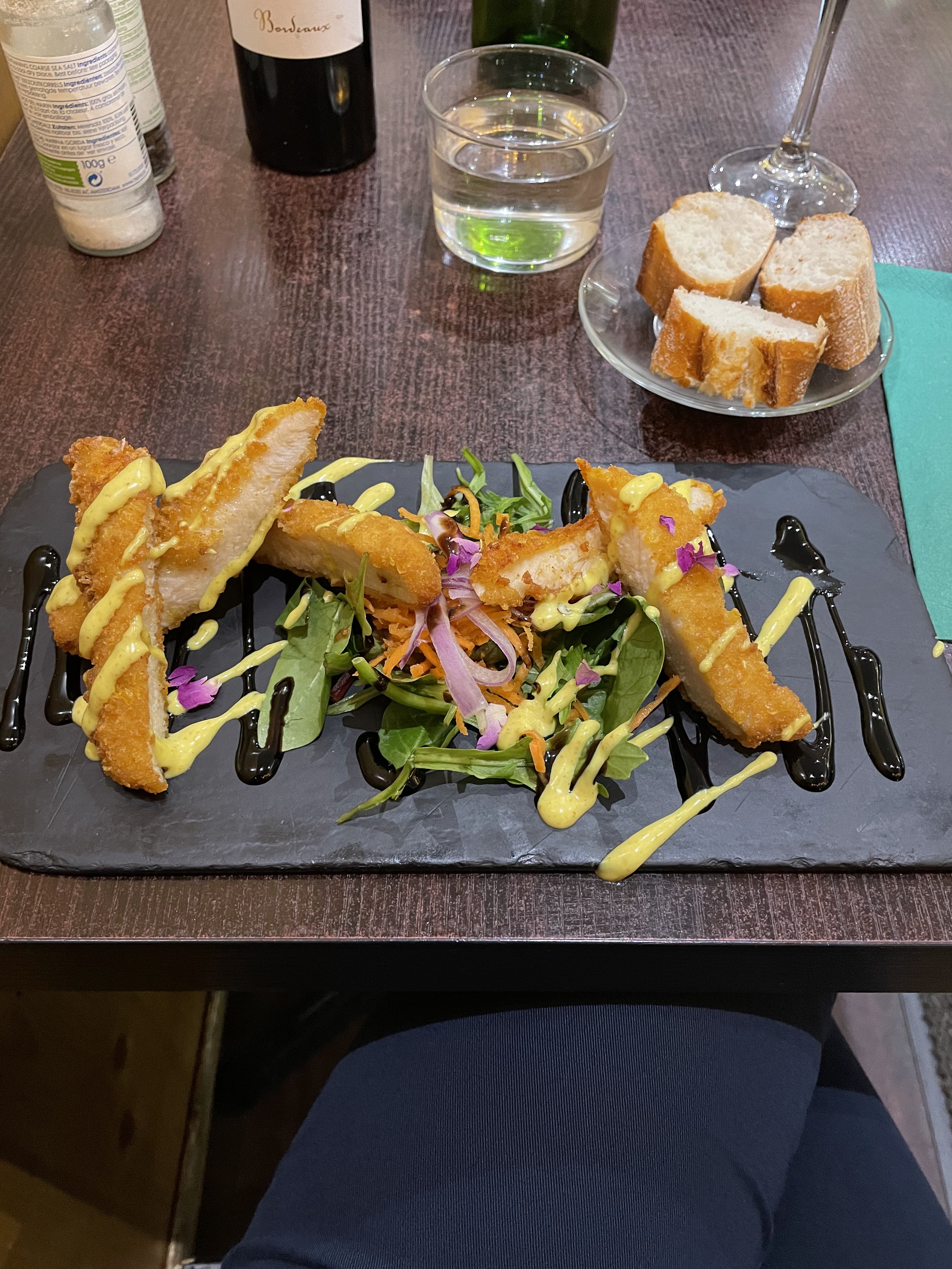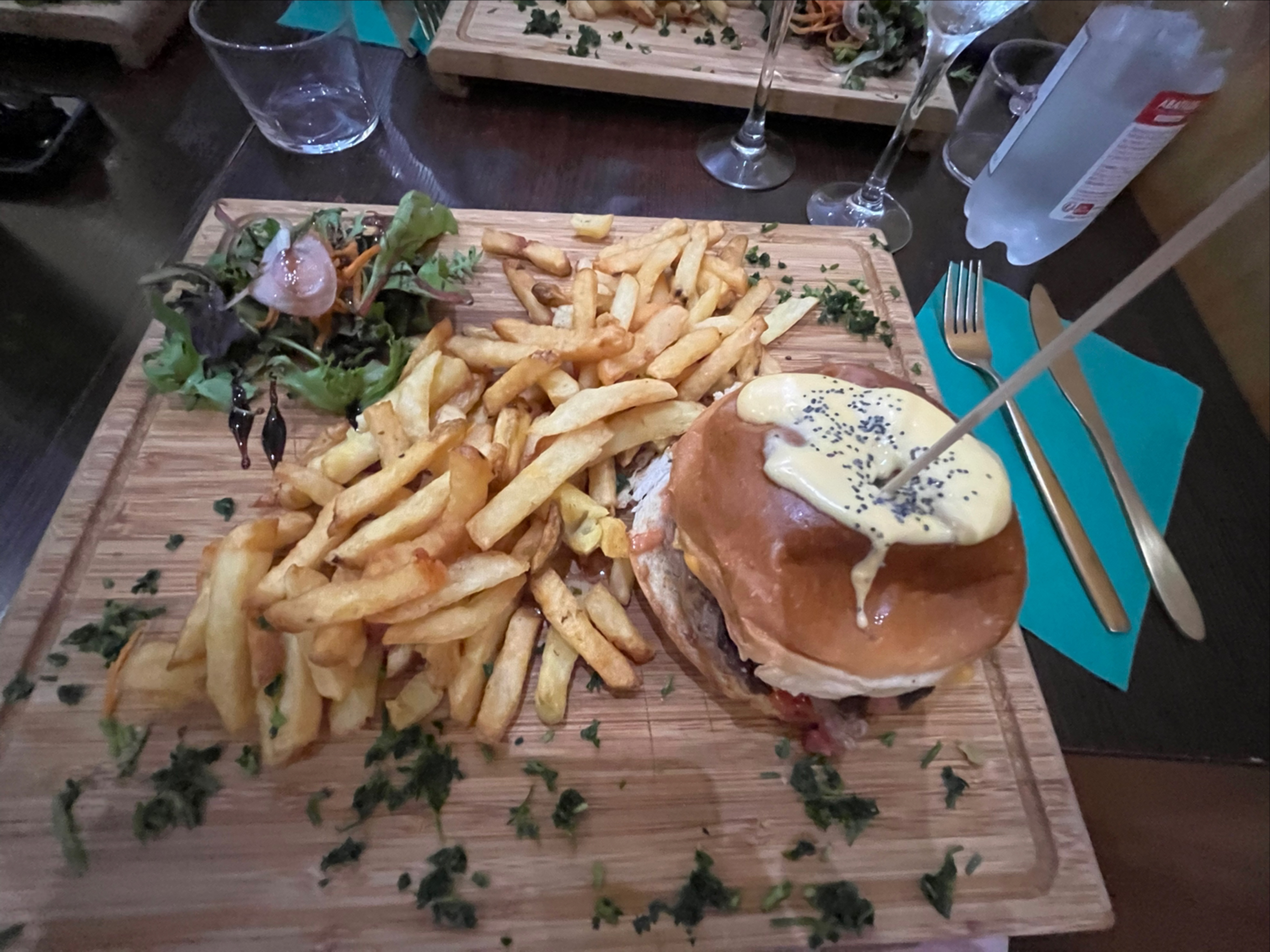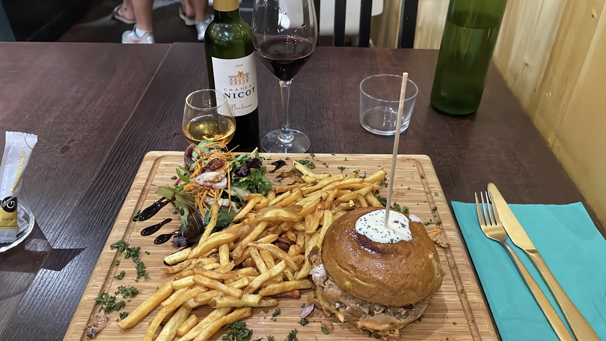 Meilleur repas pour moi durant mon séjour à Bordeaux. Le service est bon, gens sympa. La cuisine m'a tellement fait plaisir. Le poulet pané avec légumes sauce curry... Simple mais très efficace ! Plat : magret de canard. Frite délicieuse !! Bien croustillante et en quantité. Viande : le canard c'est trop bon donc aucune erreur. J'ai adoré '' l'assiette '' qui est une grosse planche, ça donne un côté plus sympa entre ami. Seul point noir : c'était ma sauce goût poivre. Délicieuse oui mais manque de piquant à mon goût. Le reste 20/20 La planche de bois du comptoir tape dans l'œil !
