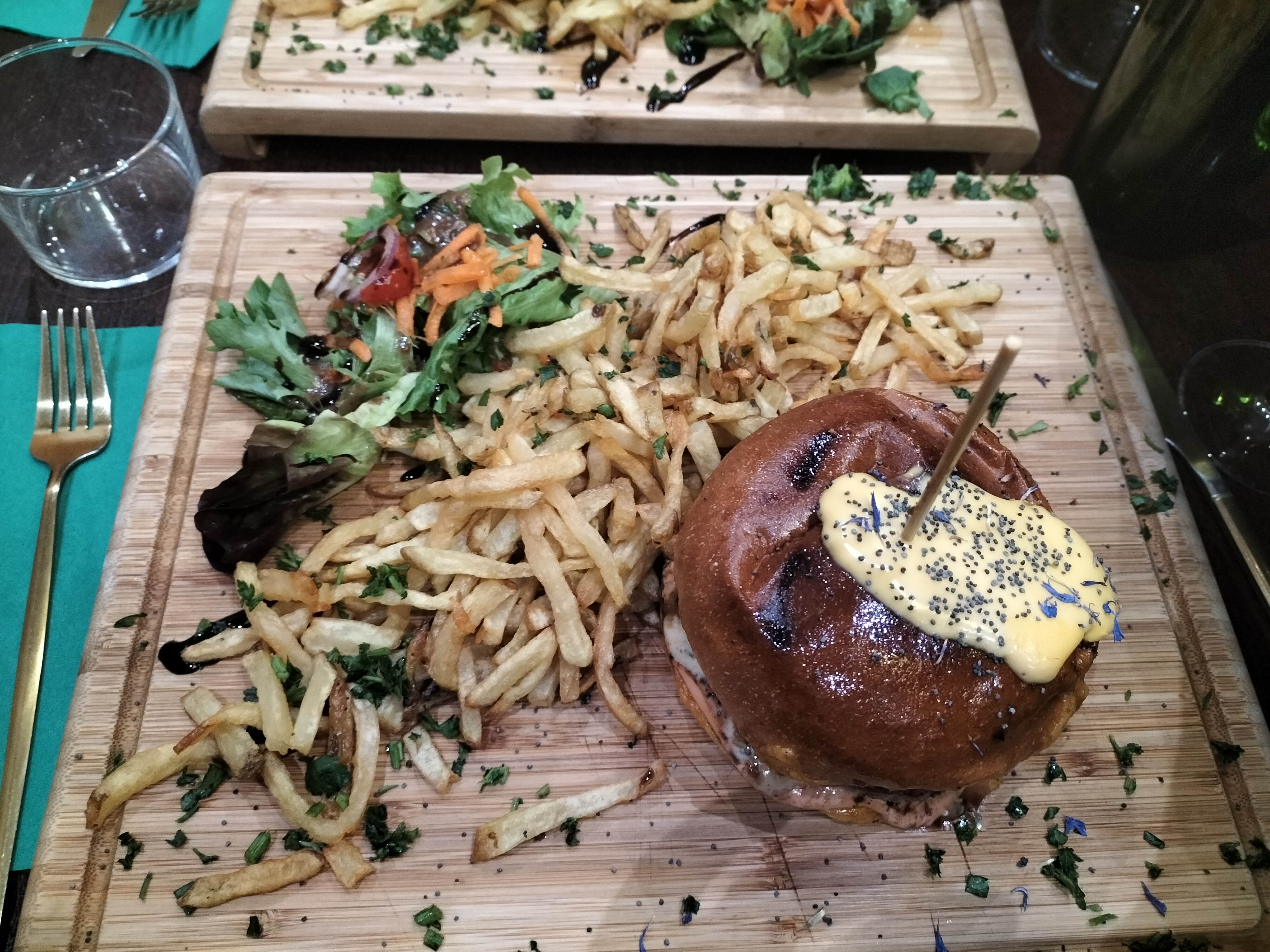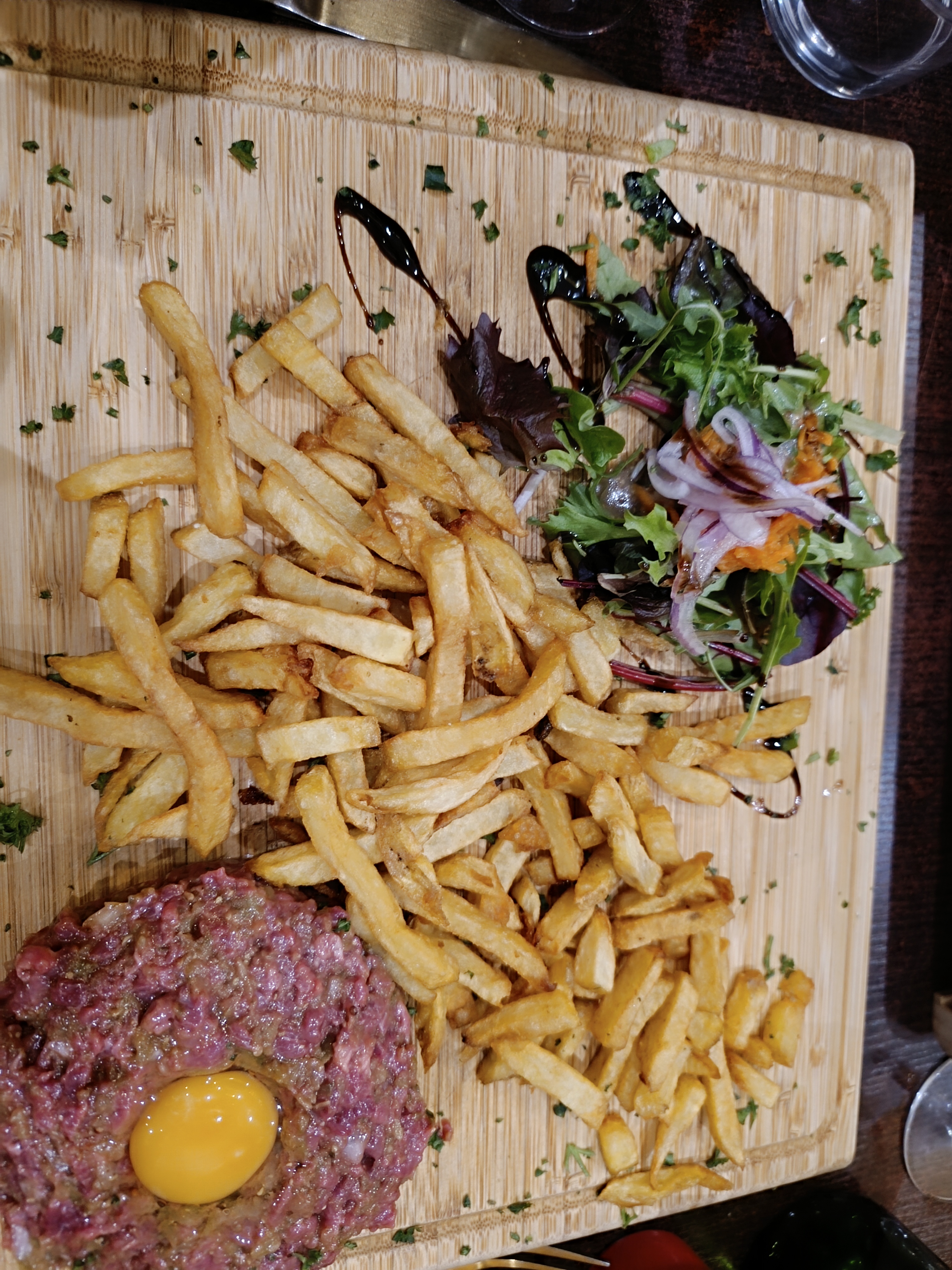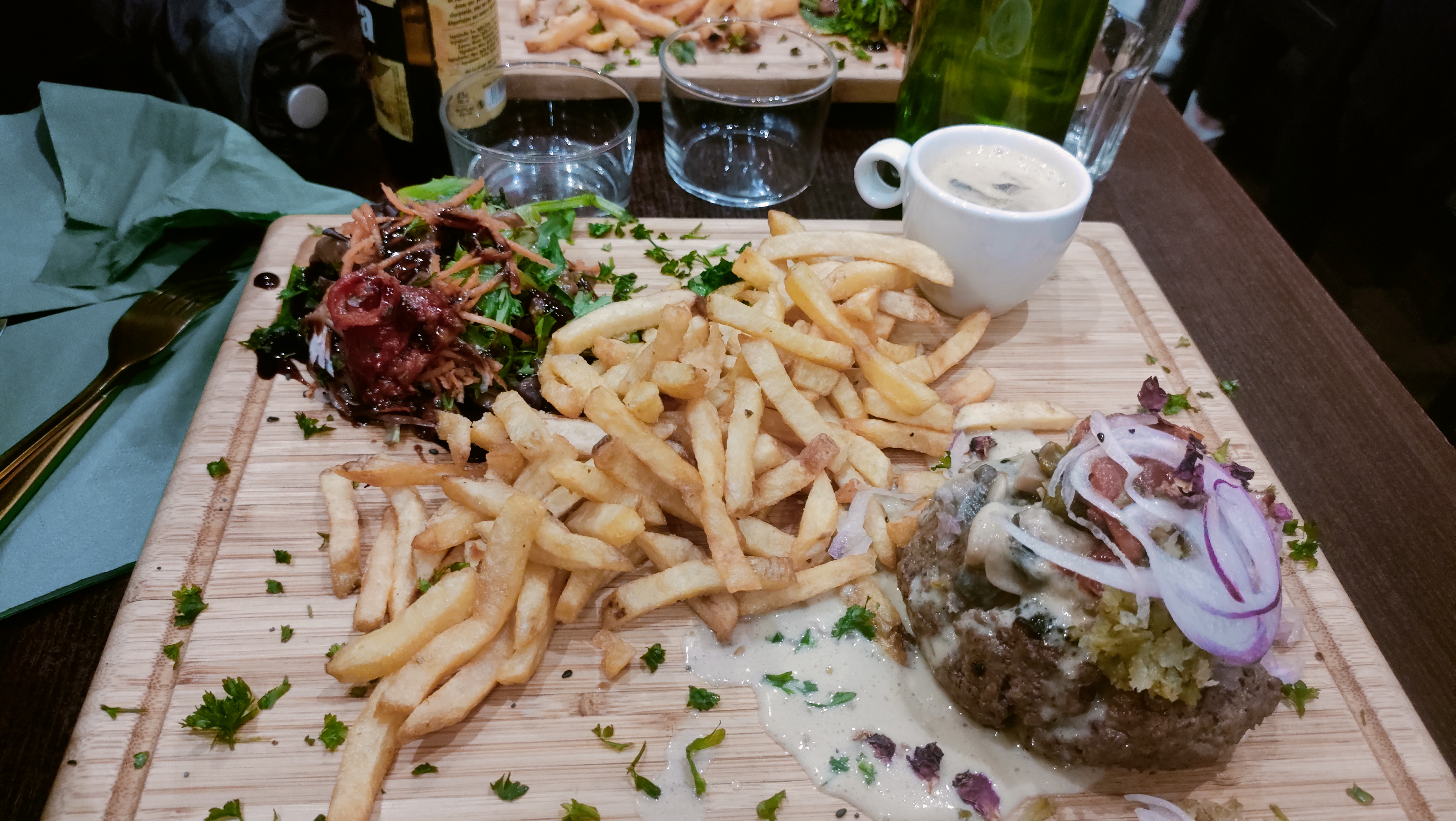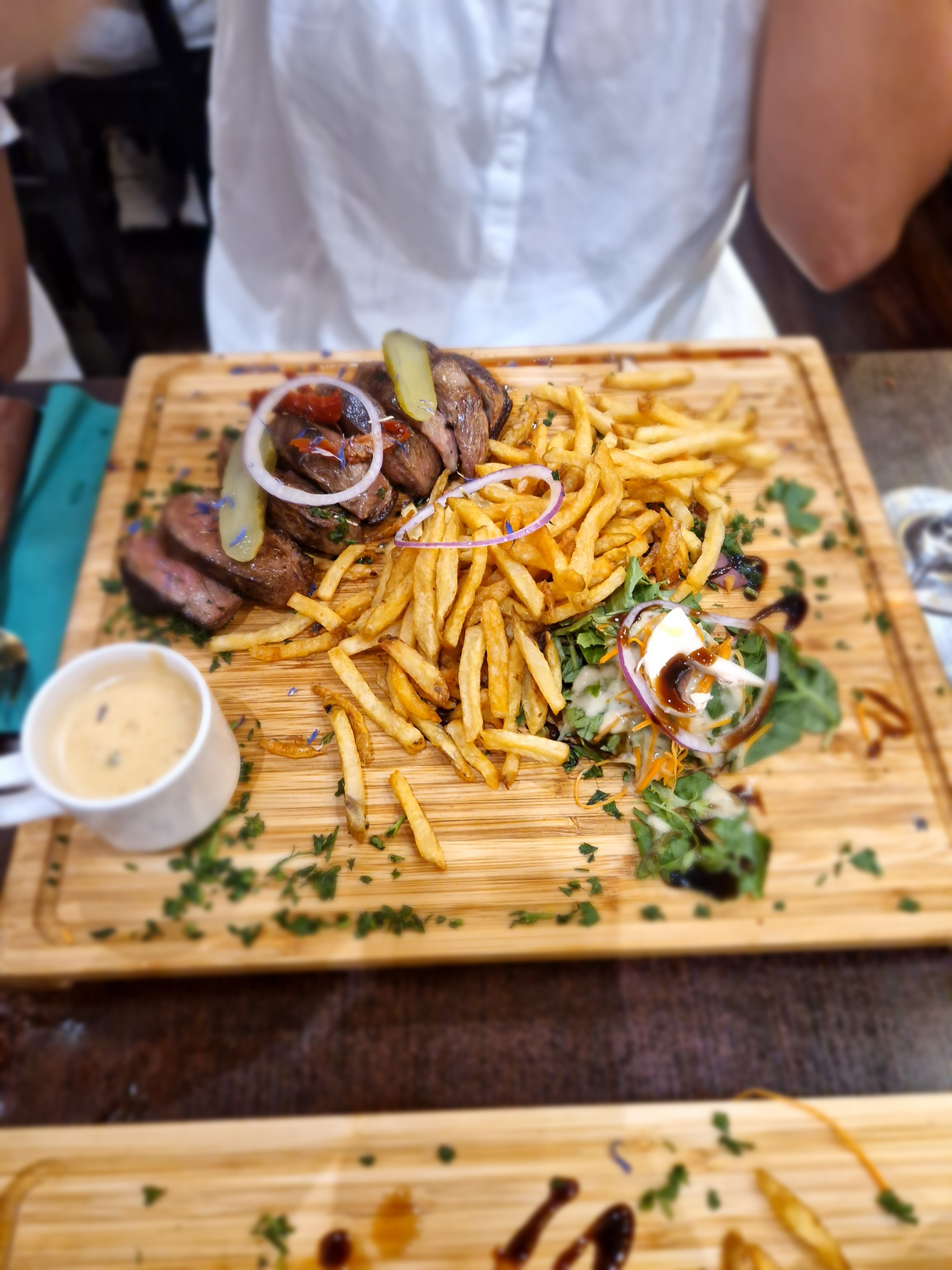 Meilleur repas pour moi durant mon séjour à Bordeaux. Le service est bon, gens sympa. La cuisine m'a tellement fait plaisir. Le poulet pané avec légumes sauce curry... Simple mais très efficace ! Plat : magret de canard. Frite délicieuse !! Bien croustillante et en quantité. Viande : le canard c'est trop bon donc aucune erreur. J'ai adoré '' l'assiette '' qui est une grosse planche, ça donne un côté plus sympa entre ami. Seul point noir : c'était ma sauce goût poivre. Délicieuse oui mais manque de piquant à mon goût. Le reste 20/20 La planche de bois du comptoir tape dans l'œil !