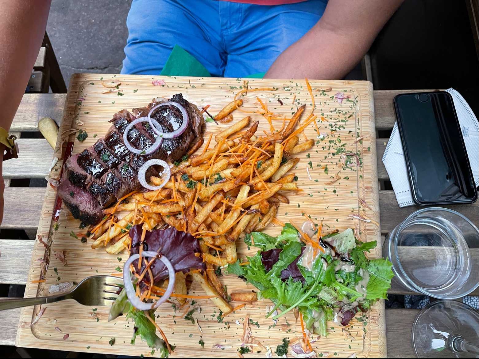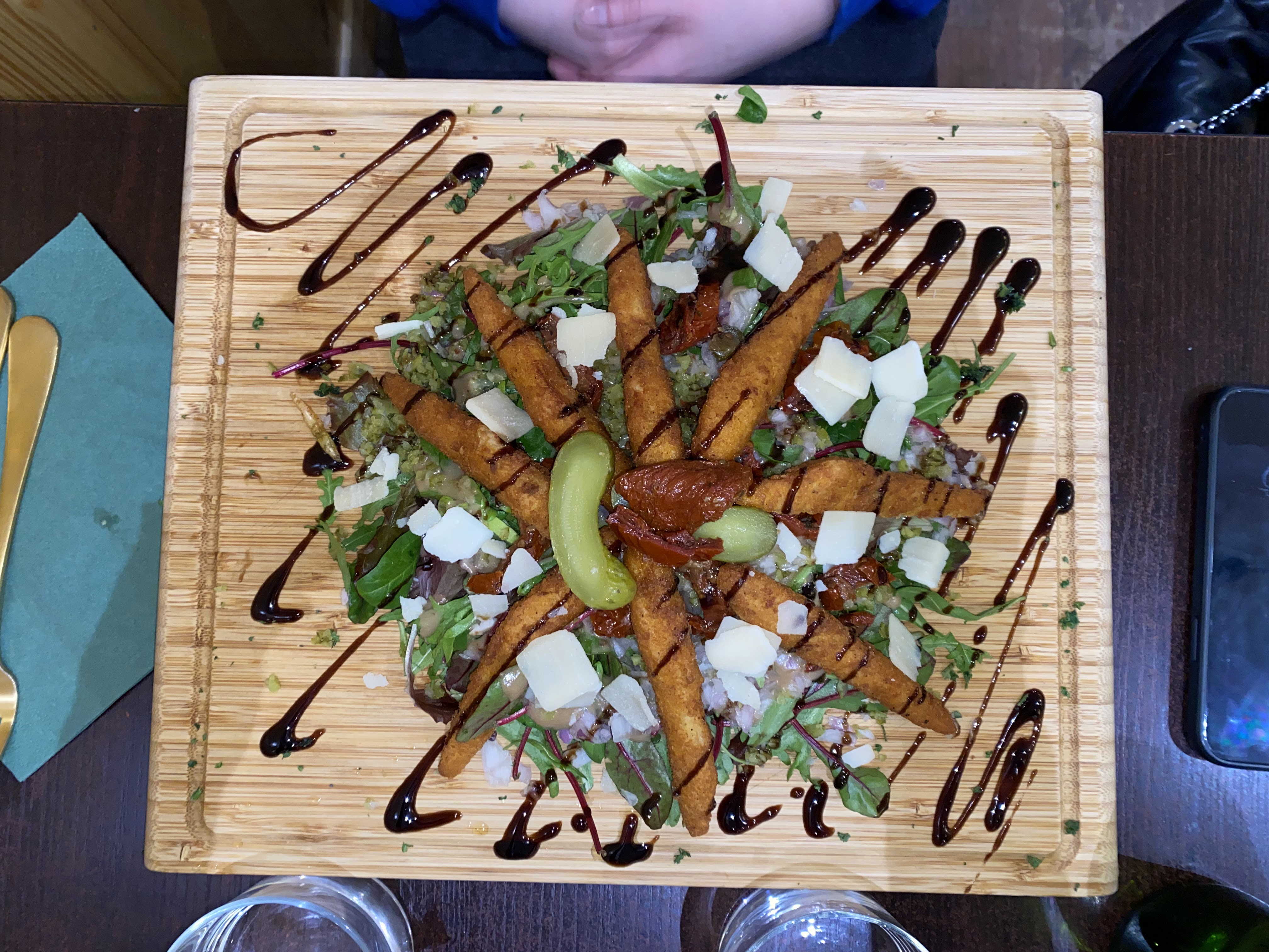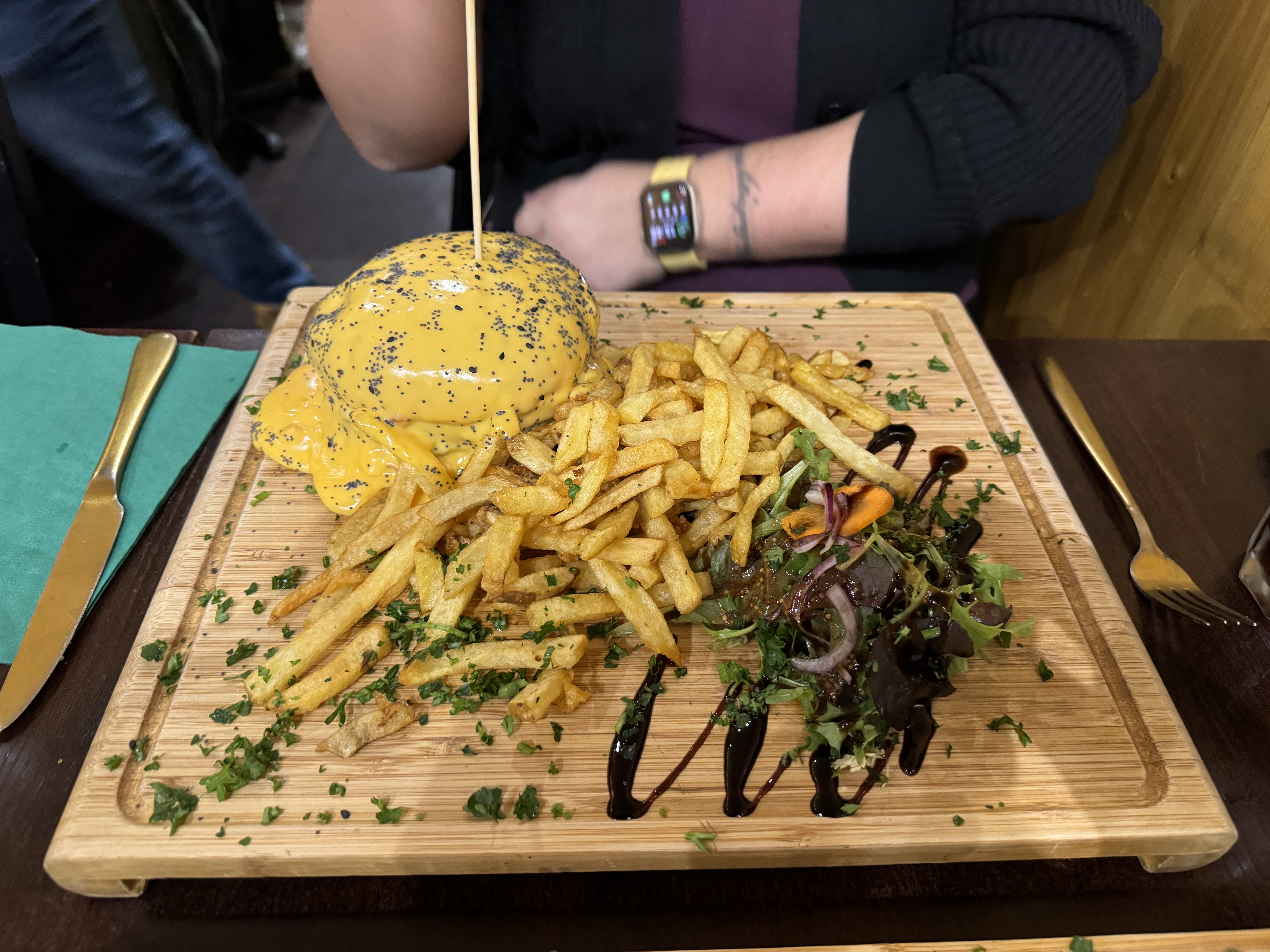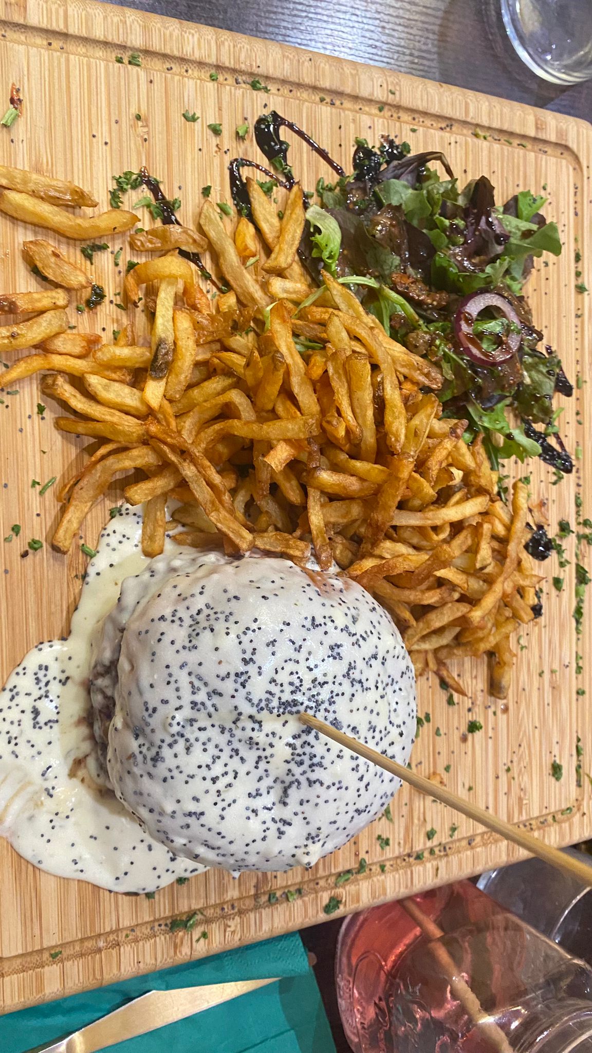 Meilleur repas pour moi durant mon séjour à Bordeaux. Le service est bon, gens sympa. La cuisine m'a tellement fait plaisir. Le poulet pané avec légumes sauce curry... Simple mais très efficace ! Plat : magret de canard. Frite délicieuse !! Bien croustillante et en quantité. Viande : le canard c'est trop bon donc aucune erreur. J'ai adoré '' l'assiette '' qui est une grosse planche, ça donne un côté plus sympa entre ami. Seul point noir : c'était ma sauce goût poivre. Délicieuse oui mais manque de piquant à mon goût. Le reste 20/20 La planche de bois du comptoir tape dans l'œil !