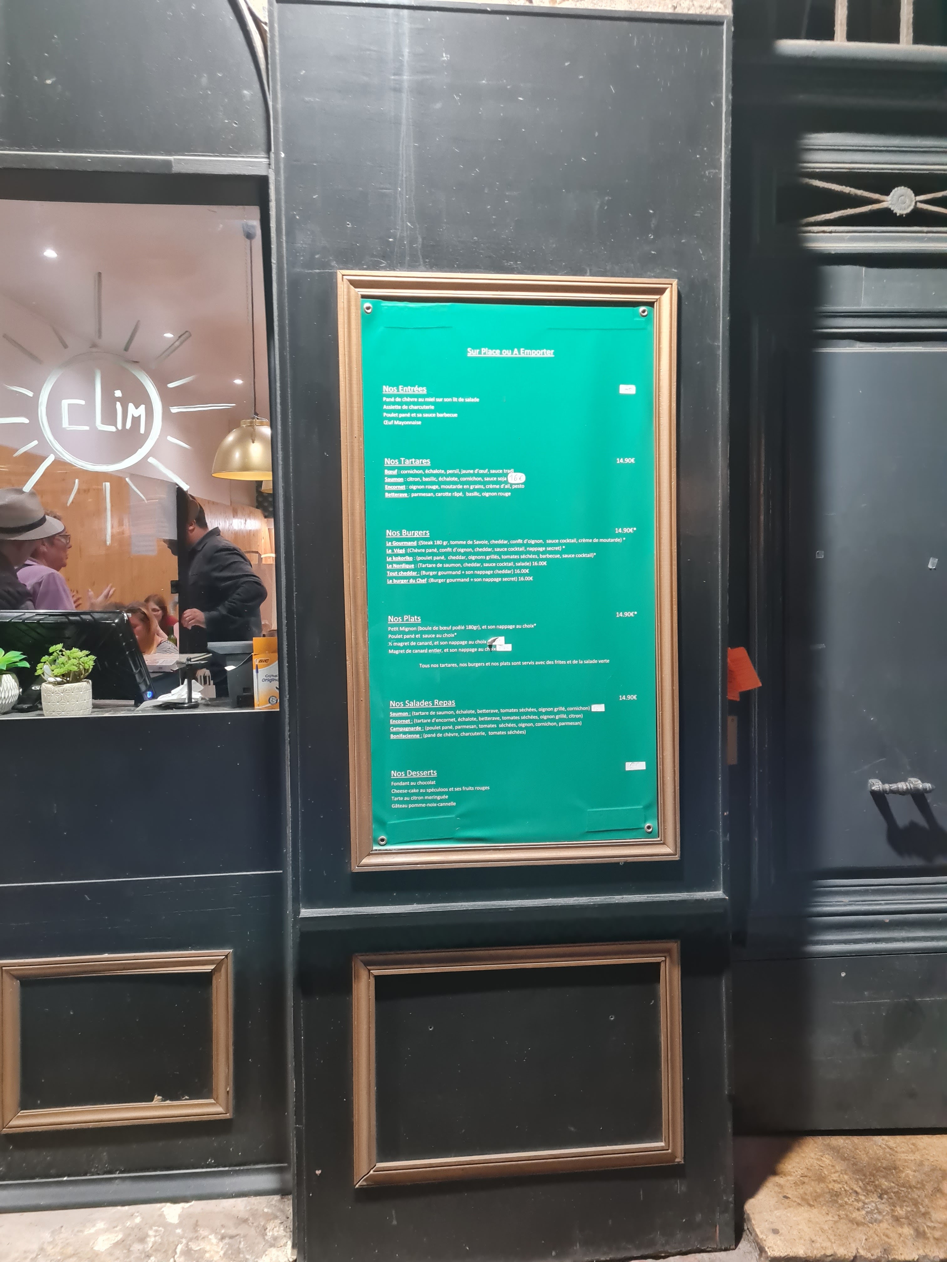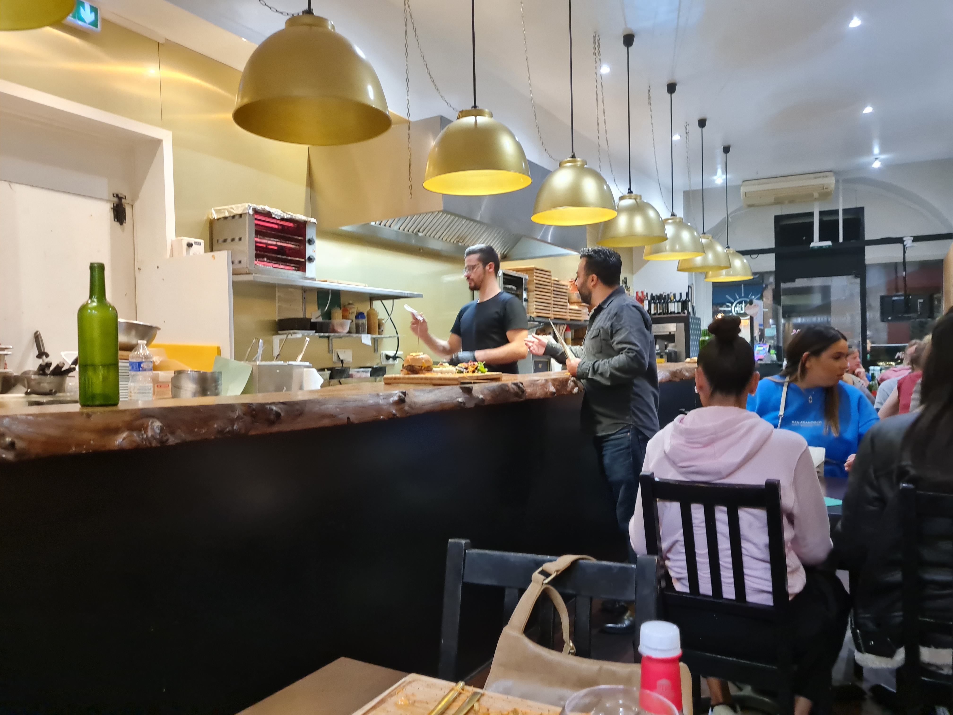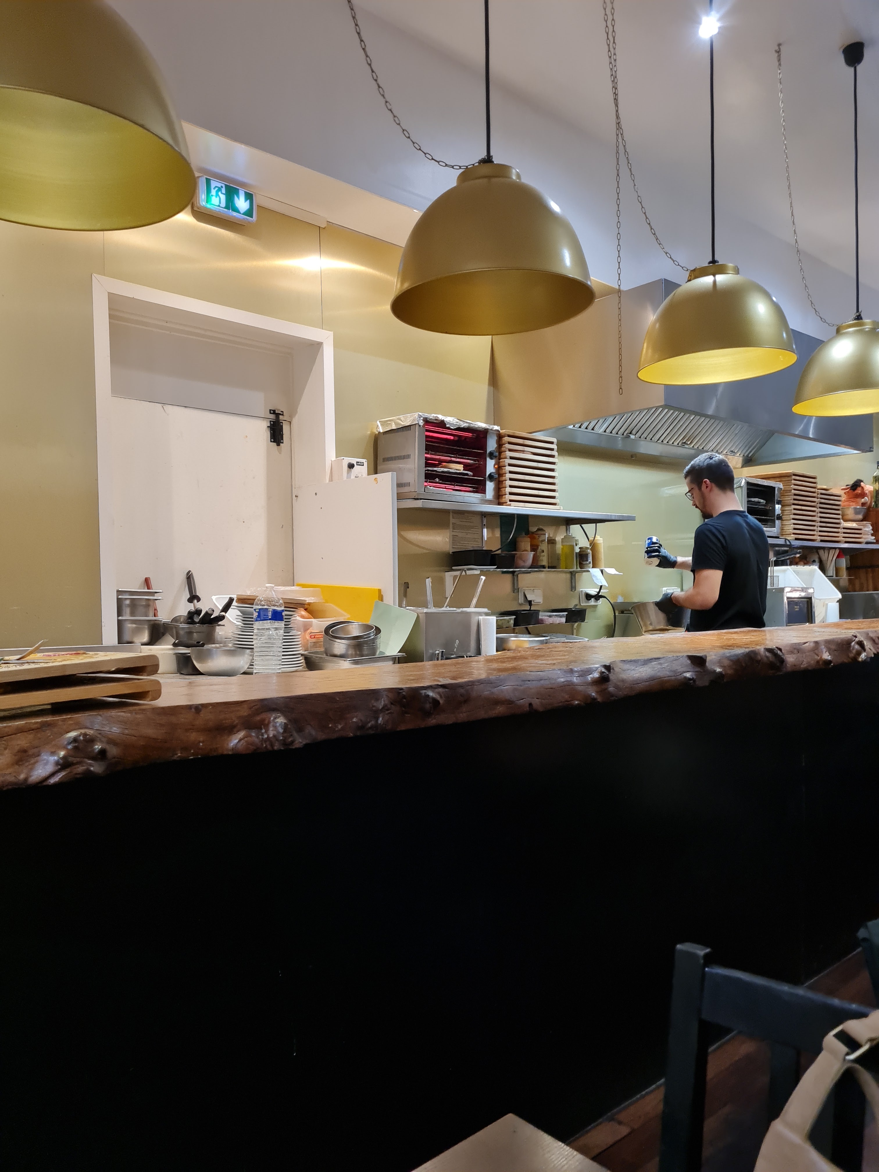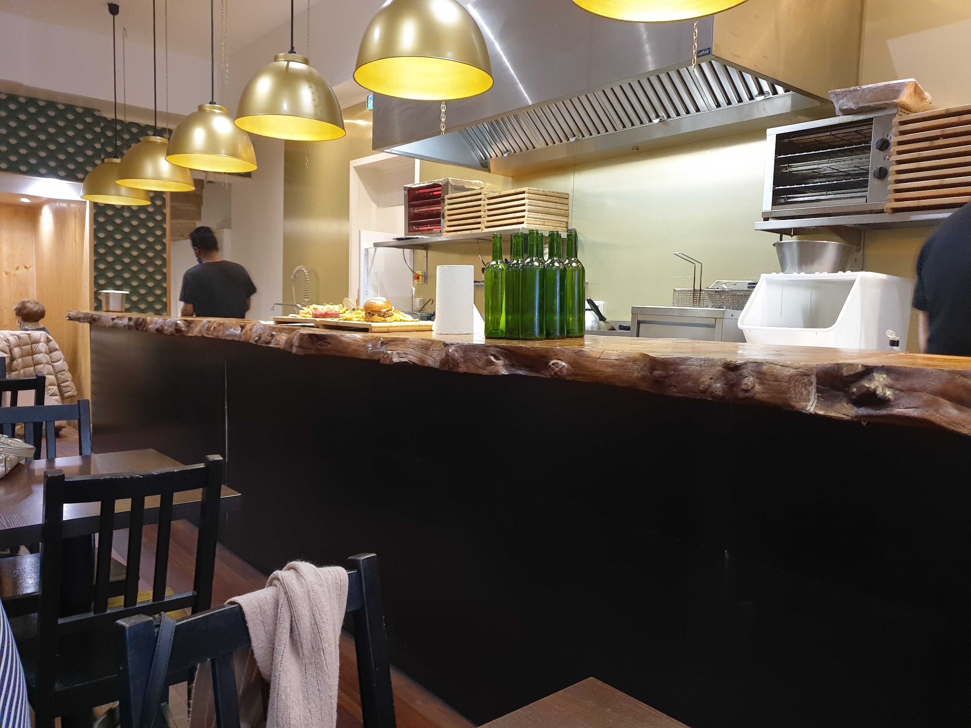 De passage sur bordeaux, je me suis laissé tenter avec un groupe d’amis par ce lieu, bien situé. Je suis plus un habitué de son voisin, mais manger sur place y est plus compliqué. Nous nous sommes donc engagé dans ce restaurant bien noté, et car il affichait être climatisé. Nous avons pris un burger, spécialité de la maison. Les prix sont un tout petit peu chers, surtout ceux des boissons. 4€ un coca ou 8€ la citronnade.. Bref parlons du burger, j’ai demandé une cuisson saignante, mon burger n’était pas saignant mais trop cuit, et la viande était sans plus. Mais celle ci, était bien relevée par leur sauce. Le pain était un peu trop sucré, vous donnant l’impression de manger une viennoiserie. Les frites étaient bonnes, c’était agréable. La Clim ne fonctionnait malheureusement pas, et la salle était sombre. Avec une vue sur la cuisine, un effort sur le rangement, la propreté et l’utilisation du papier d’allu serait à encourager. Sans cette vue j’aurais sans doute donné une étoile de plus, mais la photo parle d’elle même. Bon courage à toute l’équipe.
