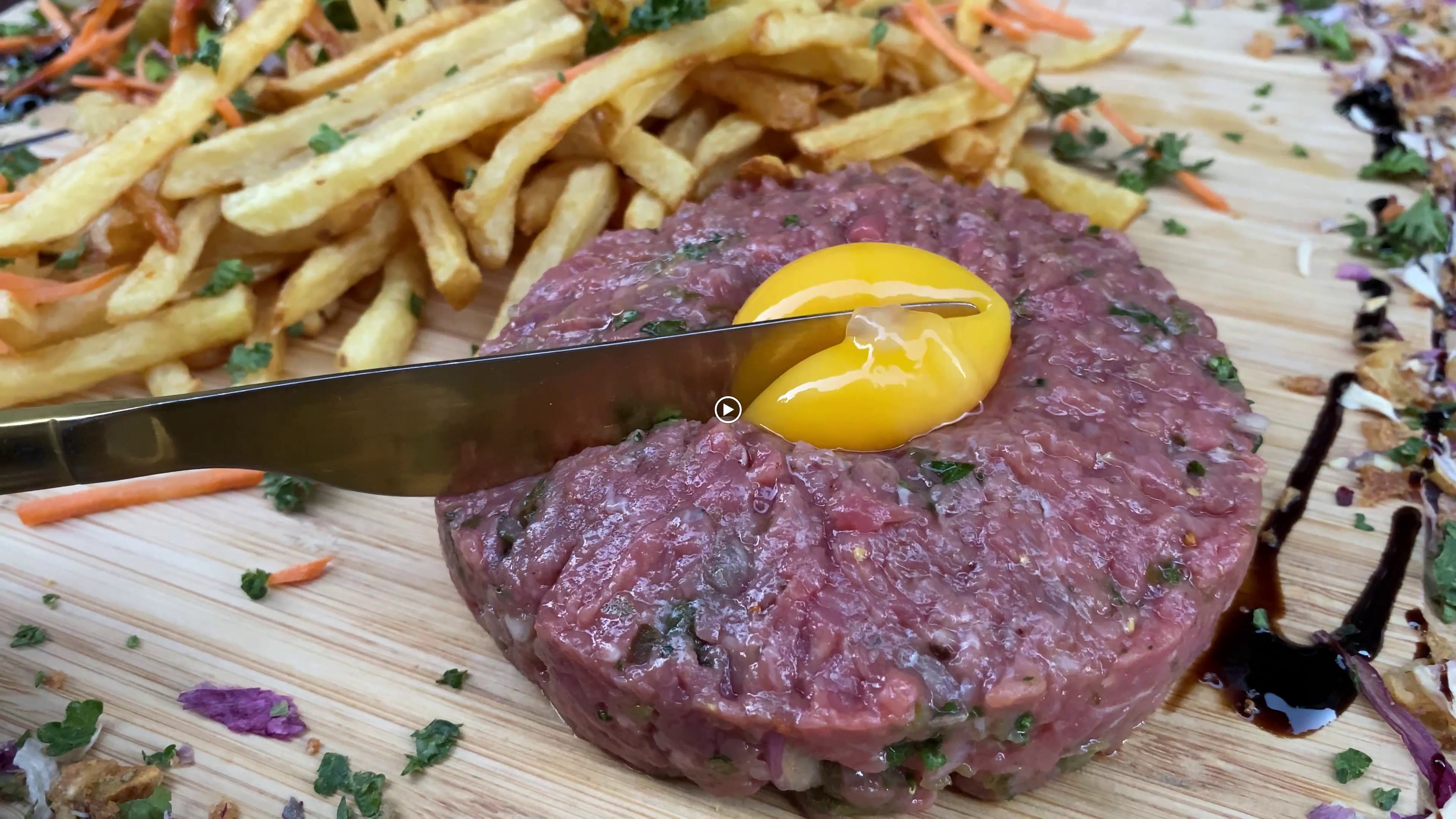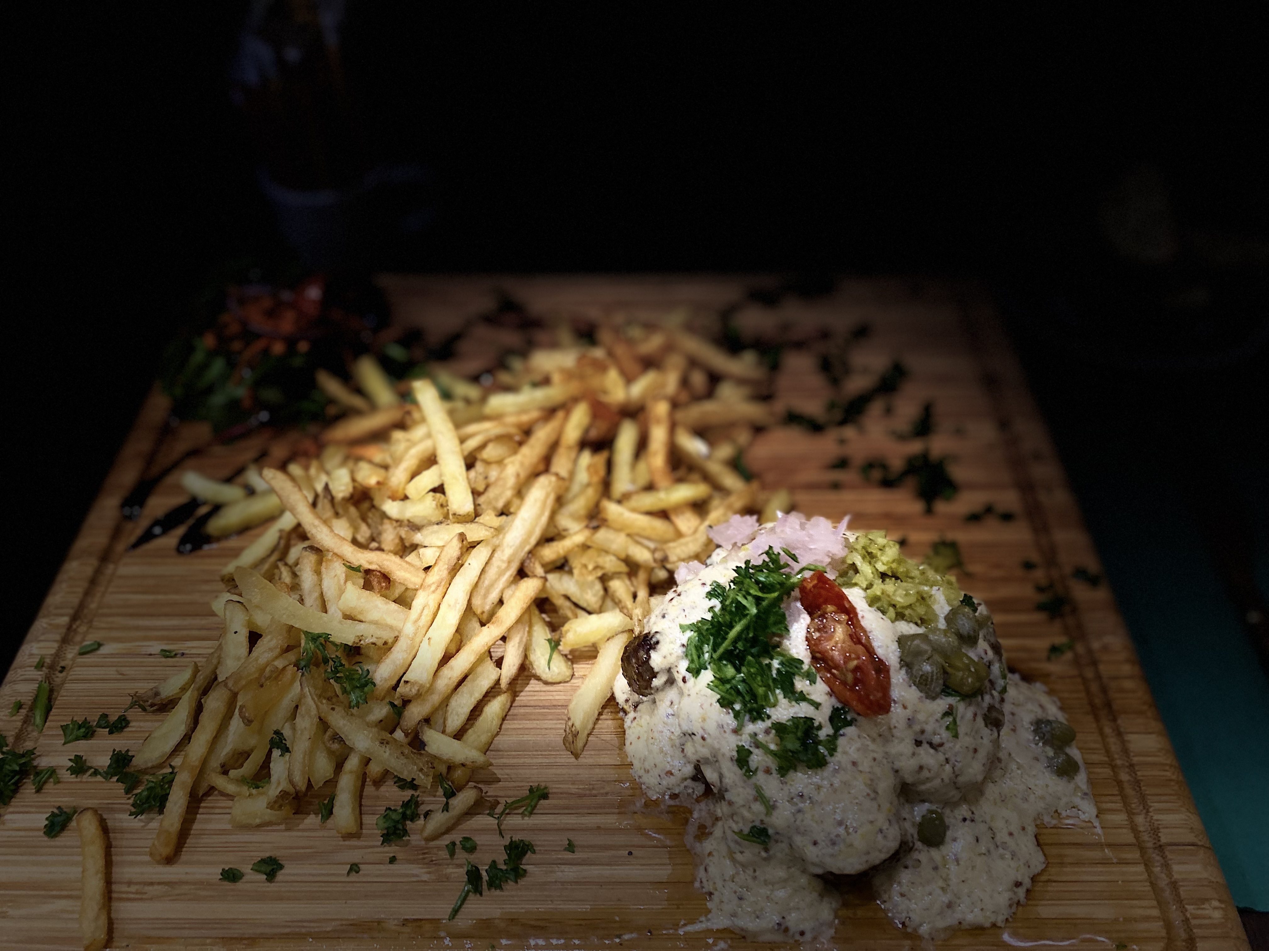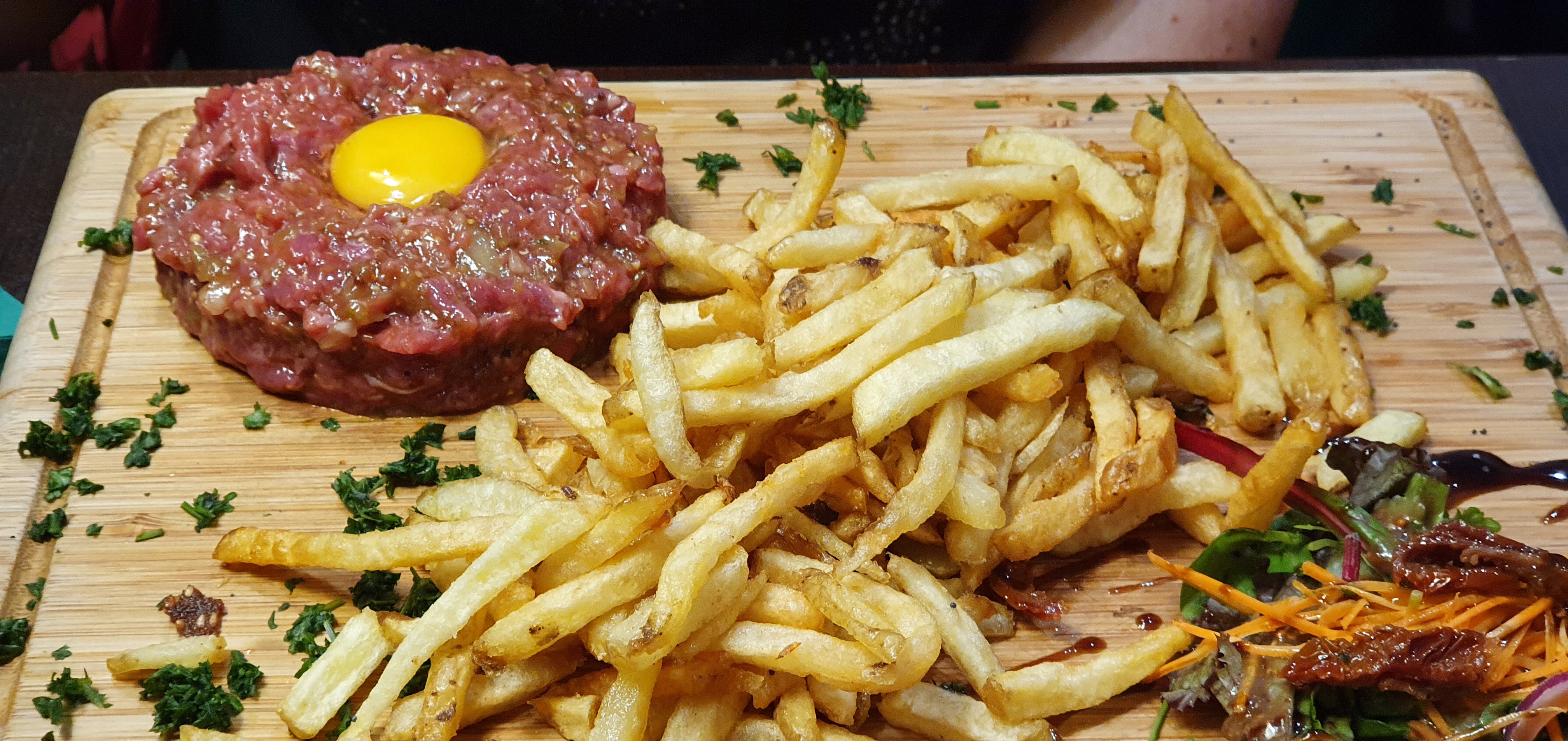 Un personnel très souriant vous accueille dans ce petit restaurant avec sa cuisine ouverte, où vous pourrez apercevoir le chef préparer votre délicieuse commande! J’ai pu goûter le tartare, on parle ici du mariage d’une excellente viande bovine et d’un parfait mélange d’assaisonnement. Des superbes frites allumettes l’accompagne, le tout sur une belle planche en bois. Il y a aussi leur burger double cheese avec un chaud manteau de fromage fondu recouvrant ce délicieux met, où chaque bouché est une véritable explosion de saveurs! Amateurs de bonne viande, c’est ici que vous devez venir.