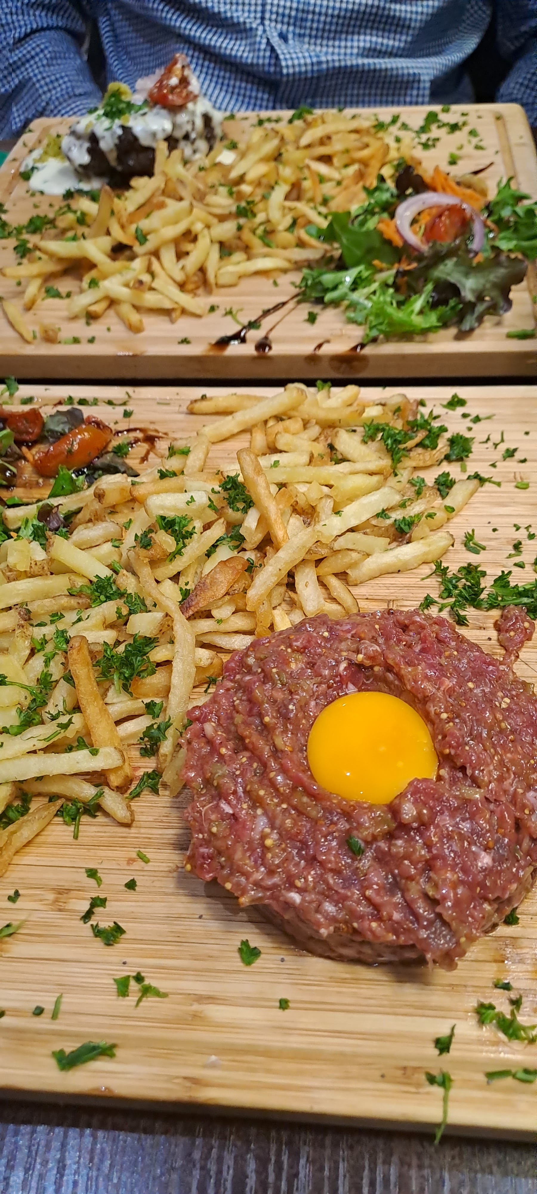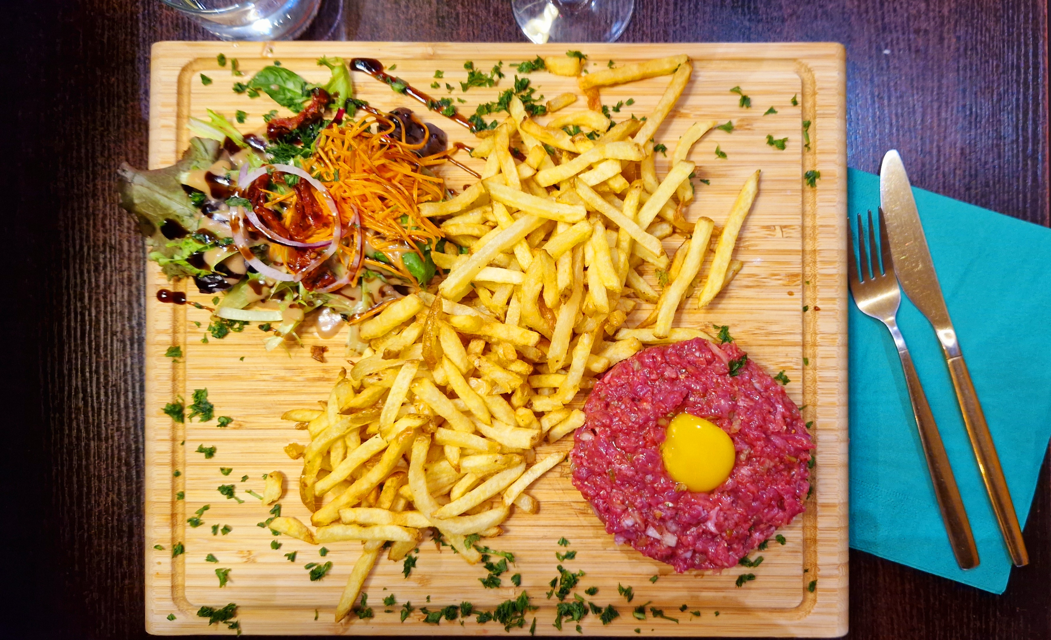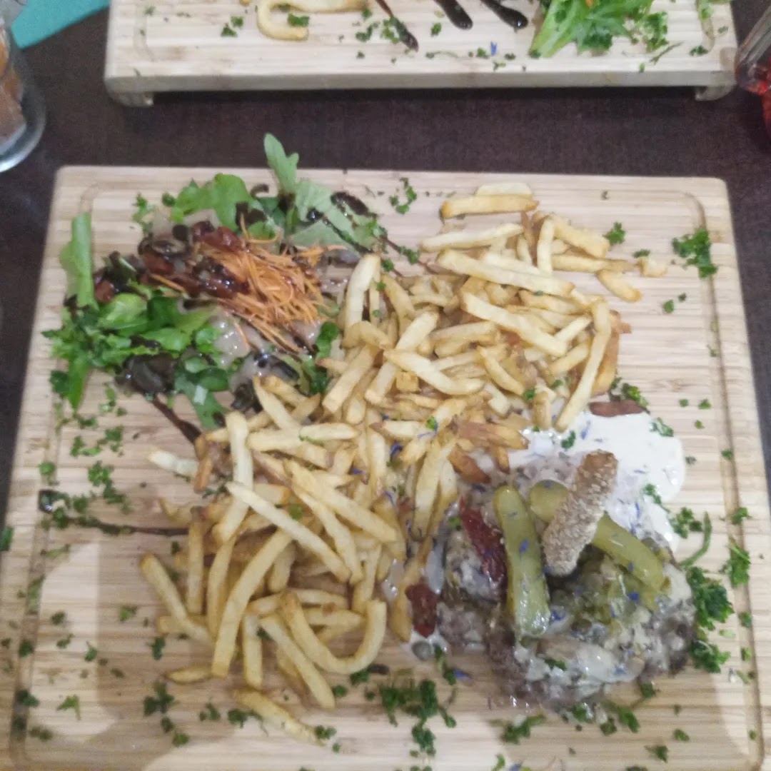 Restaurant de burger et tartares, des grosses salades également. Pas beaucoup de tables à l'intérieur mais il y avait de la place. Cuisine ouverte, sympa pour les voir preparer les plats mais il peut faire très chaud en été. Pas de réservation après la première demi-heure du début de service. Plats entre 15 et 20€, boissons toutes chères à 4€. Burger copieux, bon pain bien moelleux, frites maisons bonnes. Petite salade avec bonne vinaigrette, j'ai beaucoup apprécié, j'en aurait bien mangé quelques feuilles de plus ! L'intérieur du Burger manque de fraîcheur, notamment le Burger végétarien mais l'ensemble est tout de même bon. J'ai aimé le persil sur toute la planche qui rehausse le goût. Service aimable, rapide et efficace.