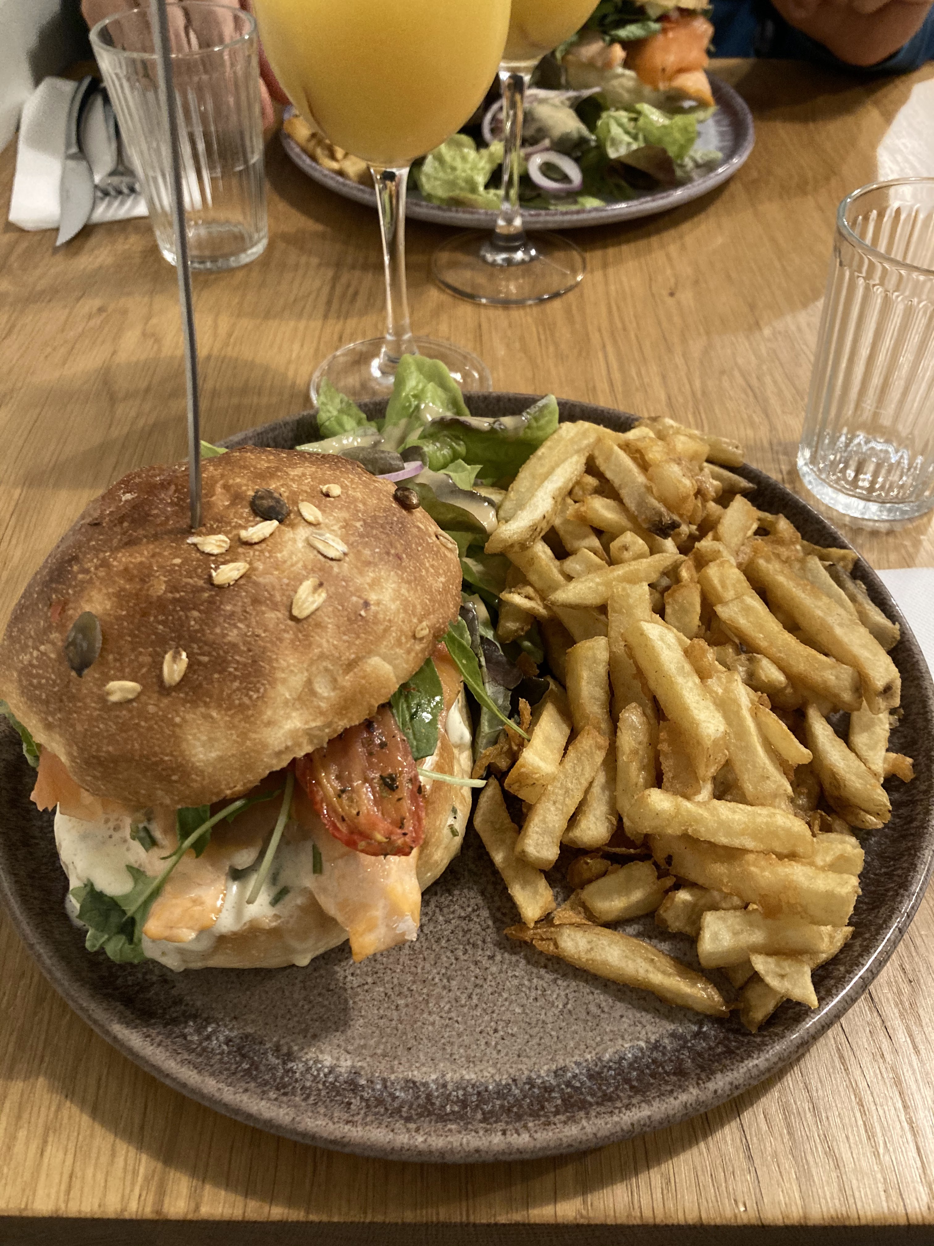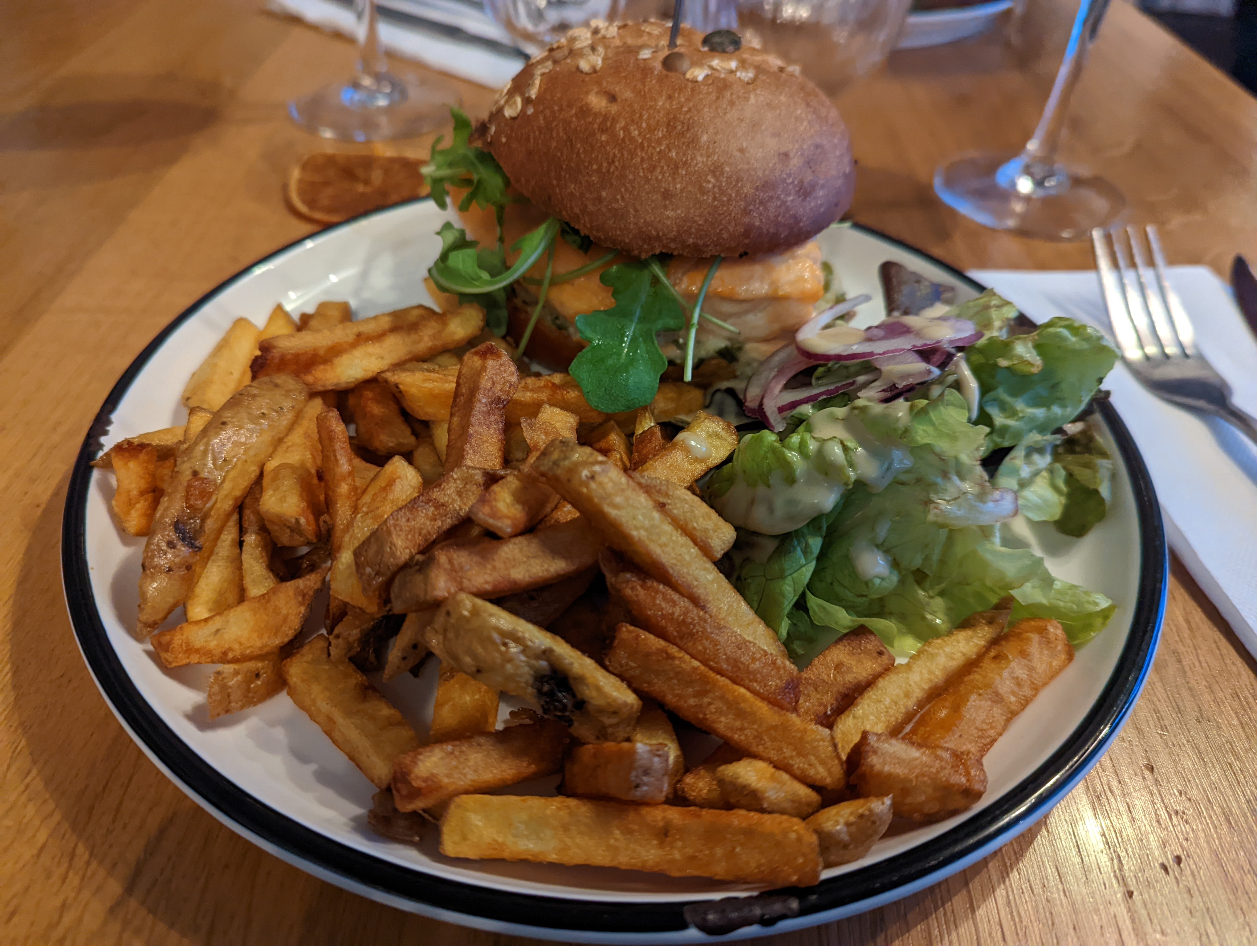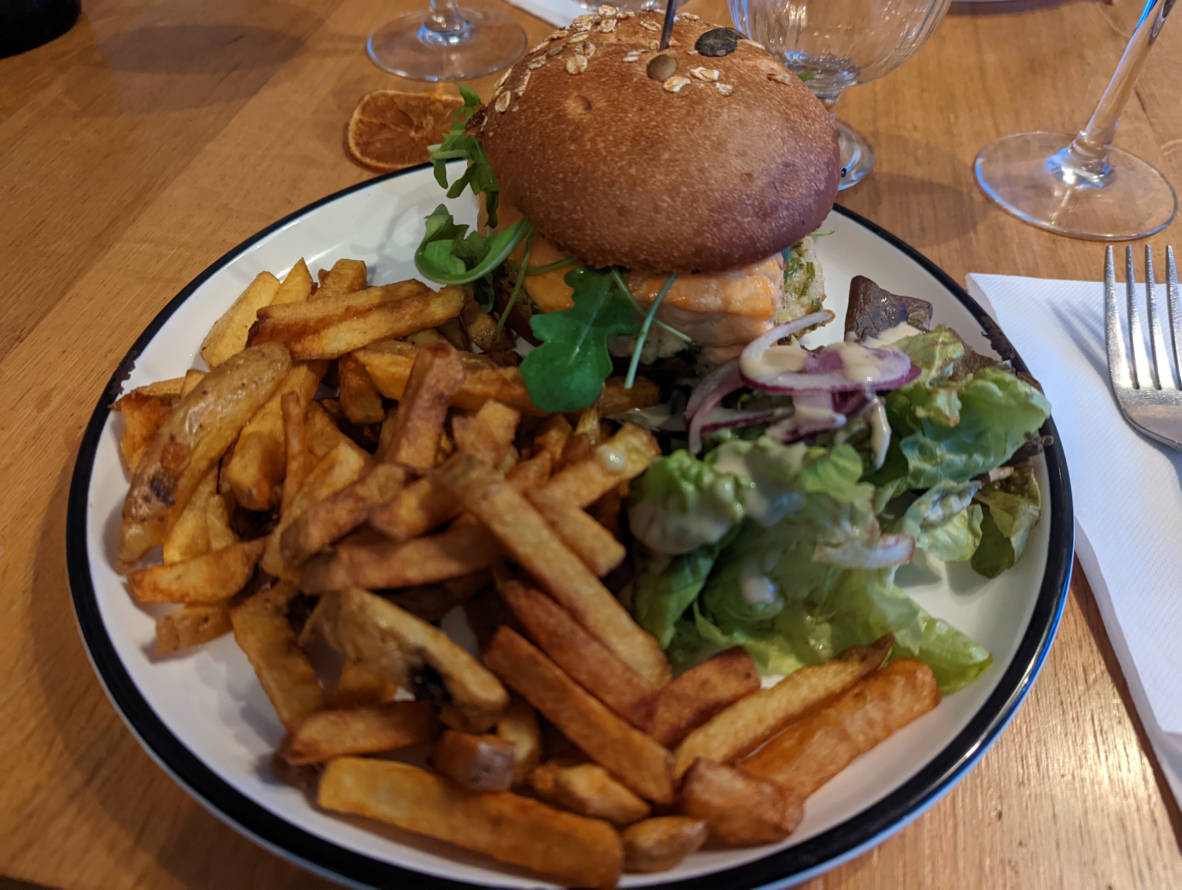 De passage à Dinan , nous avons déjeuné dans ce restaurant. La deco est très réussie ; le personnel est sympathique. Le burger saumon était délicieux tout comme le cheesecake (qui n’était pas trop sucré 👍) .