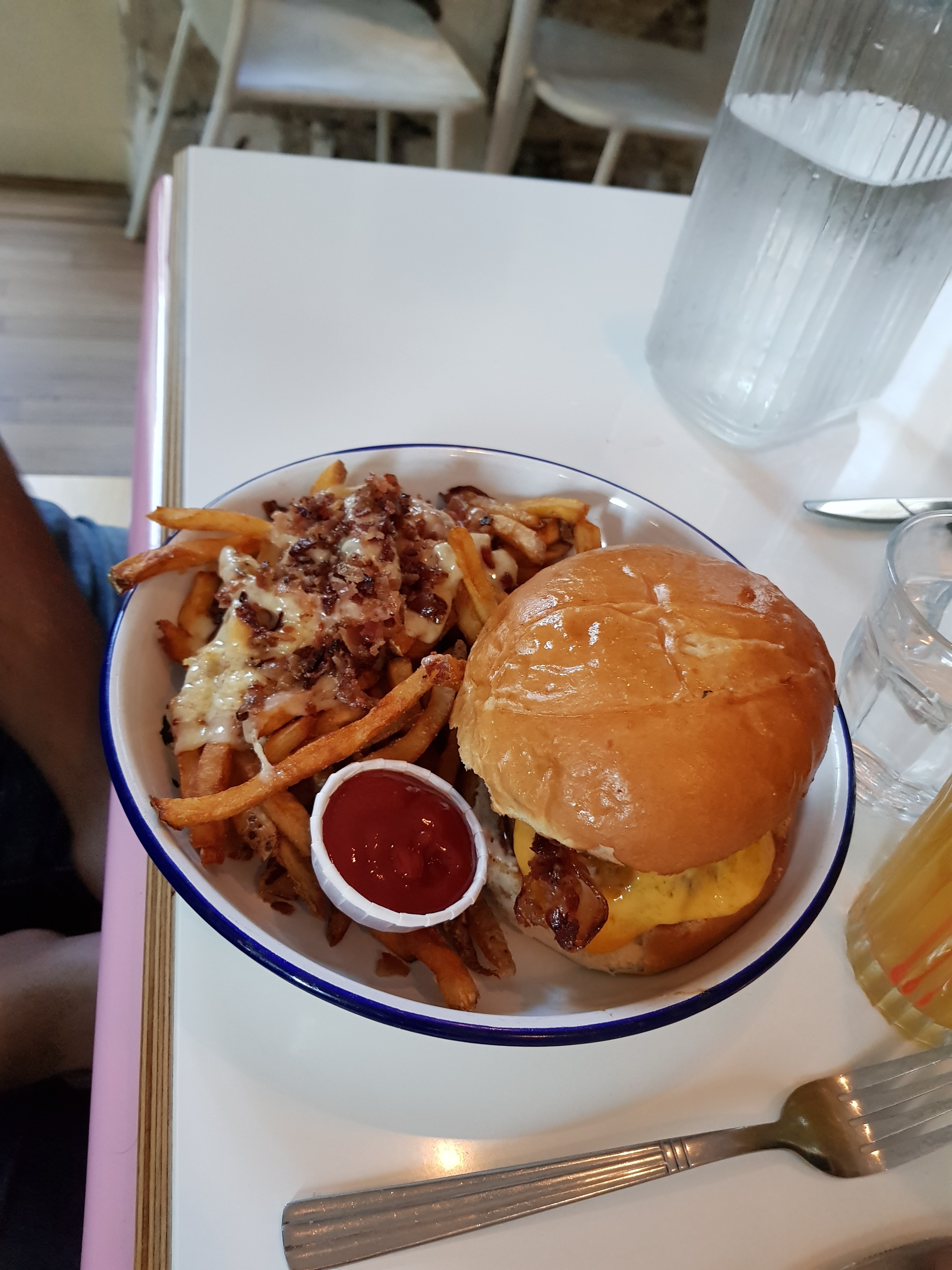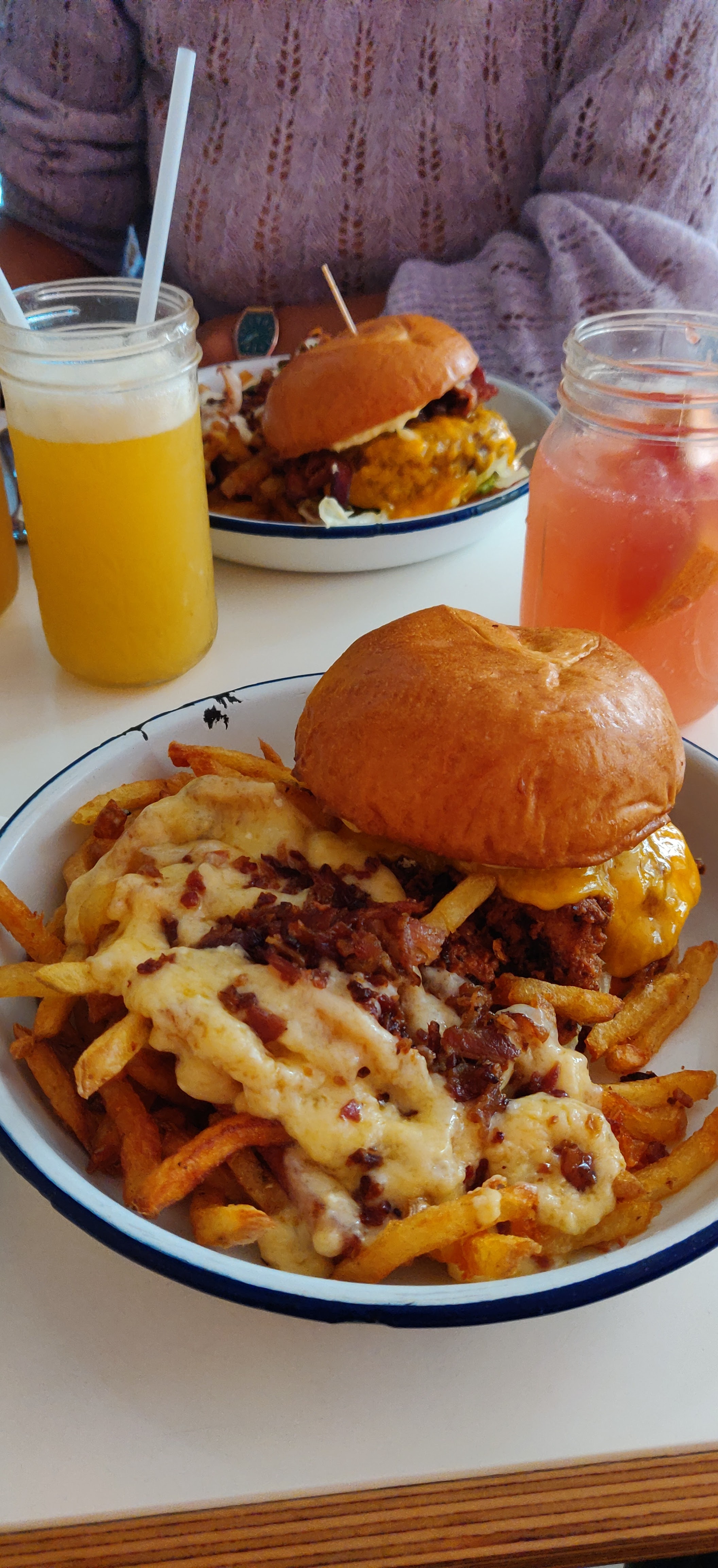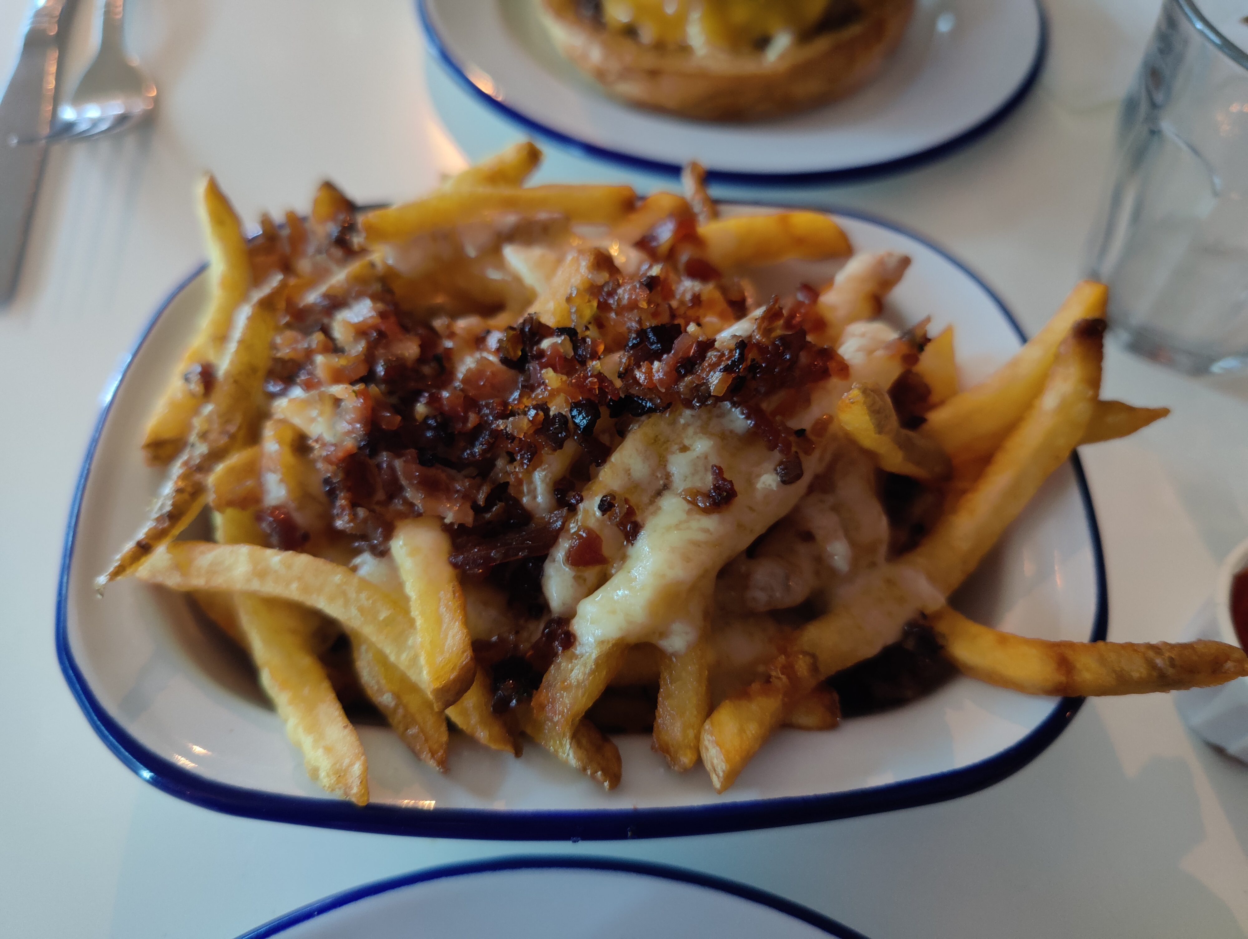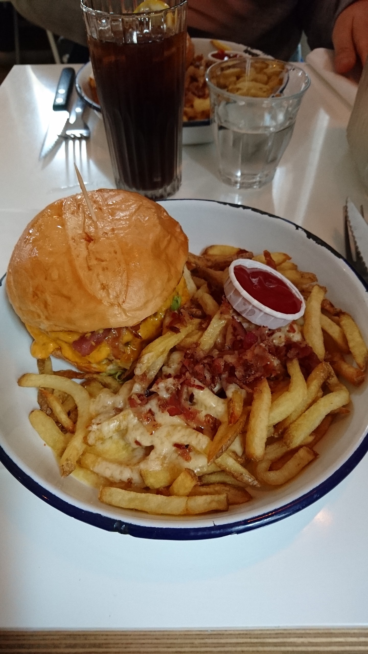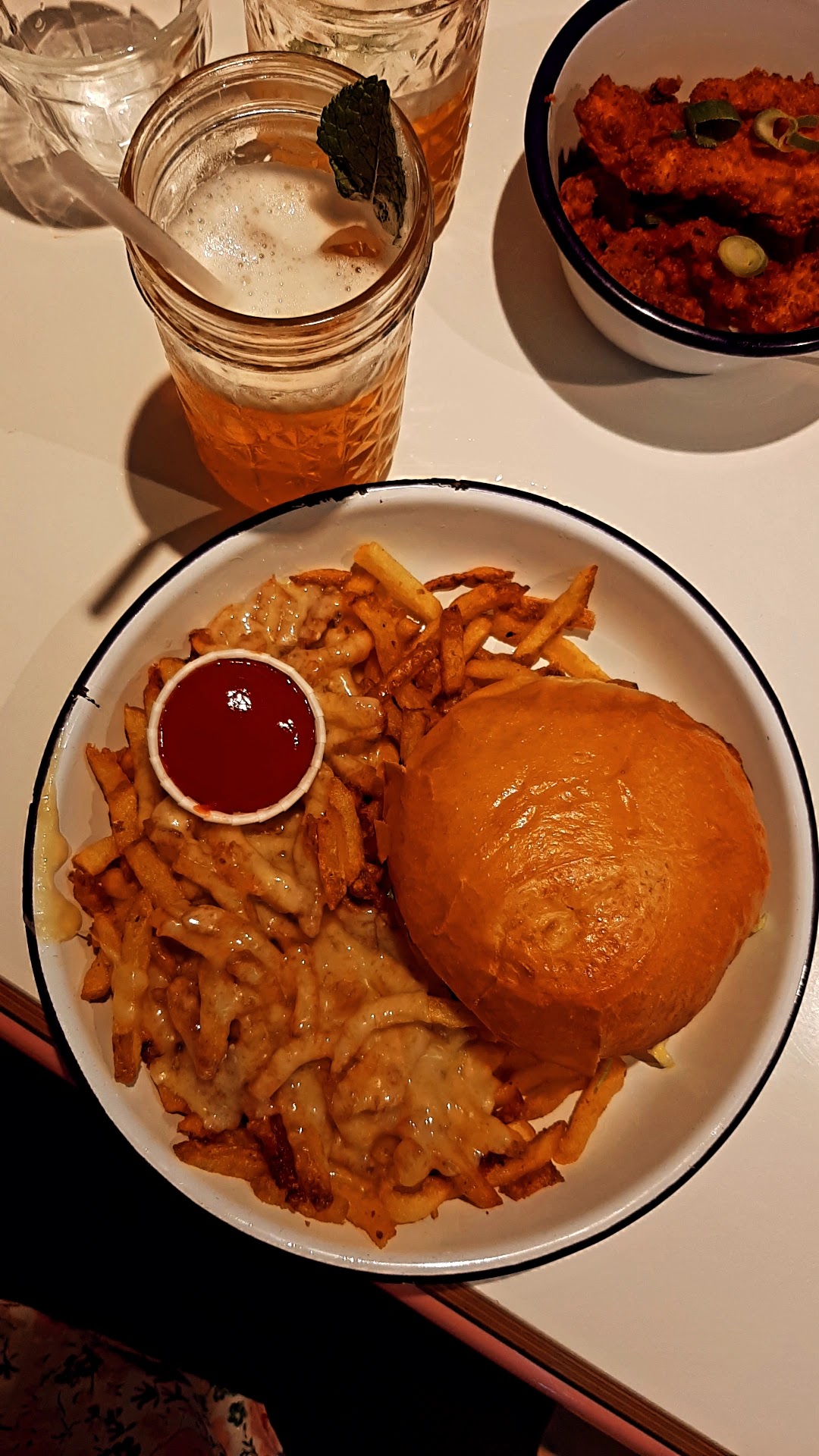 Frites au cheddar un peu écoeurante mais un bon point pour le burger vege qui est pas mal et l'option vegan !