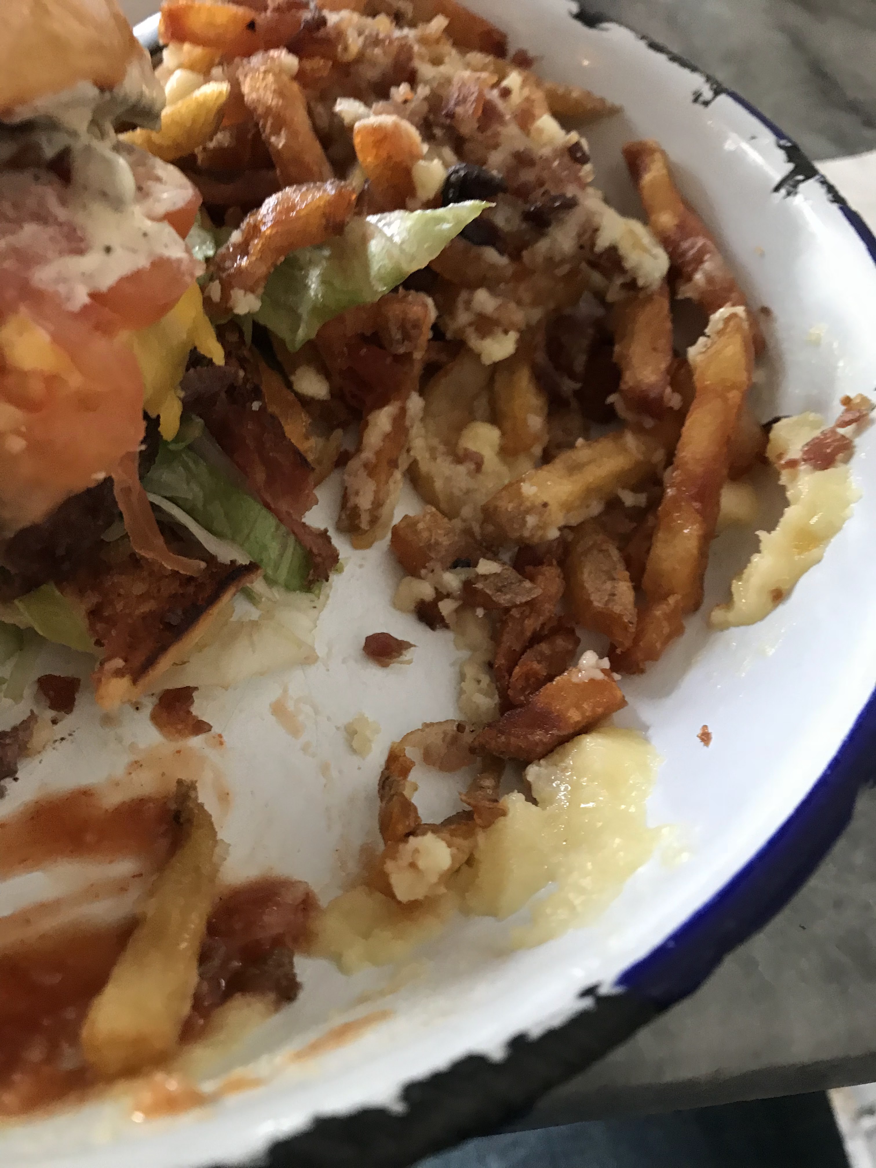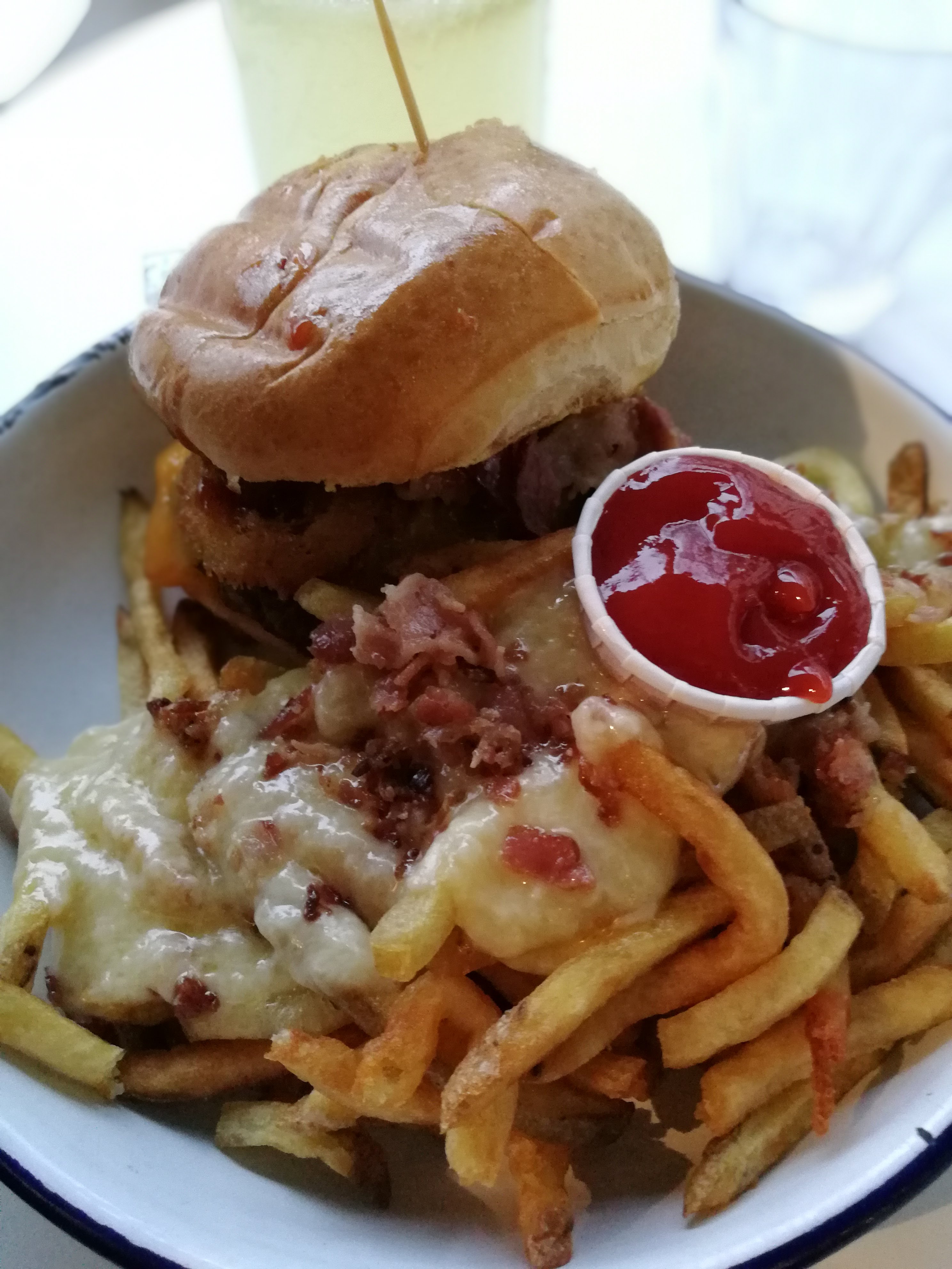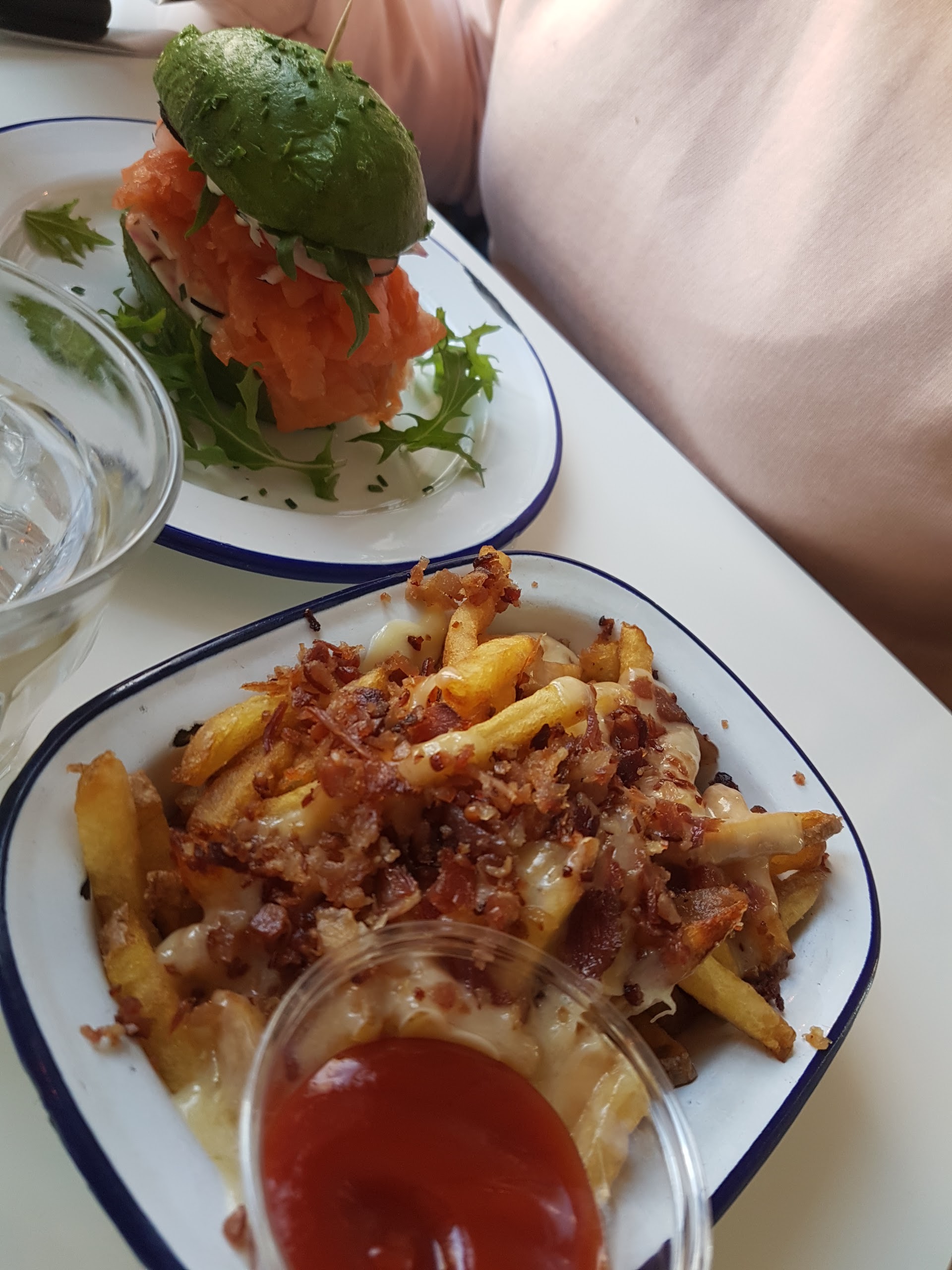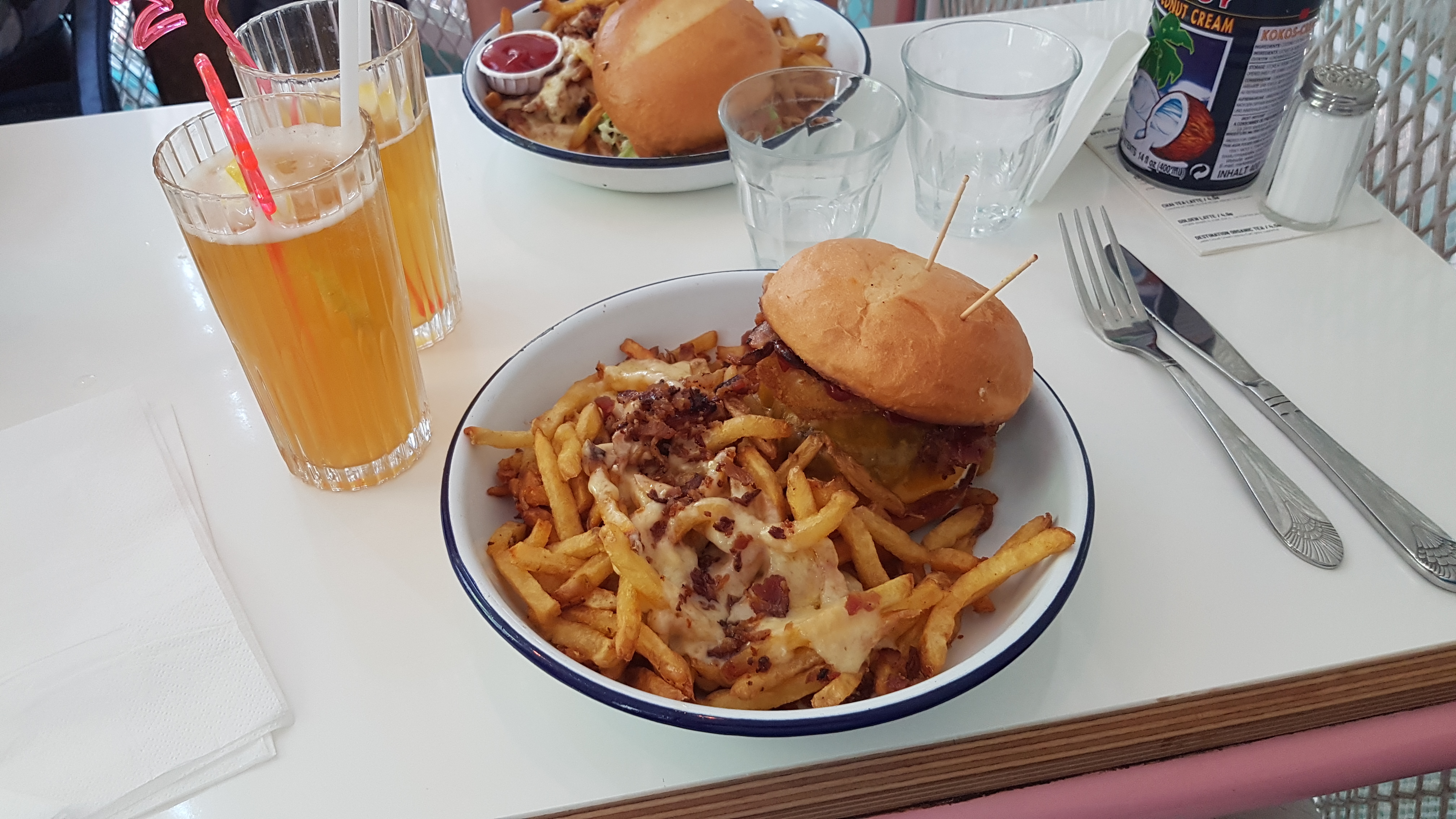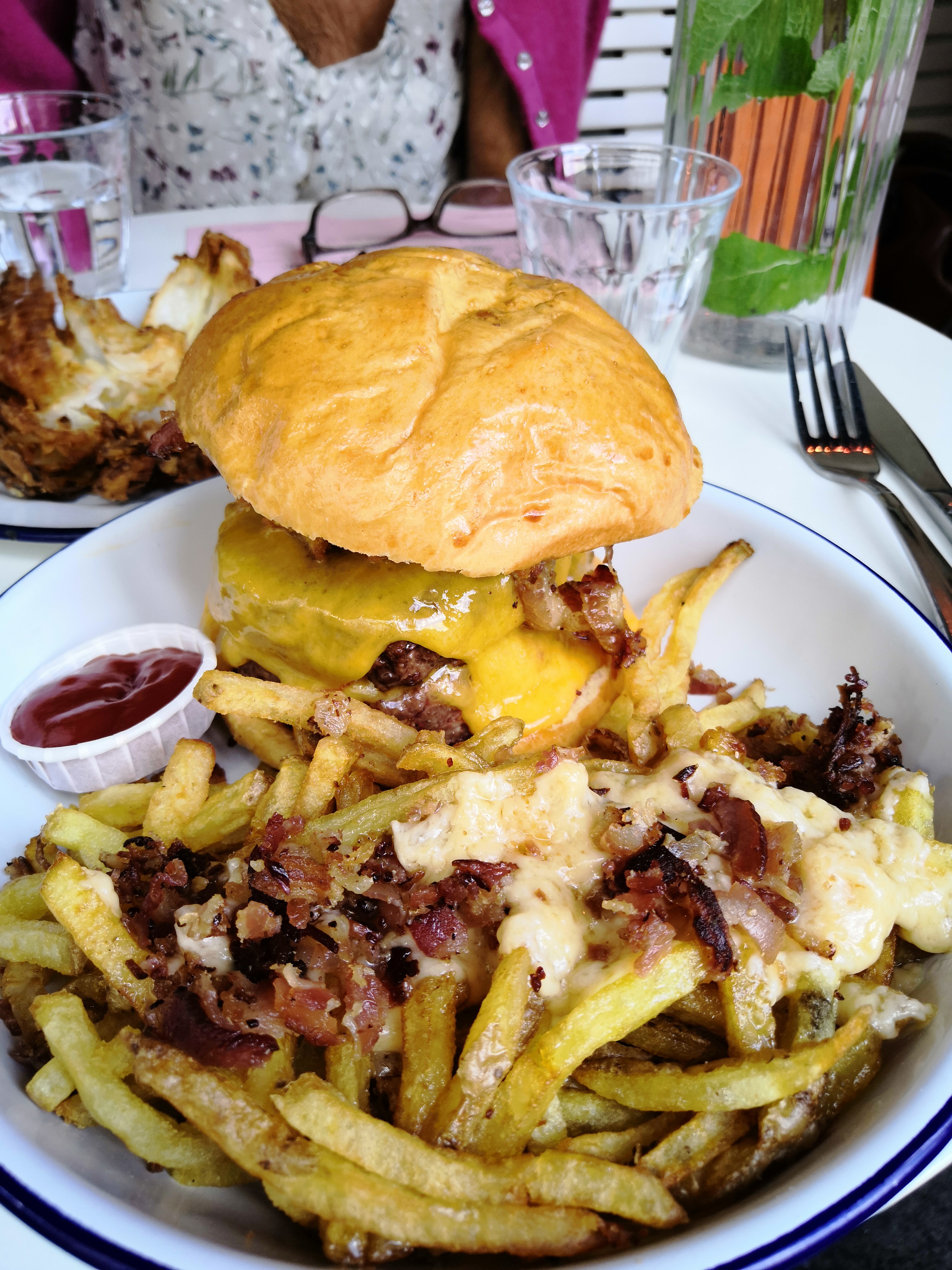 Frites au cheddar un peu écoeurante mais un bon point pour le burger vege qui est pas mal et l'option vegan !