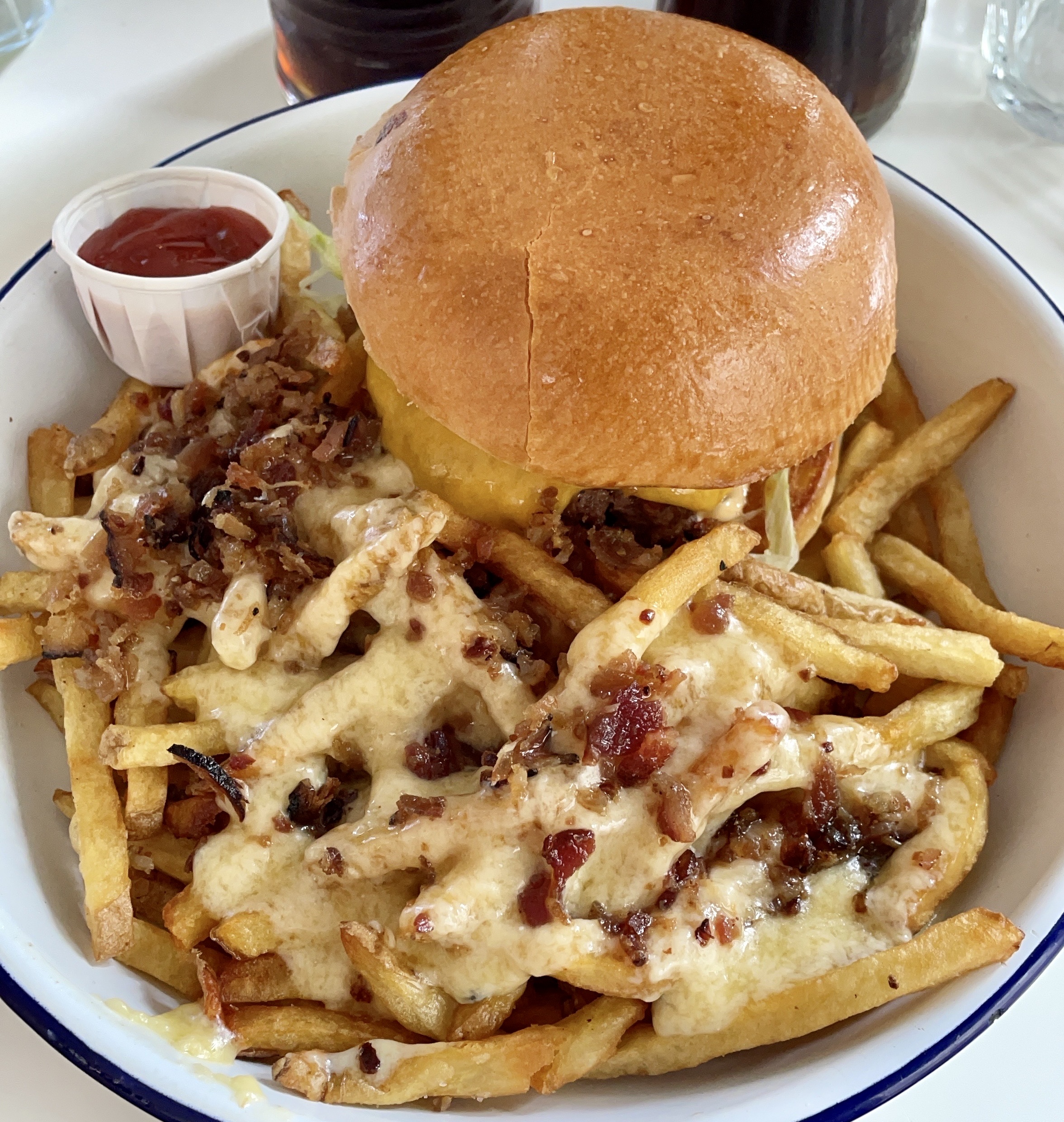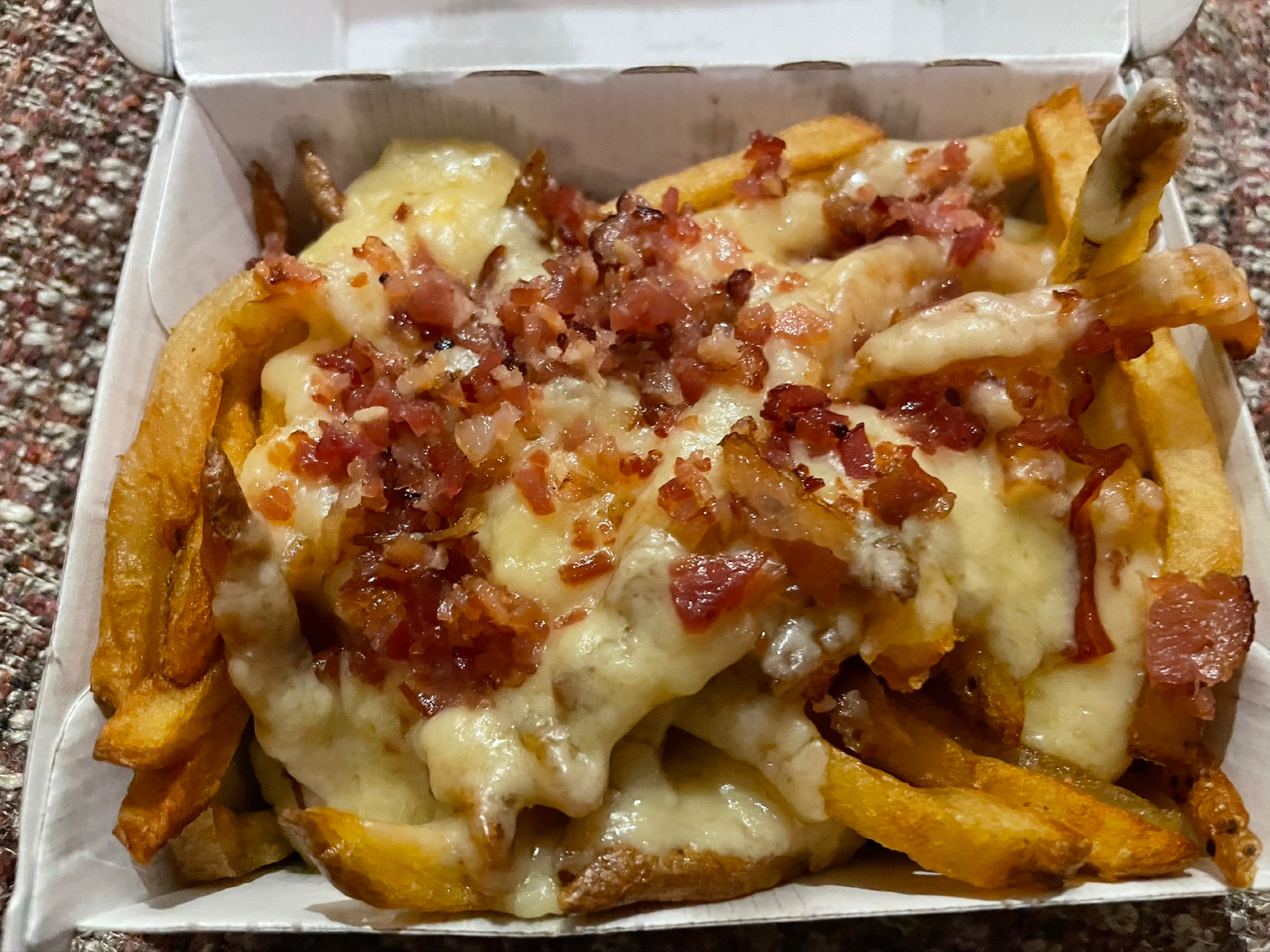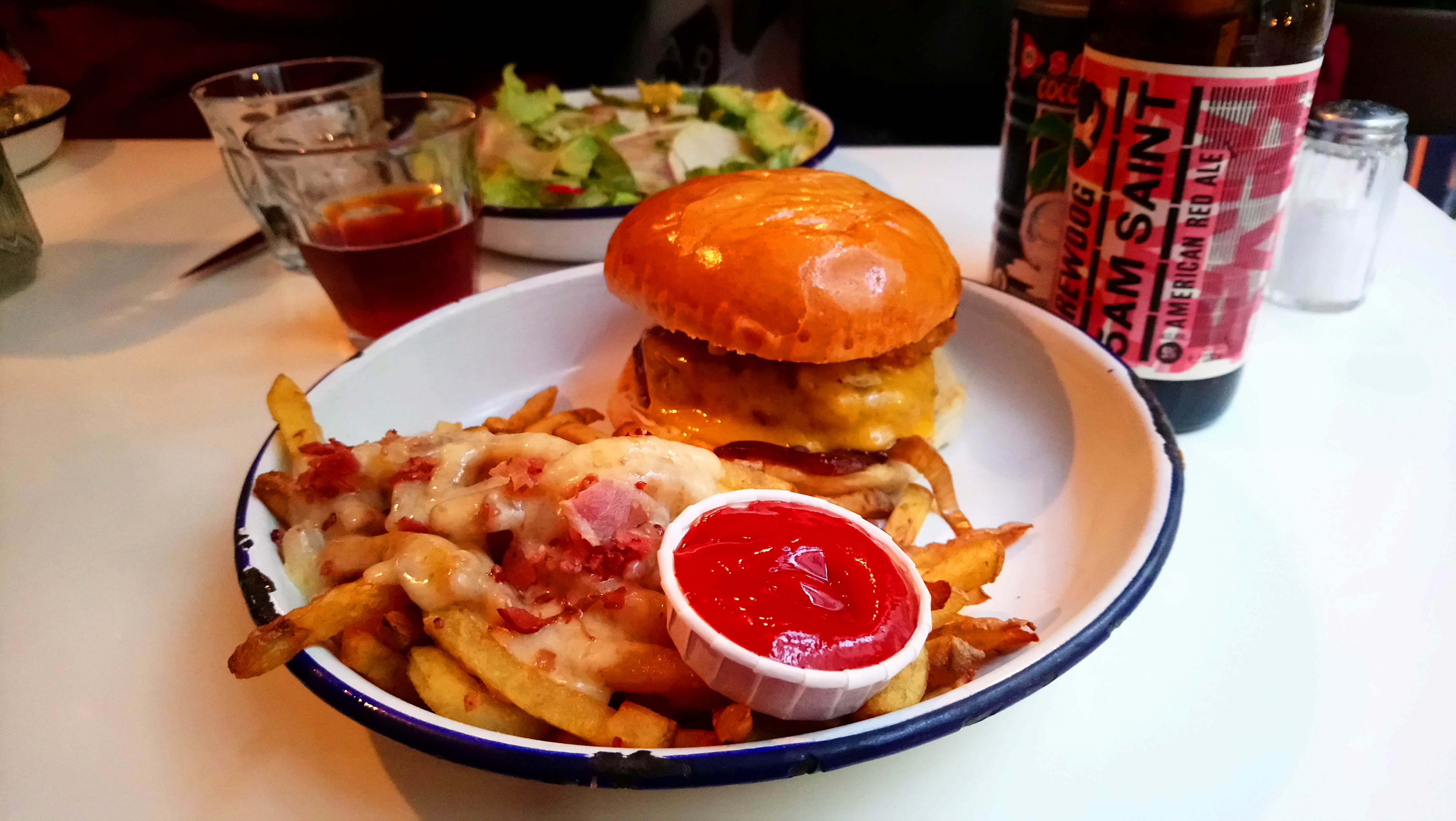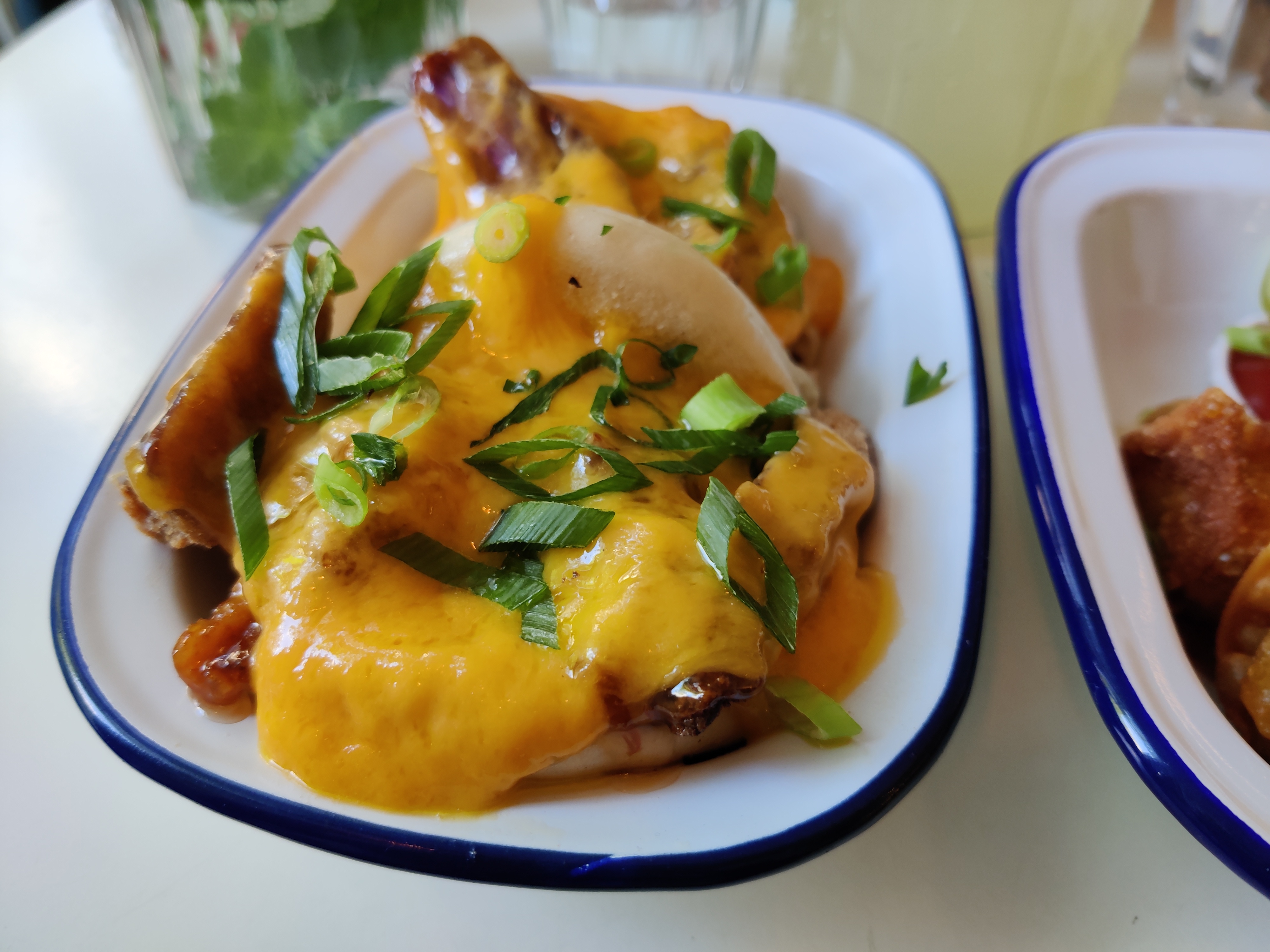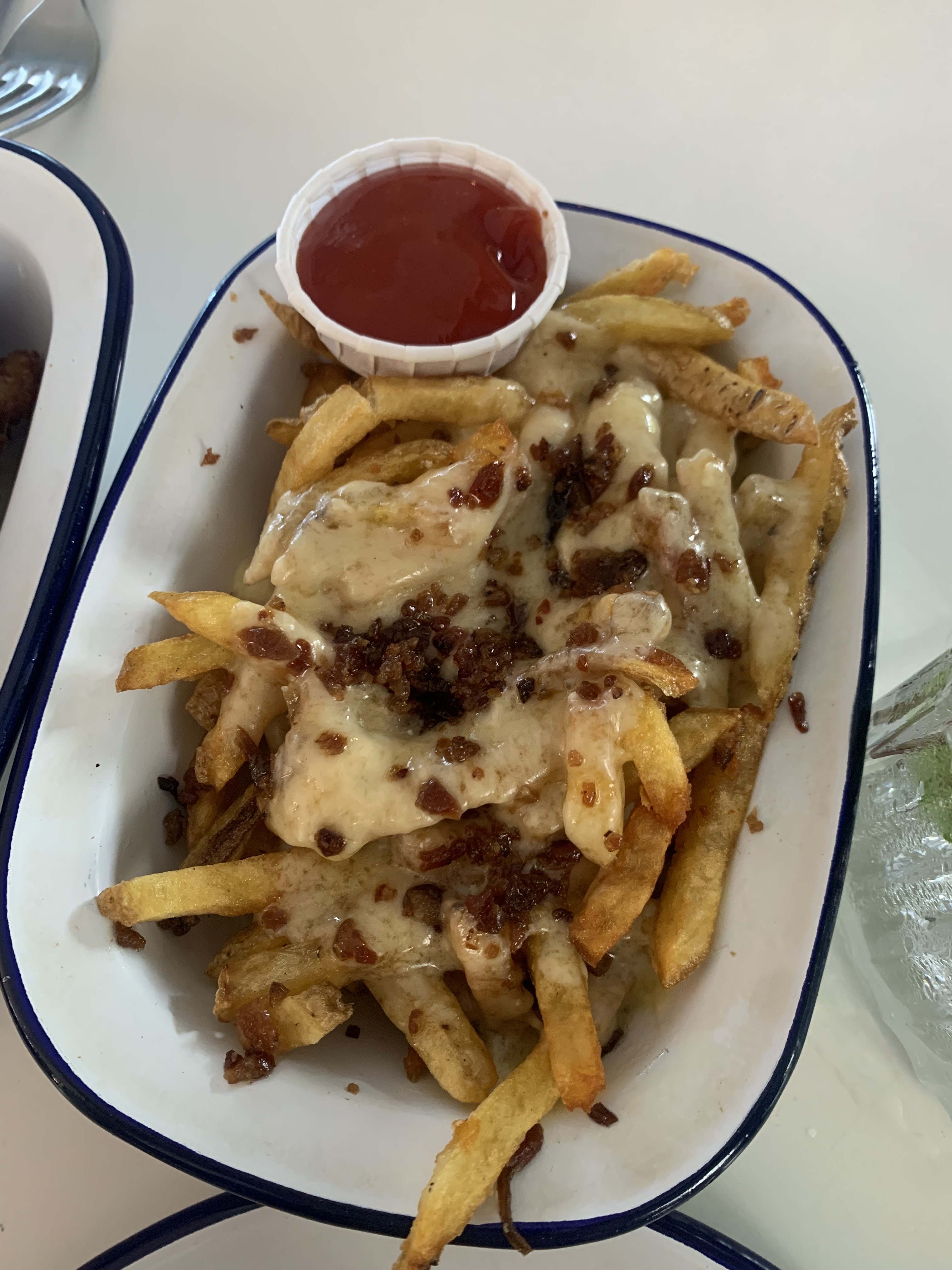 Frites au cheddar un peu écoeurante mais un bon point pour le burger vege qui est pas mal et l'option vegan !