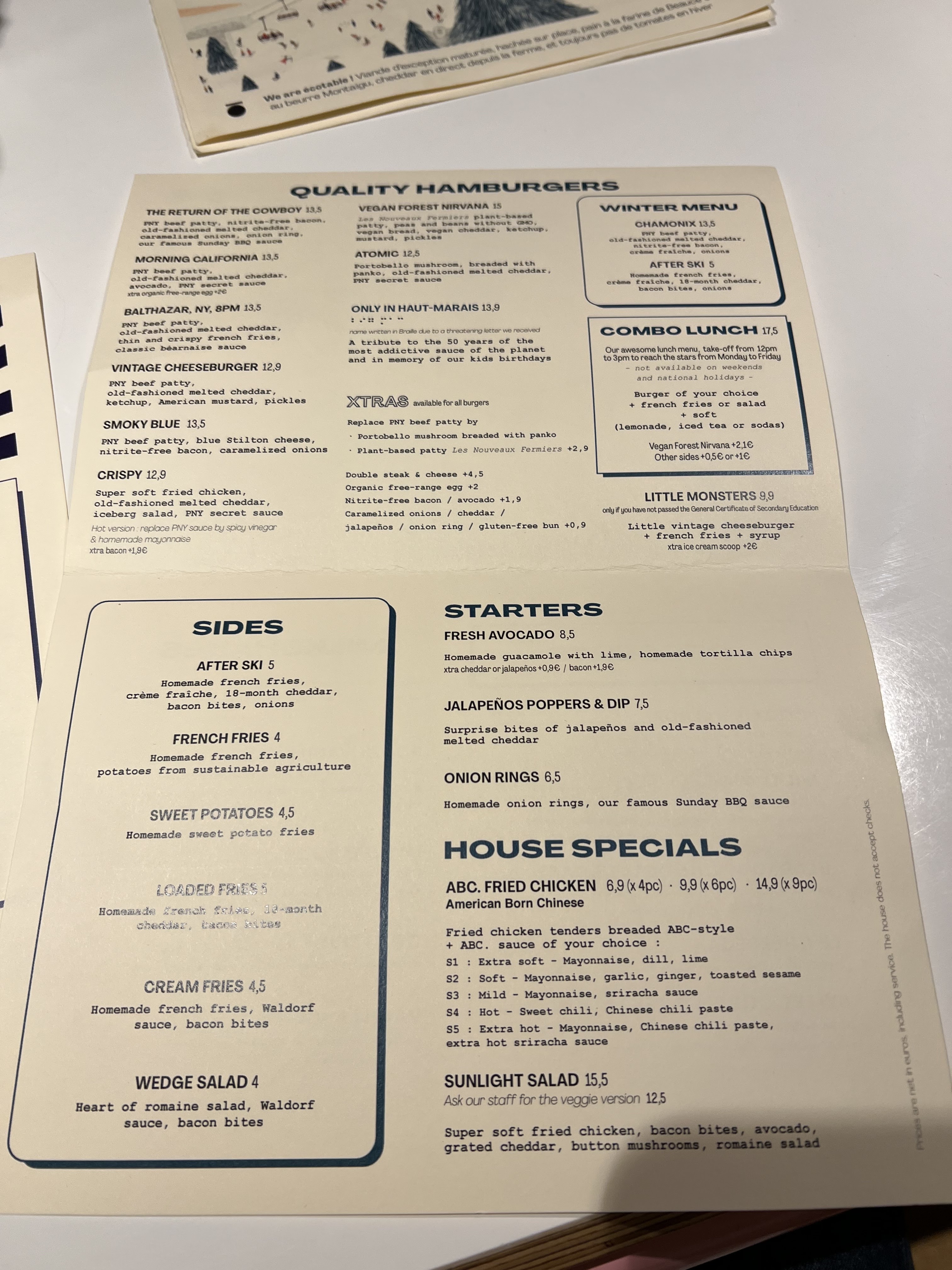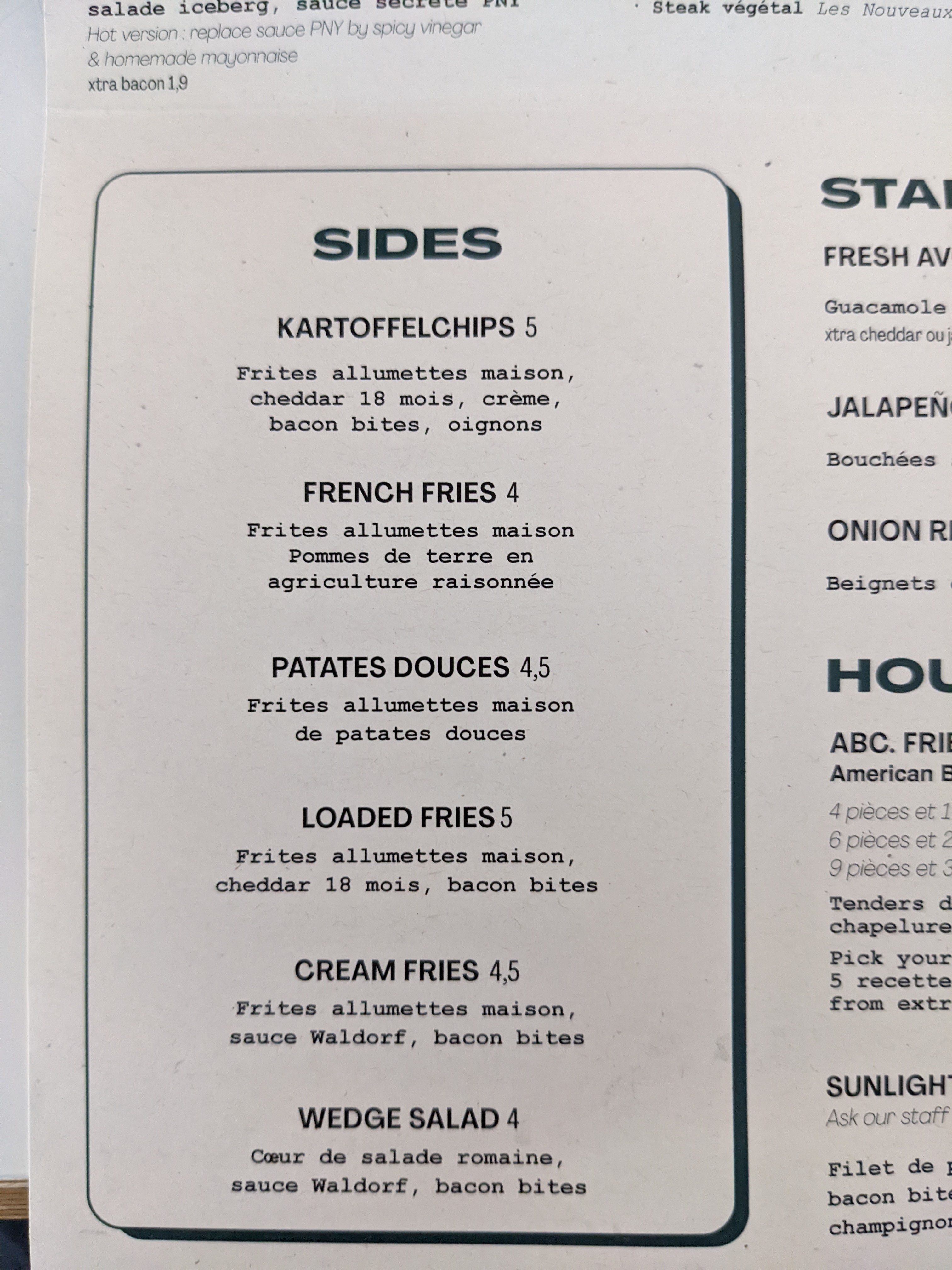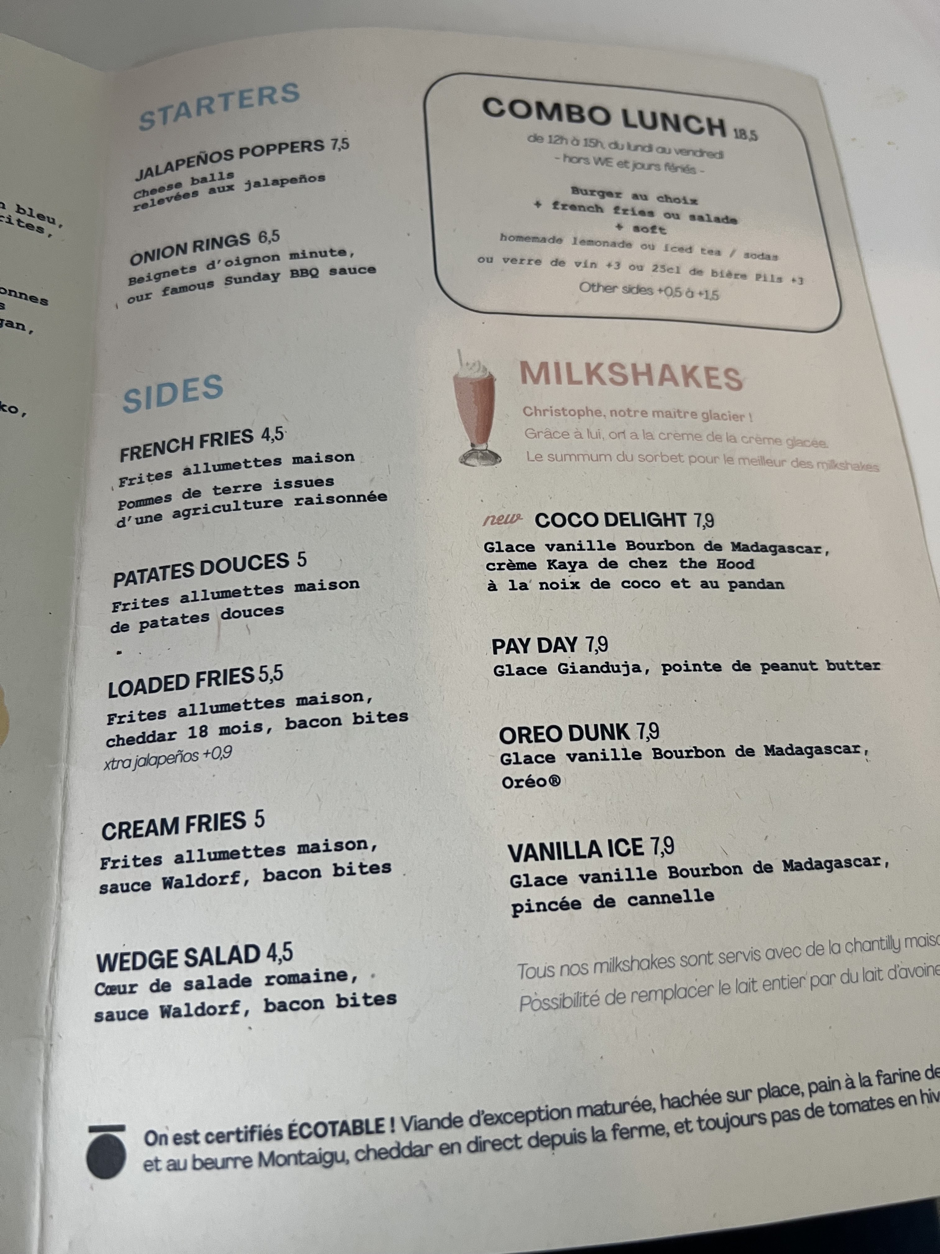 Un peu déçus. Les frites sont très fines du coup on se retrouve parfois avec des petits bouts ultra frits. Les burgers sont bons mais je pense sincèrement que ce ne sont pas les meilleurs de Paris ! Ils manquaient un peu de gourmand, peu de sauce, steak pas vraiment assaisonné. Pour ma part, j'ai pris un hamburger végétarien aux champignons très bon mais un peu sec.
