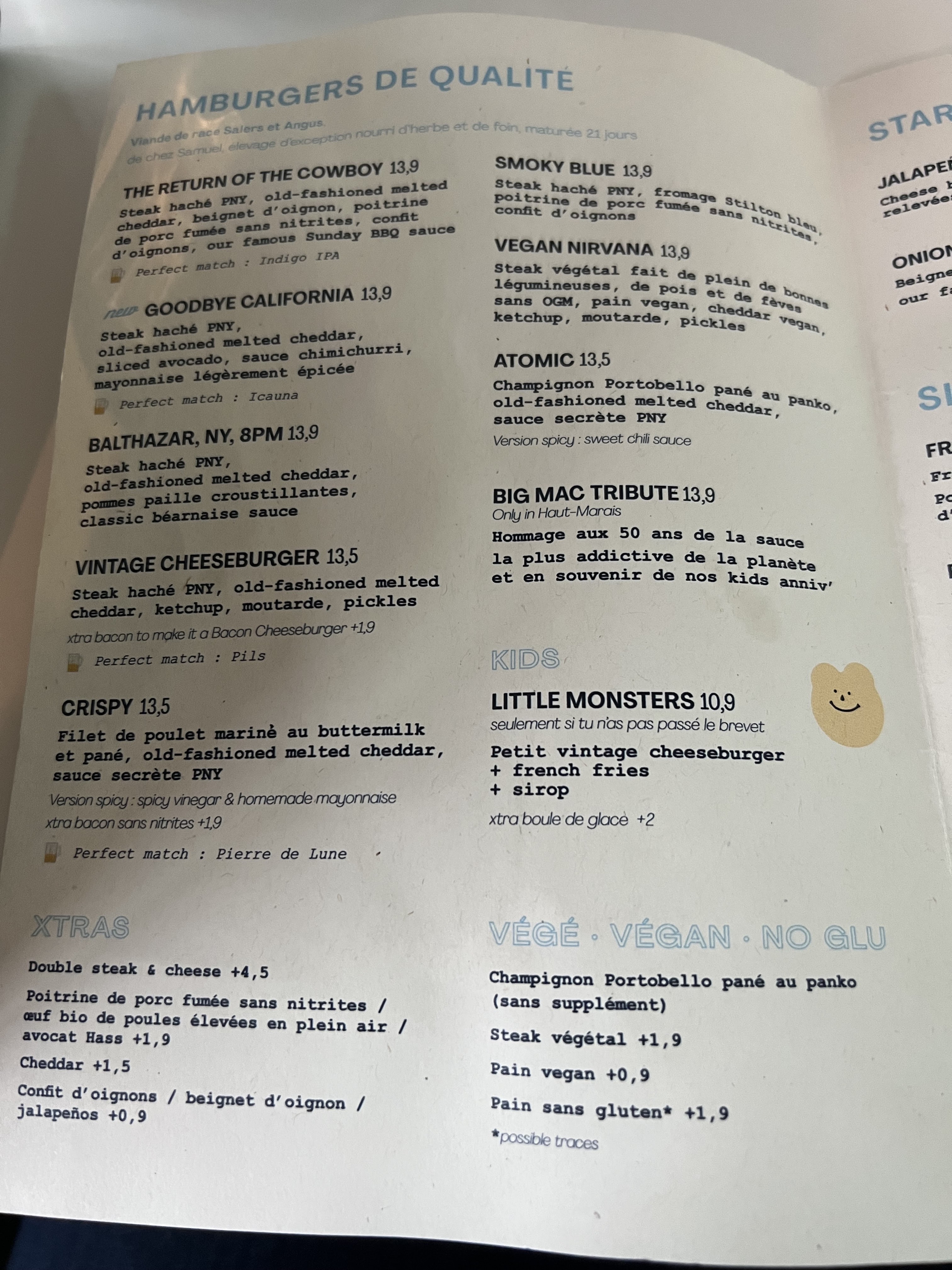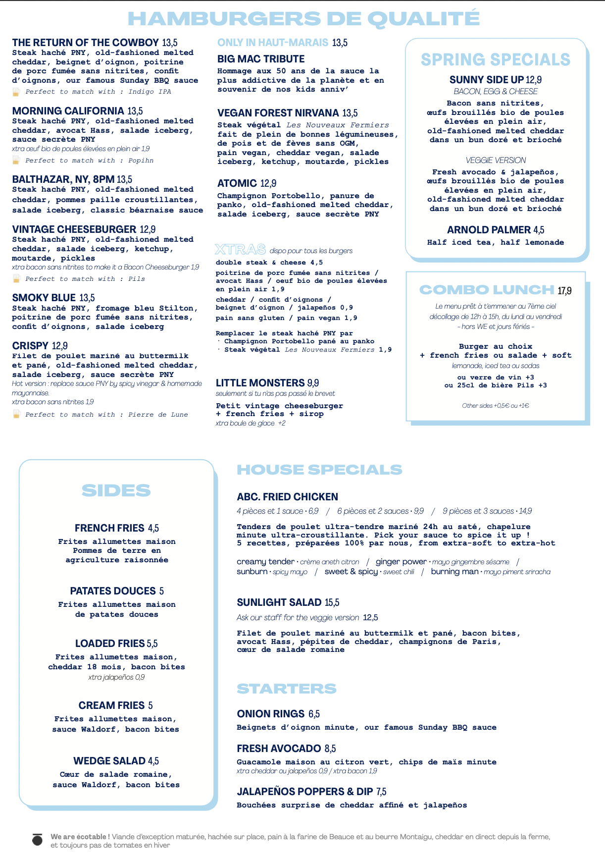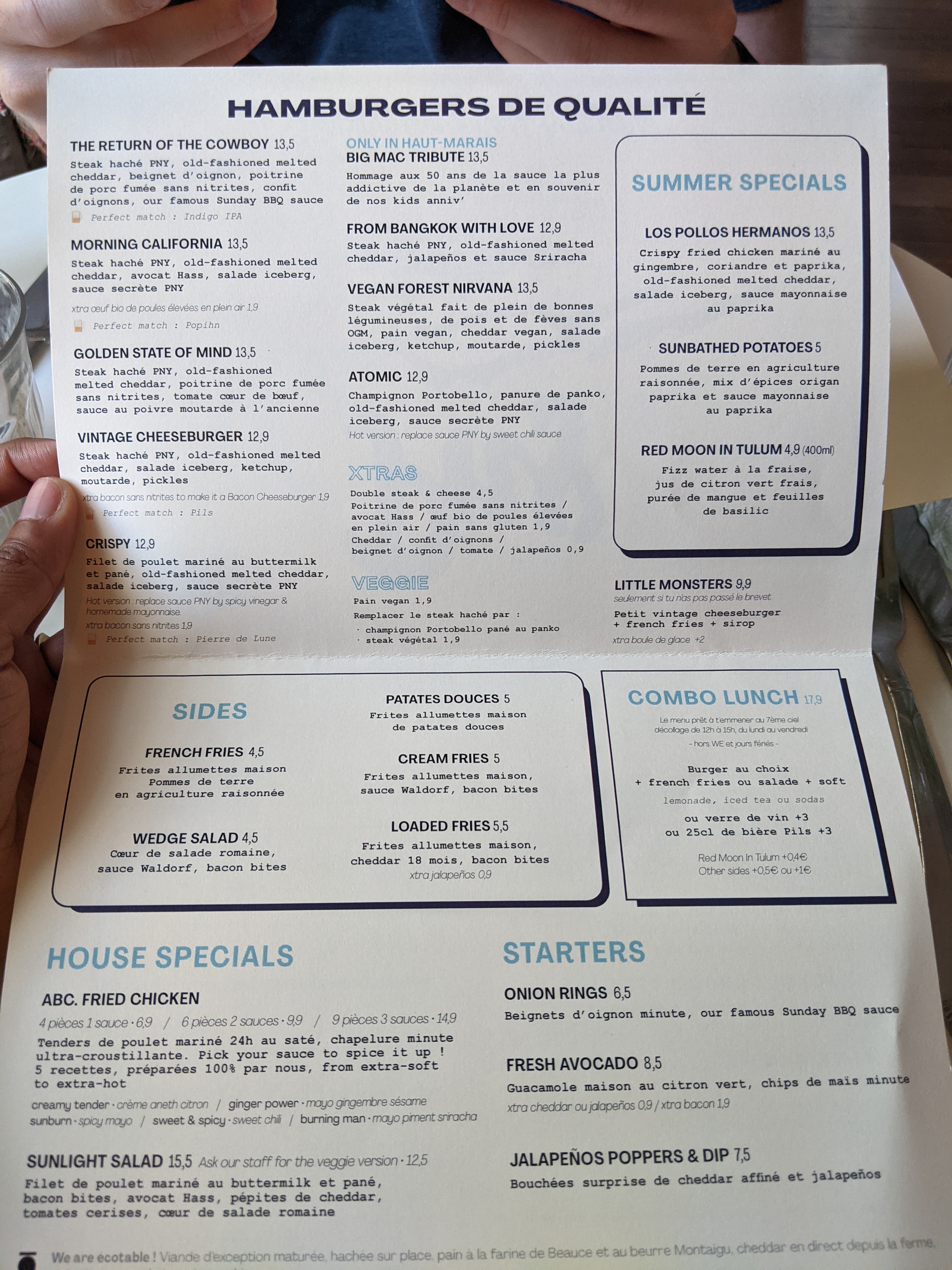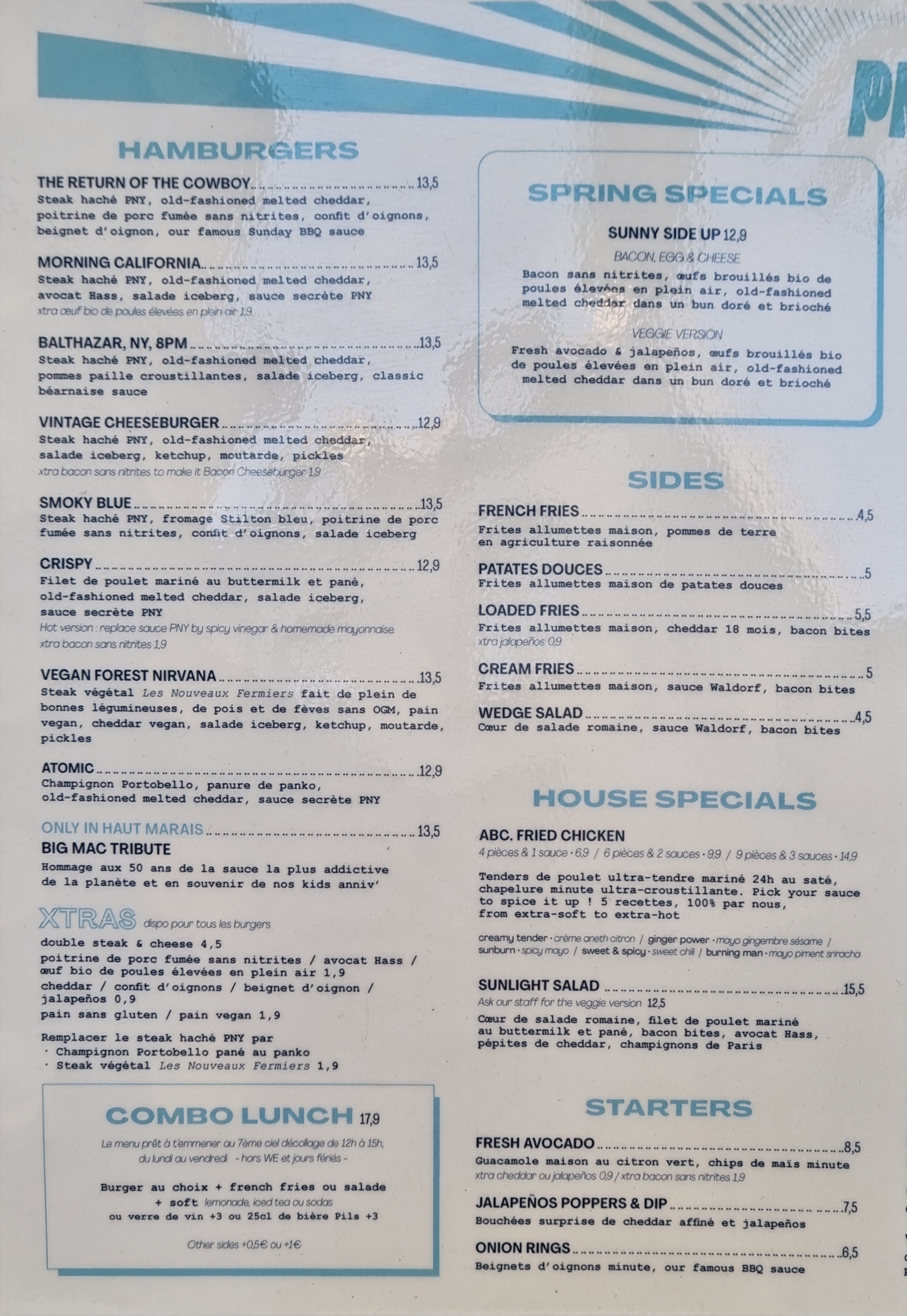 PNY, toujours aussi génial. Que ce soit à Strasbourg Saint Denis, Oberkampf ou au Maris ! Viande excellente, recettes intéressantes et gourmandes. Rien est laissé au hasard dans ce temple de la junk food de luxe, même le café, des brûleries de Belleville.