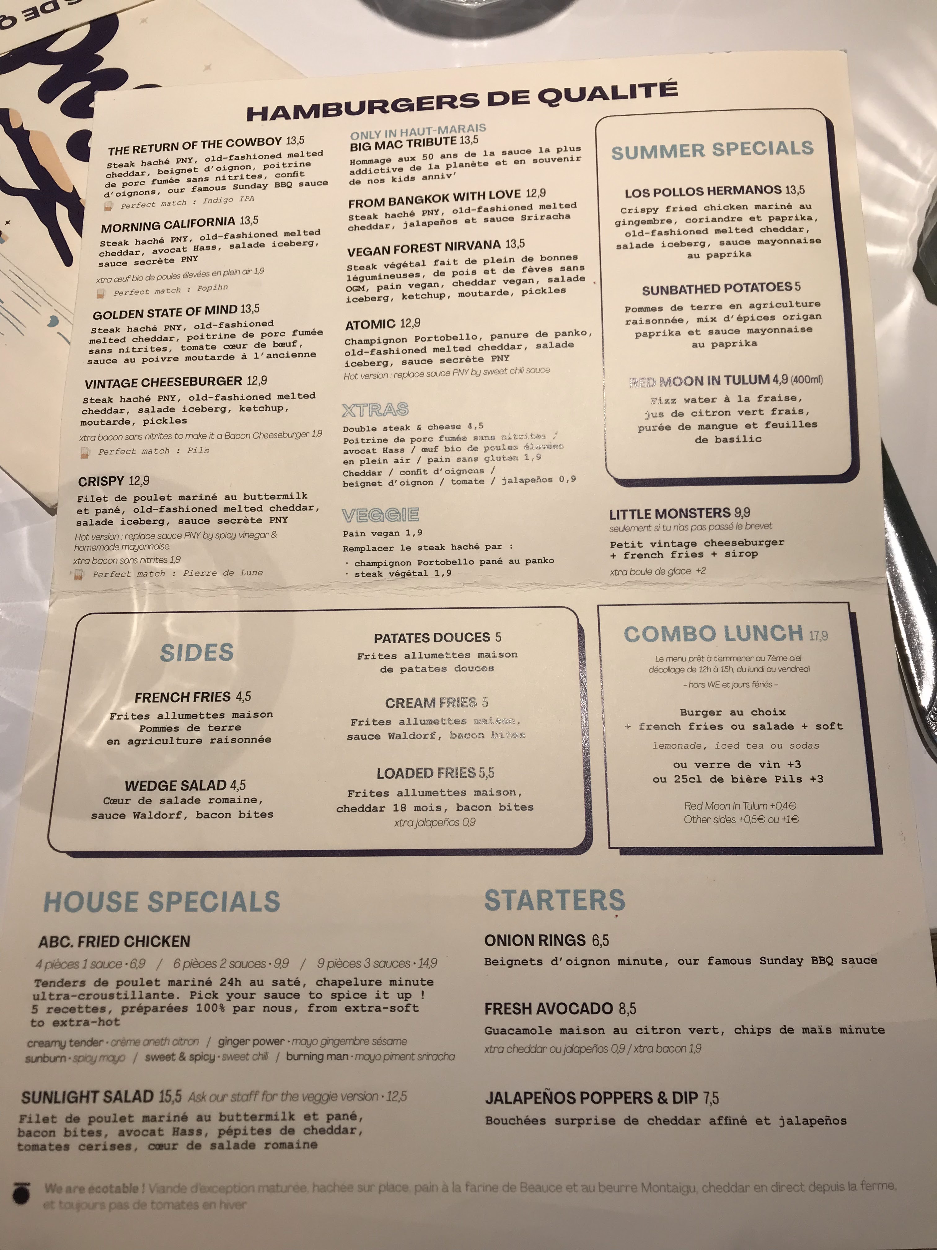 Je n'ai pas compris! C'était l'un de mes burgers favoris quand je venais bosser à paris. Mais ces dernières fois, le serveur était totalement antipathique. Le service à clairement chuté. Dommage Mon ancien commentaire, Top of the beer! Top le the burger. Une petite réserve pour les frites mais en tant que belge Je suis très pointilleux sur la cuisson des frites. Mais l'endroit reste l'un des plus chouette burger bar!