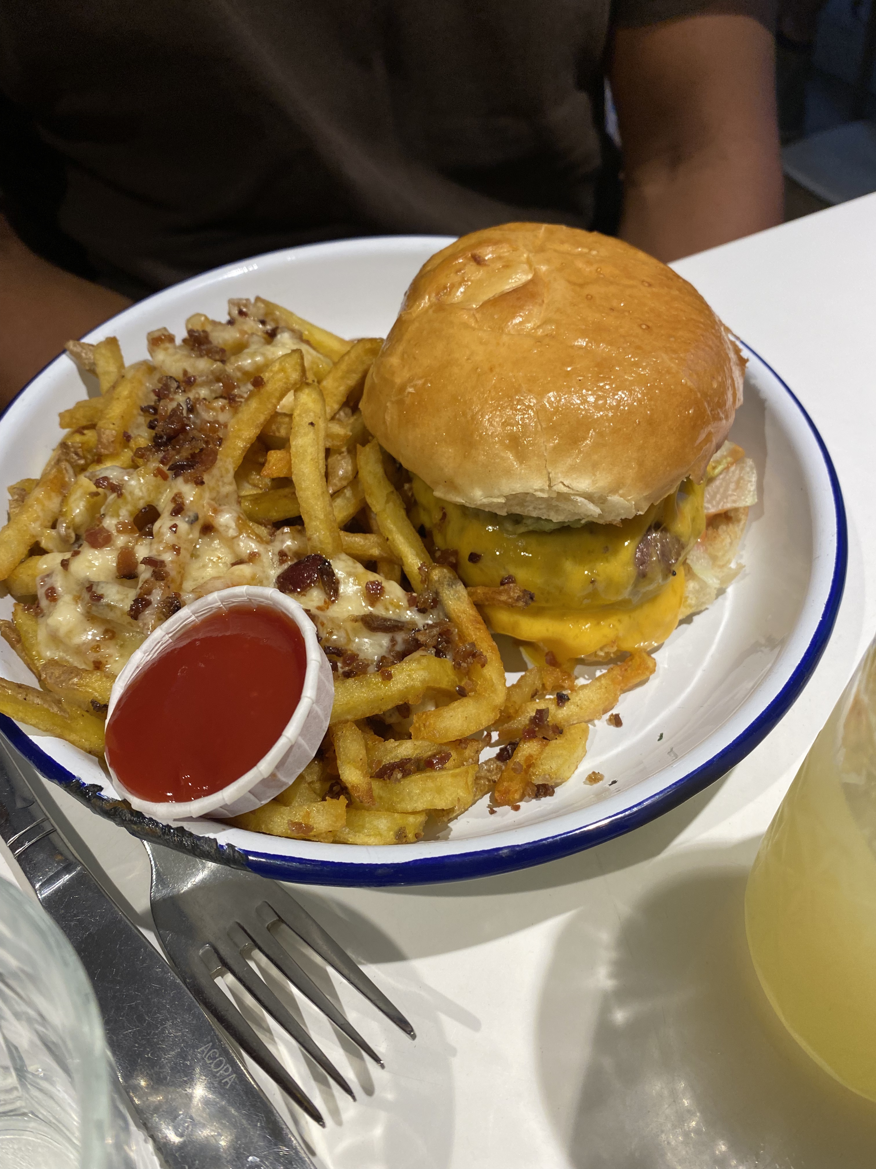 Une expérience toujours satisfaisante ! Je suis allée plusieurs fois, et je dois dire qu’elle ne déçoit jamais. Je commande toujours la même chose: la Goodbye California, qui est une vraie réussite. Ses saveurs complexes, comme leur version fraîche du chimichurri et l’avocat, se marient à la perfection. Cela dit, ils proposent aussi des variantes aux goûts plus classiques, qui sont tout aussi excellentes. Les frites sont idéales : coupées finement, ce qui leur donne une texture parfaite. Les frites de patate douce et les loaded fries sont également un régal et des portions plutôt généreuses. Le service est correct, même si pas exceptionnel. Pour les desserts, qui étaient pourtant déjà préparés, l’attente a été un peu longue. Cependant, le personnel reste globalement aimable, et on comprend qu’ils puissent être débordés, car le lieu est presque toujours plein. C’est vrai que ce n’est pas l’option la plus économique, surtout parce qu’ils ne proposent pas de formules et pour les desserts. Par exemple, le Blackout Chocolate Cake était très bon en termes de goût, mais la texture ressemblait moins à celle d’un gâteau classique. Peut-être serait-il mieux servi chaud ? En revanche, le crumble aux pommes est tout simplement spectaculaire, servi chaud avec une boule de glace. Une adresse que je recommande pour un repas savoureux et consistant !