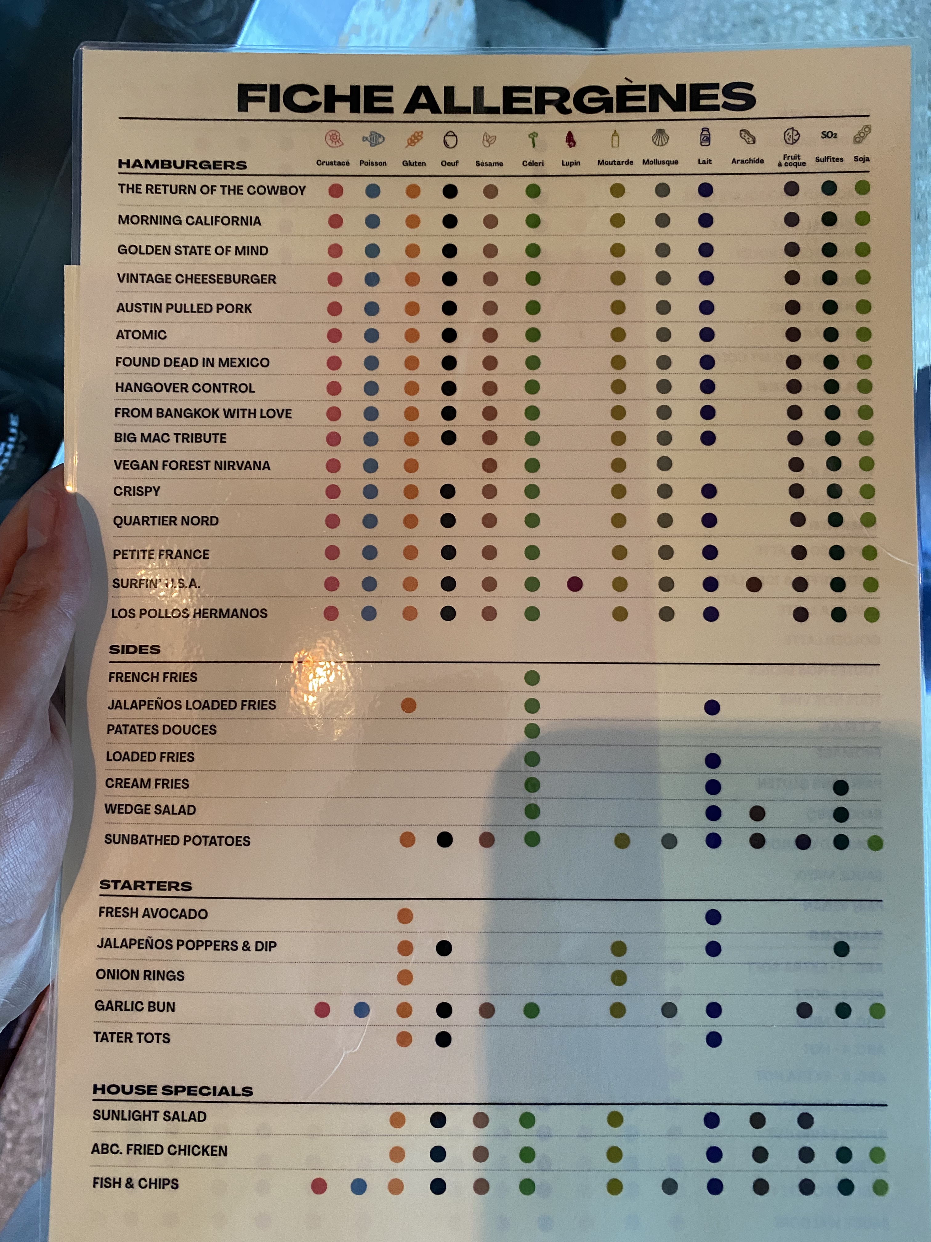 pas apte pour des personnes allergiques au gluten ou cœliaques, il y a du pain sans gluten mais les burgers ont des traces et les frites ne sont pas sans gluten. Ils préviennent