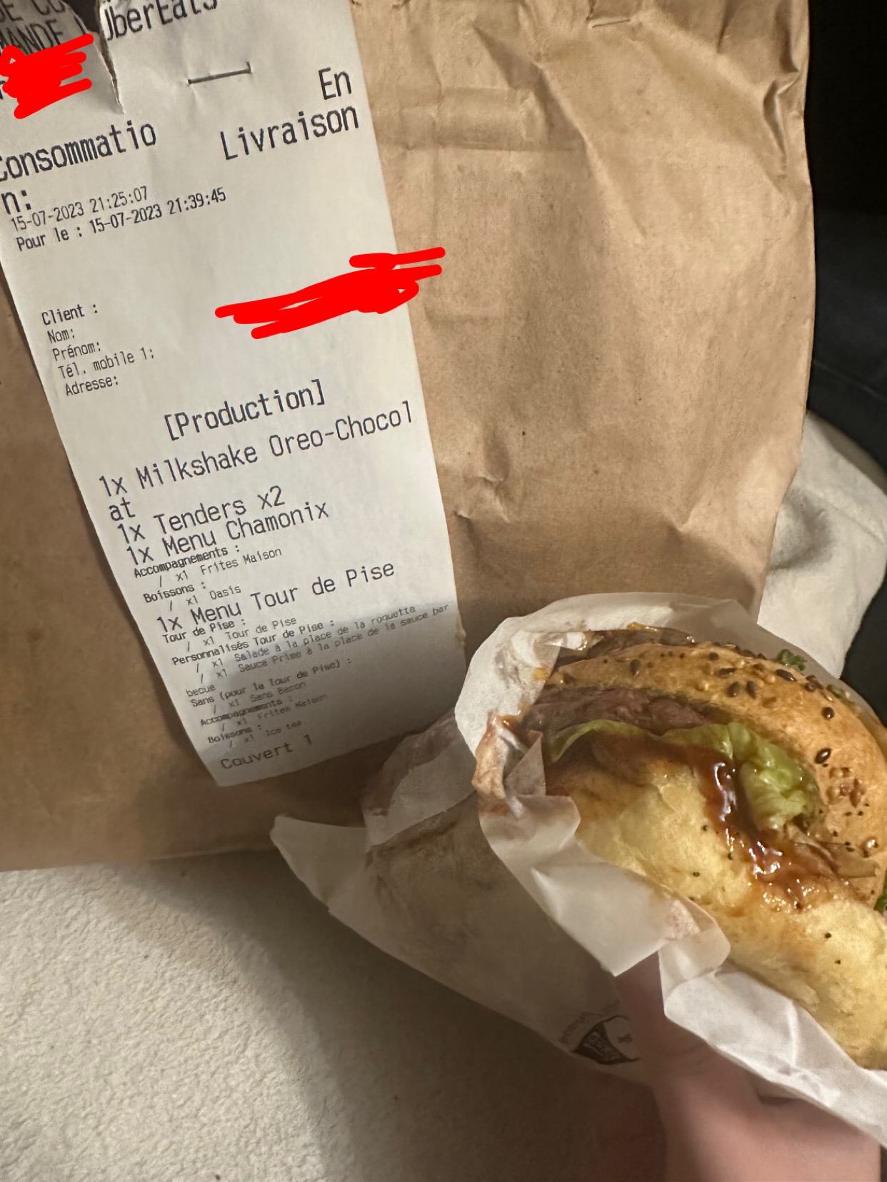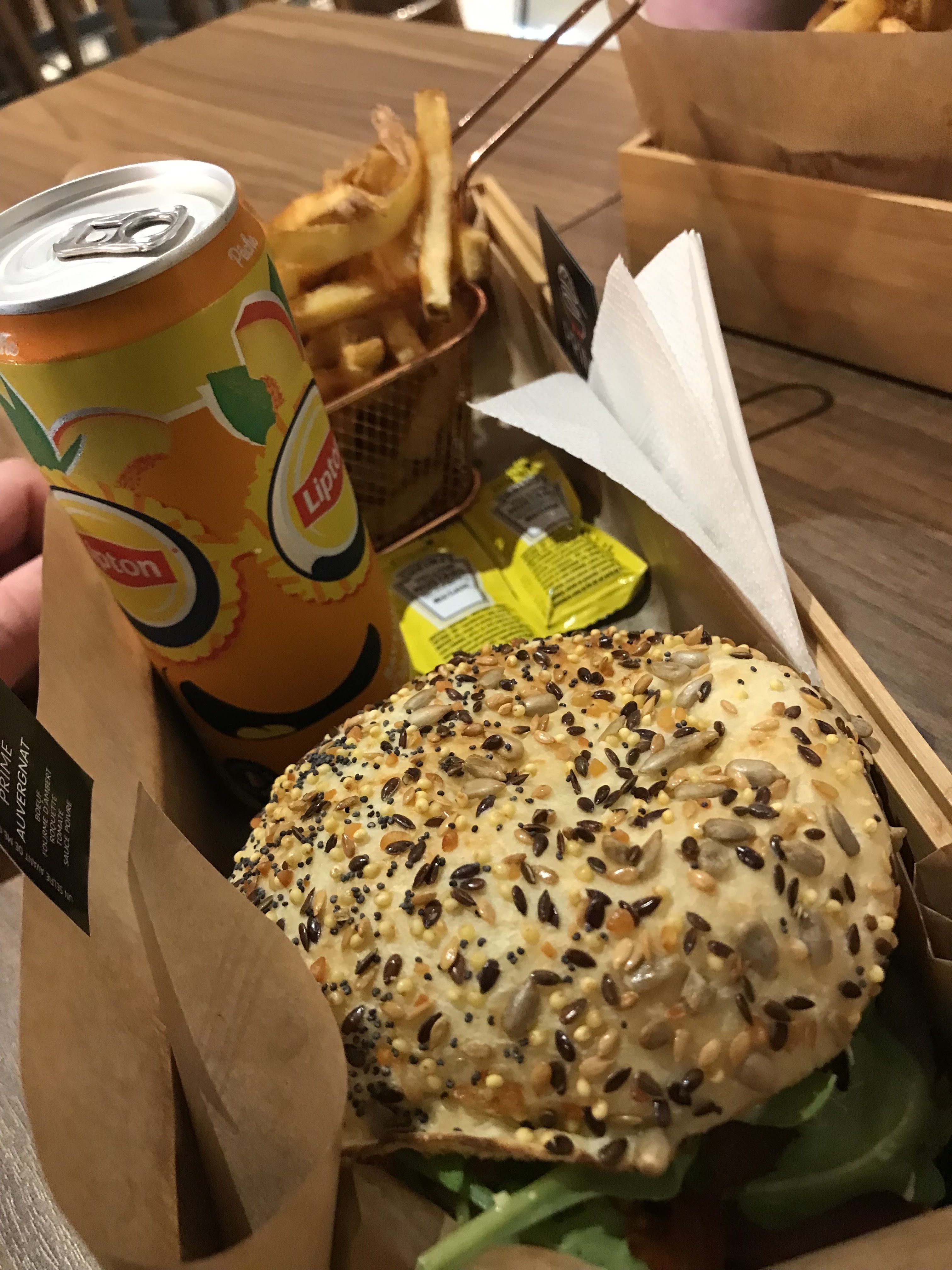 par où commencer ? j’ai commandé sur uber eat a 21h30, c’est arrivé à 22h30 sachant que le livreur devait aussi s’arrêter livrer en prio qlq d’autre. bon déjà c’est beaucoup d’attente mais encore ça passe. le problème c’est qu’une fois la commande reçue nous avons eu le plaisir de découvrir que les boissons avaient été oubliées (2). bon, puis ensuite une nouvelle surprise saute aux yeux lorsqu’alors que j’avais demandé à ce que la roquette soit remplacée par de la salade et que la sauce barbecue soit remplacée par la sauce Prime (on peut fr ca sur uber eat c’est une sorte d’option) et bien évidemment j’ai eu un burger avec ma sauce bbq et de la roquette. les hamburgers étaient presque froids, frites idem, d’ailleurs quasi pas de frites dans les cornets et j’ai payé un milk shake 8€ je crois, énorme arnaque mdr vraiment y’a 3 gouttes fin bref c’est ridicule. une bonne commande très décevante qui n’a couté que 54,54€ mdrr ça va c’est pas du tout abusé ni du vol passez votre chemin croyez moi il vaut mieux. vous devriez avoir vraiment honte.