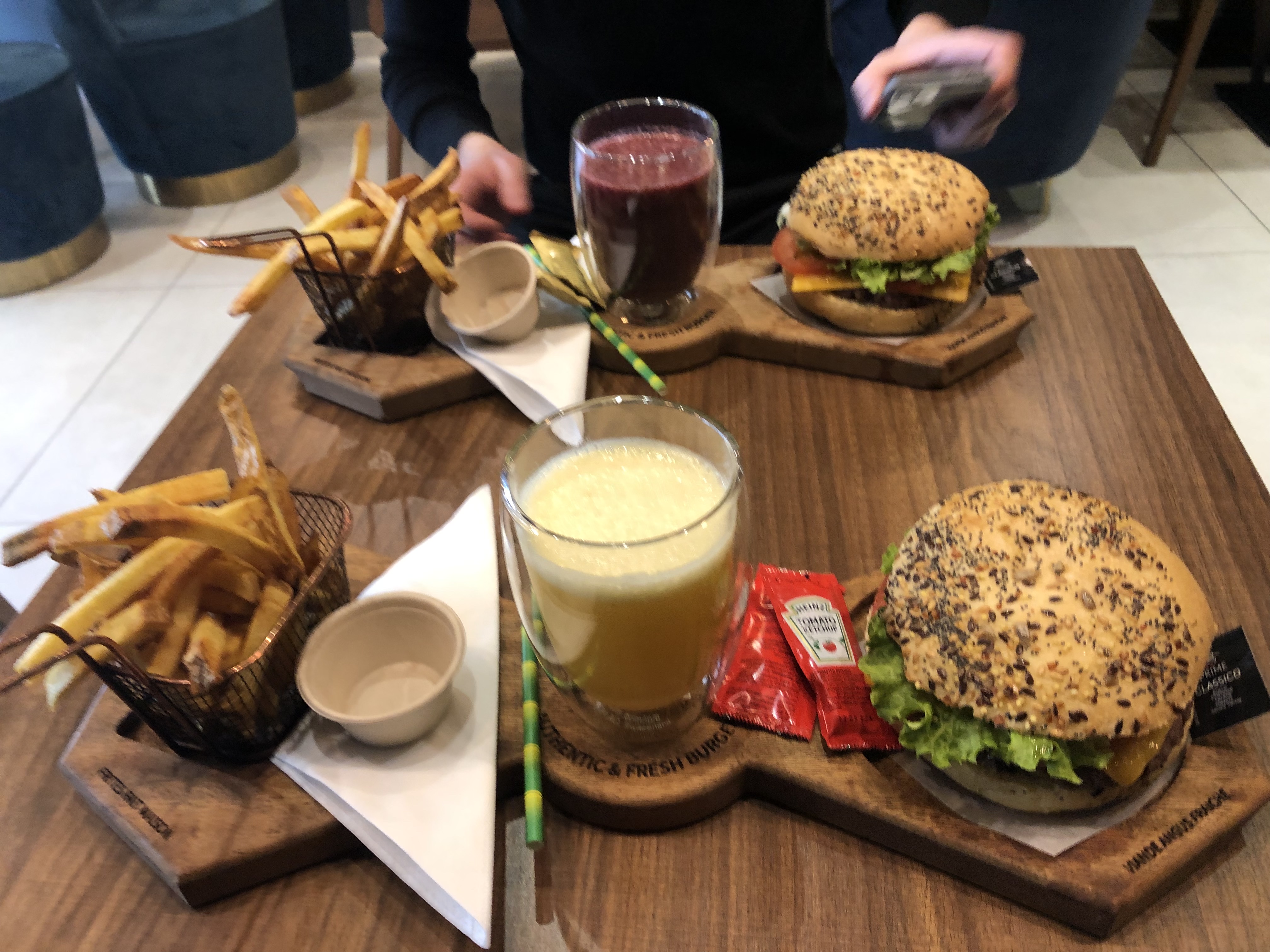 Je déconseille: Trop long, (45 minutes), aucun contact avec le personnel... les canapés et tables ne sont pas nettoyés, il y avait des miettes partout... 1 couple avec 1enfant de 7ans et 1 bébé, nous avons passée commande à 20h32 sur bornes et sommes partis avec la commande à 21h15... Peu de monde dans les restaurant et pourtant chacun s'impatientait. En parlant aux personnes, tout le monde attendait depuis minimum 40minutes... Pas d'excuses pour la longueur de préparation,... pas de bonjour... Même avec le bipper qui sonne dans nos mains, le mr du comptoir ne réagissait pas (il lui a fallu 2-3min pour percuter) Pour la qualité: c'est très bon MAIS l'attente est vraiment très longue. Cela ne vaut pas le prix (environ 15-16 € le menu) non plus, ce sont des produits simples. Enfin, dans le restaurant il y a des photos de burger avec fraises et framboises assez intrigantes et tentantes mais non disponibles pour commander...