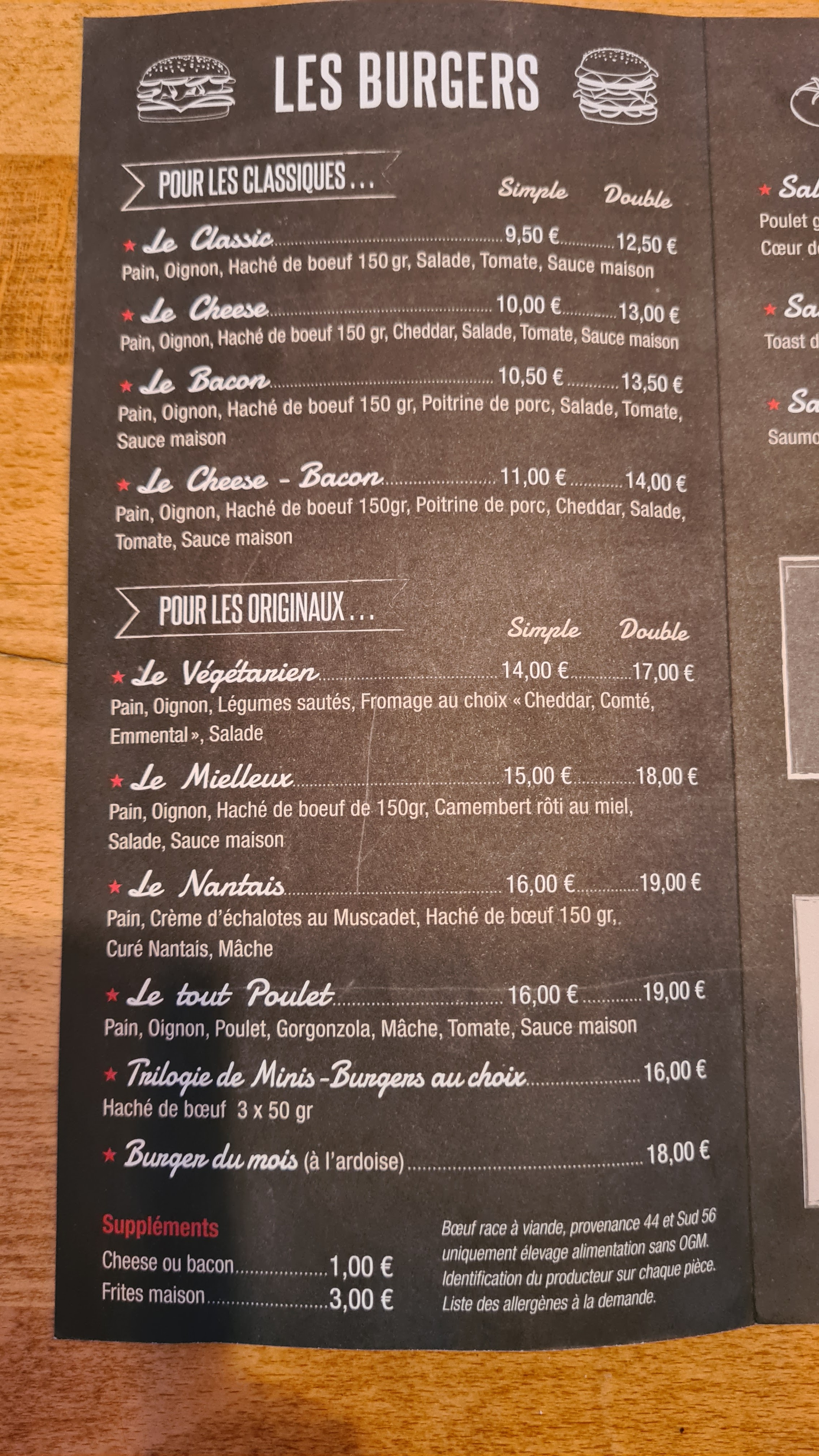 Décu !!! Ayant regardé les avis, je m'attendais à mieux !!! Burger manque de sauce et fromage. Nous avions pris des burgers originaux, ils sont quand même minimum à 15 eur donc le rapport qualité prix n'y est pas du tout. Burger du moment au fois gras à 18 eur, un concurrent de St Nazaire fait un burger maison au foie gras qui est une tuerie pour 1 euros de +. Frites maison, non je ne crois pas. Ce sont juste des frites Bistro qui s'achètent surgelées, c'est vrai qu'elles sont bluffantes, j'en achète moi même. Sinon cadre sympa