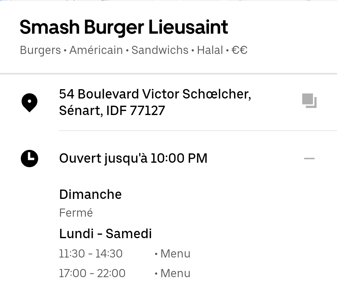 Voici toutes les informations sur le Restaurant de hamburgers Smash Burger qui ce trouve au 54 Bd Victor Schoelcher, 77127 Lieusaint (77). Sur cette fiche vous trouverez les photos, l'adresse, les horaires d'ouverture, le numero de téléphone et les avis clients.Vous pouvez églement rédiger un avis si vous le souhaitez en bas de page.