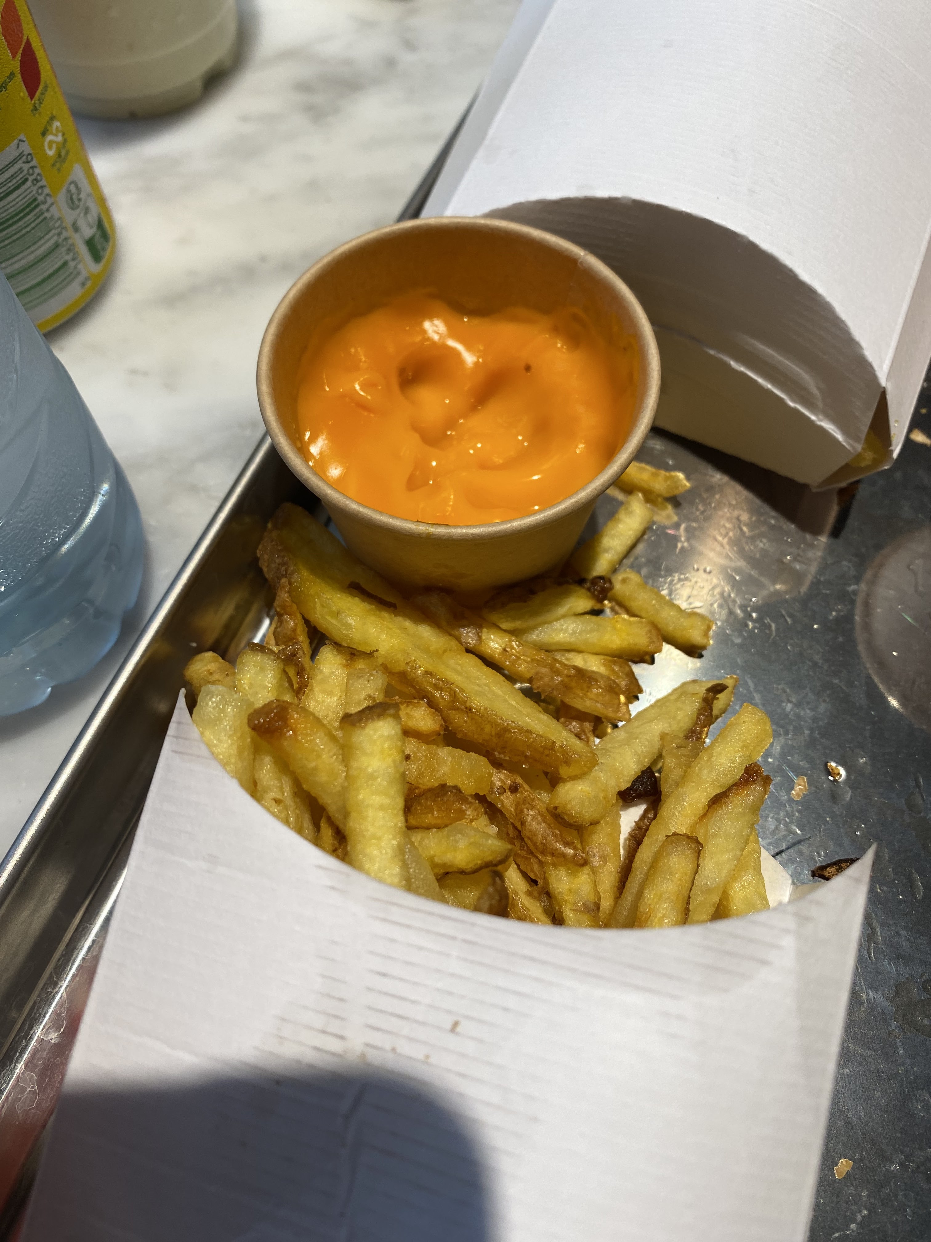 C’est de loin le meilleur fast food rapport qualité prix, tout est frais, salade croquante, tomate bien rouge et pas marron, oignon bien goûtue et croquante, steak bon aussi par contre le seul bémol c’est que pour un triple cheese nous avons eu qu’une tranche de formage ( peut être que c’est la recette ) alors qu’on s’attendait à quand même un peu plus de tranche de fromage 🤔 Ça n’empêche pas que c’était excellent ! Ça n’a plus rien avoir avec Steak and Shake, la le burger était massif ! Mais pas super lourd, nous avons été agréablement surpris par la qualité et le goût du burger. Frites + cheddar je le conseil à 100% pour ceux qui aiment le cheddar. C’est pas comme dans les autres fast food ou le cheddar est foutue sur les frites et sèche au bout de 2 min, la vous trempez directement la frite dans le cheddar sans vous foutres du fromage partout sur les doigts 🥹 ( 1 pot de cheddar suffit pour deux à par si vous souhaitez vraiment baigner vos frites au max et bien prenez en 1 chacun ) Et le milkshake est toujours aussi bon, et fait partie de mes préférés ! ( Milkshake Pistache 🫶 ). Si jamais vous souhaitez avoir un milkshake après le repas, n’hésitez pas à en faire part à l’employé :) Pas besoin d’en faire un scandale 🤭