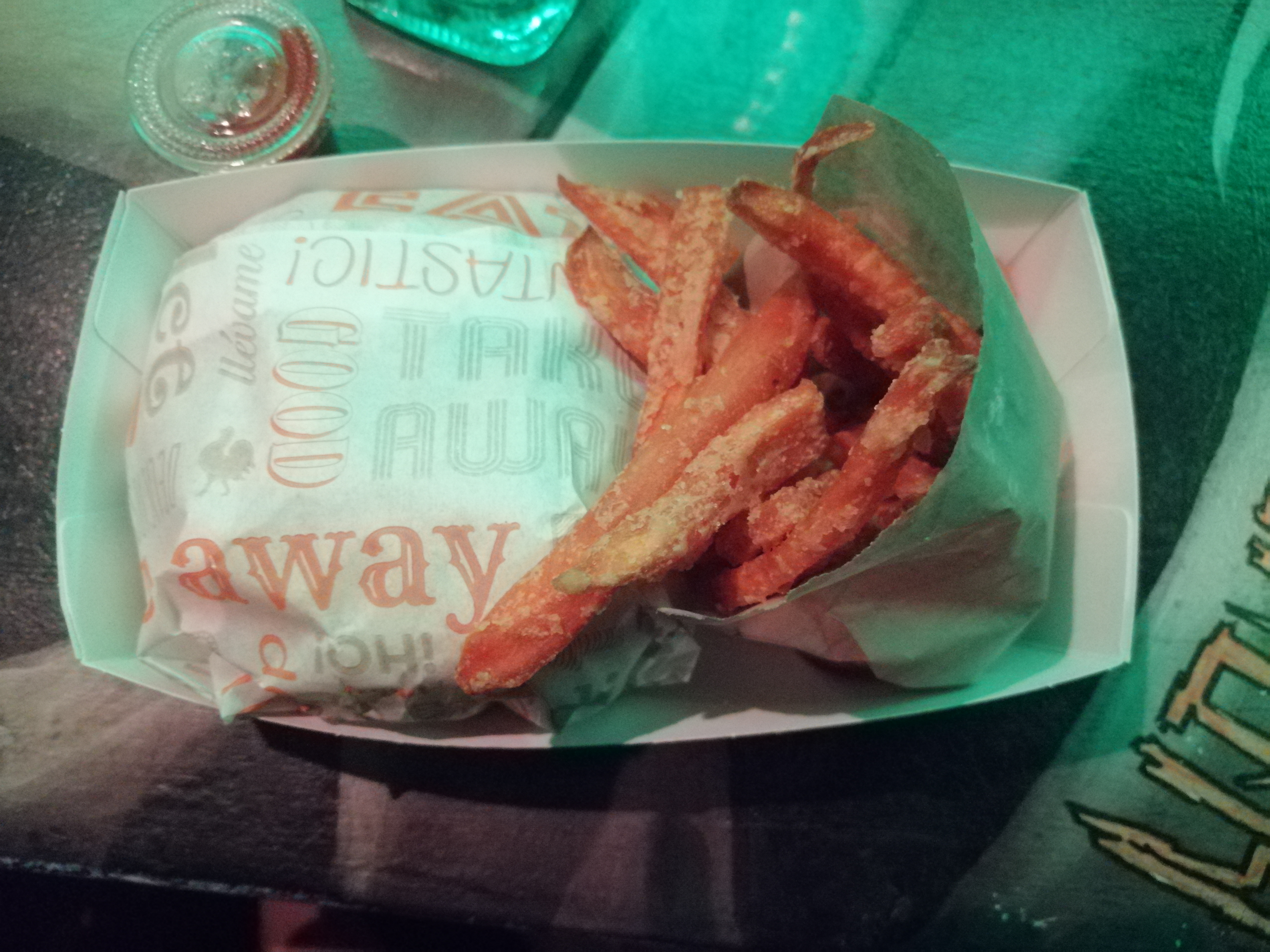 Nous avons pris à emporter. Il y avait beaucoup d’attentes (20 minutes de retard…) mais le Monsieur s’est excusé et il était adorable donc ça nous a pas dérangé au final! On a eu la petite surprise des bonbons et nous avons trouvé ça très original ! ( à continuer car ça donne le sourire). Je met 5 étoiles car franchement les frites de patates douces étaient vraiment delicieuses et le burger pareil ! Attention gros mangeurs, prenez un double steak je pense ! Nous reviendrons avec plaisir, nous avons adoré !