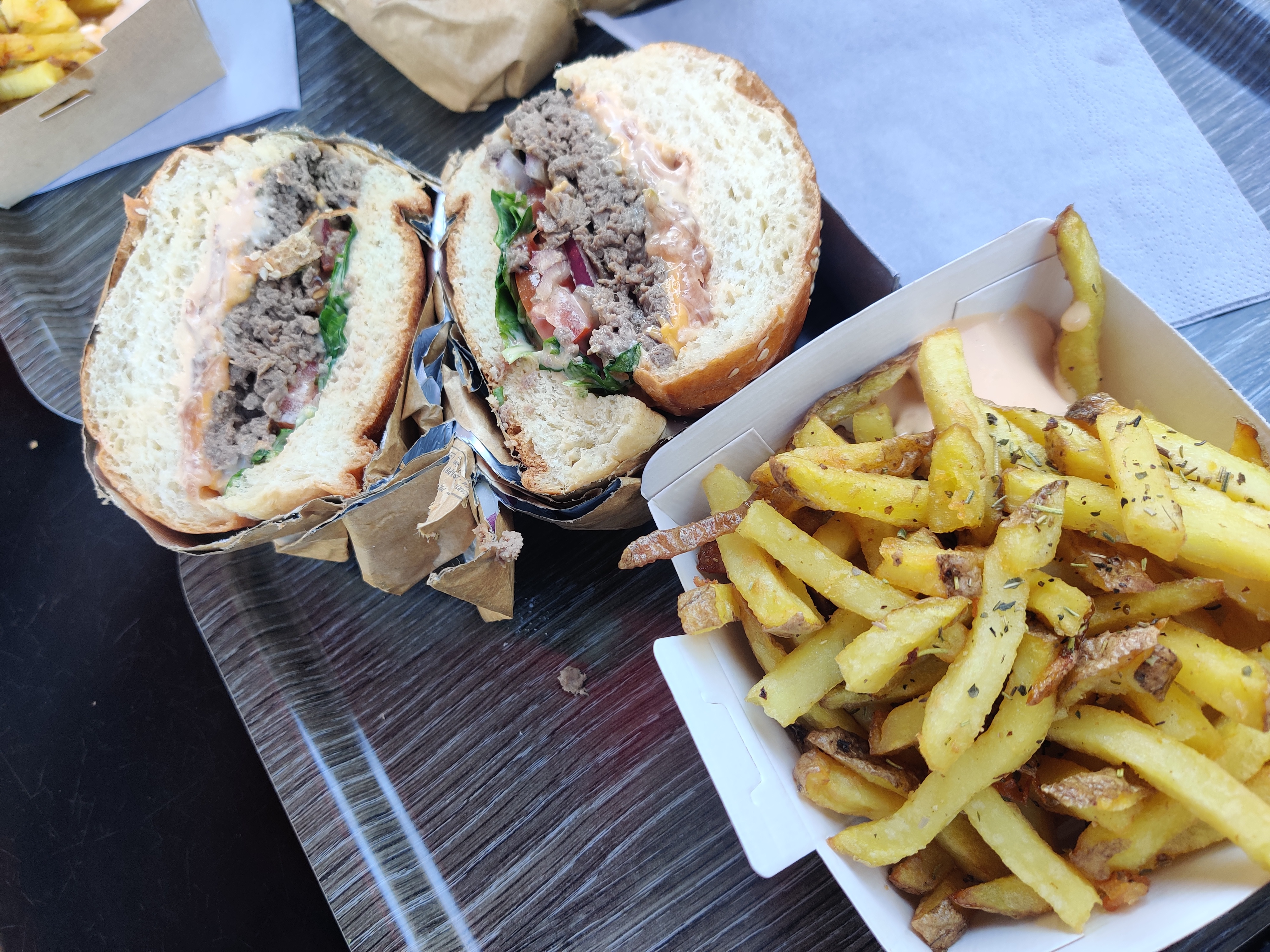 Tout d'abord, le service était excellent. Nous y sommes allés pour les hamburgers. Le pain était un très gros pain brioché moelleux. La viande était également bonne et généreuse... Je peux recommander les frites normales ici plutôt que les hamburgers.