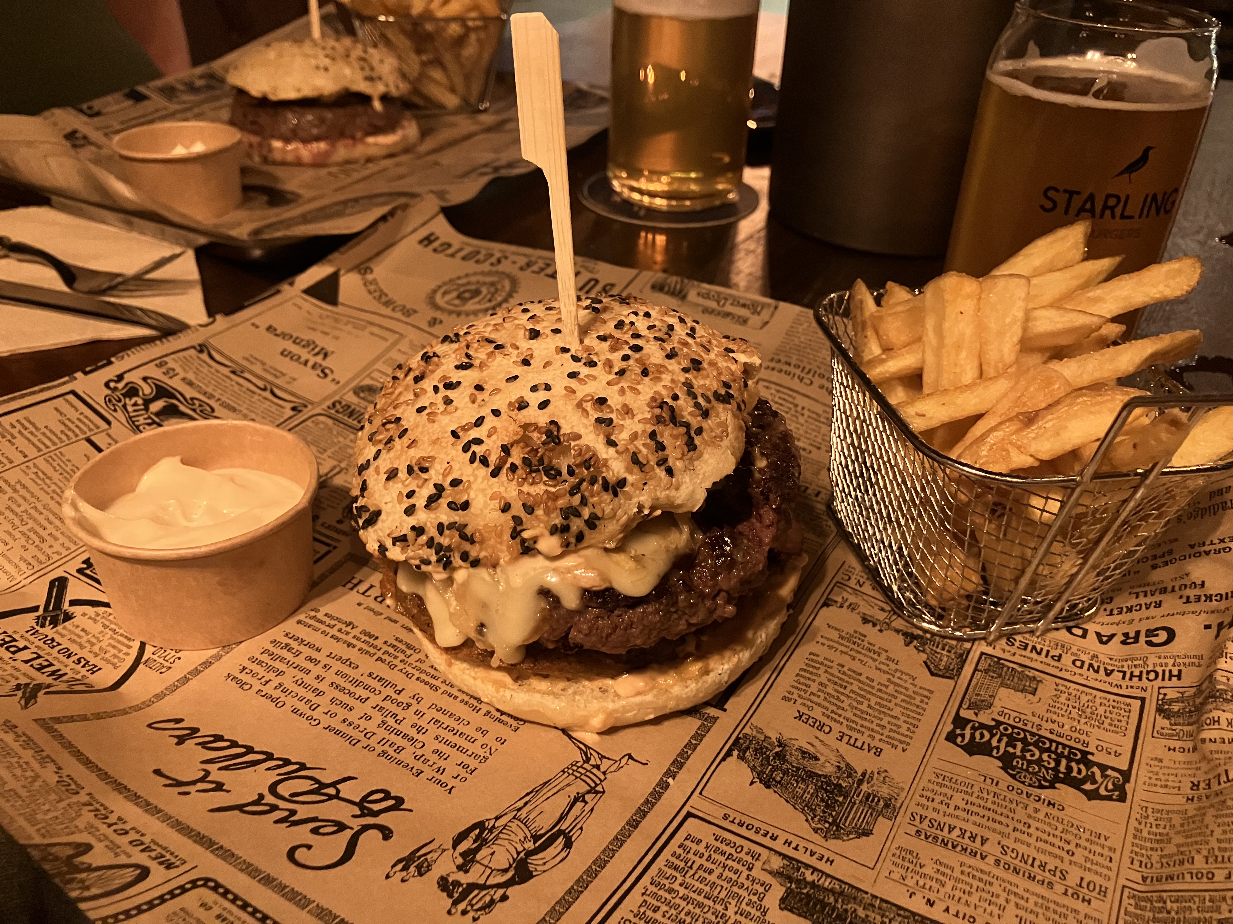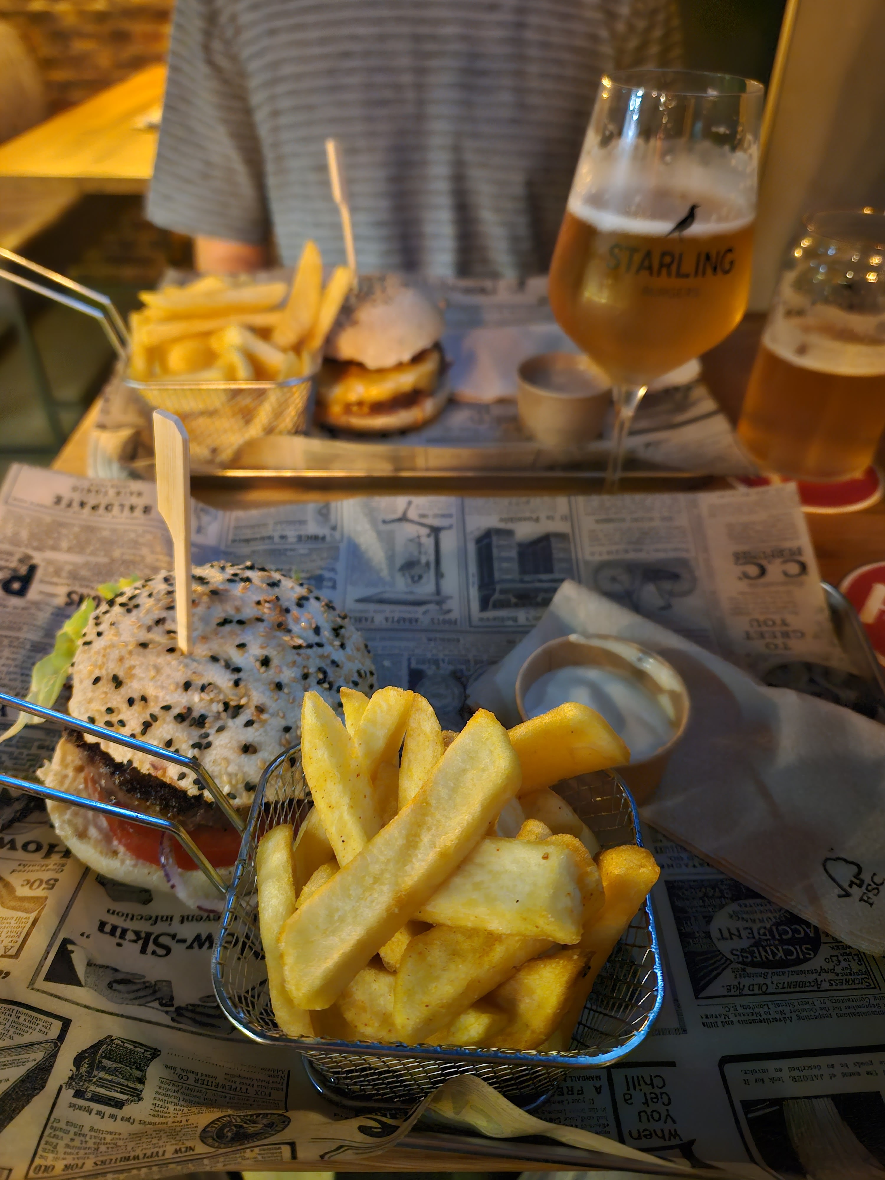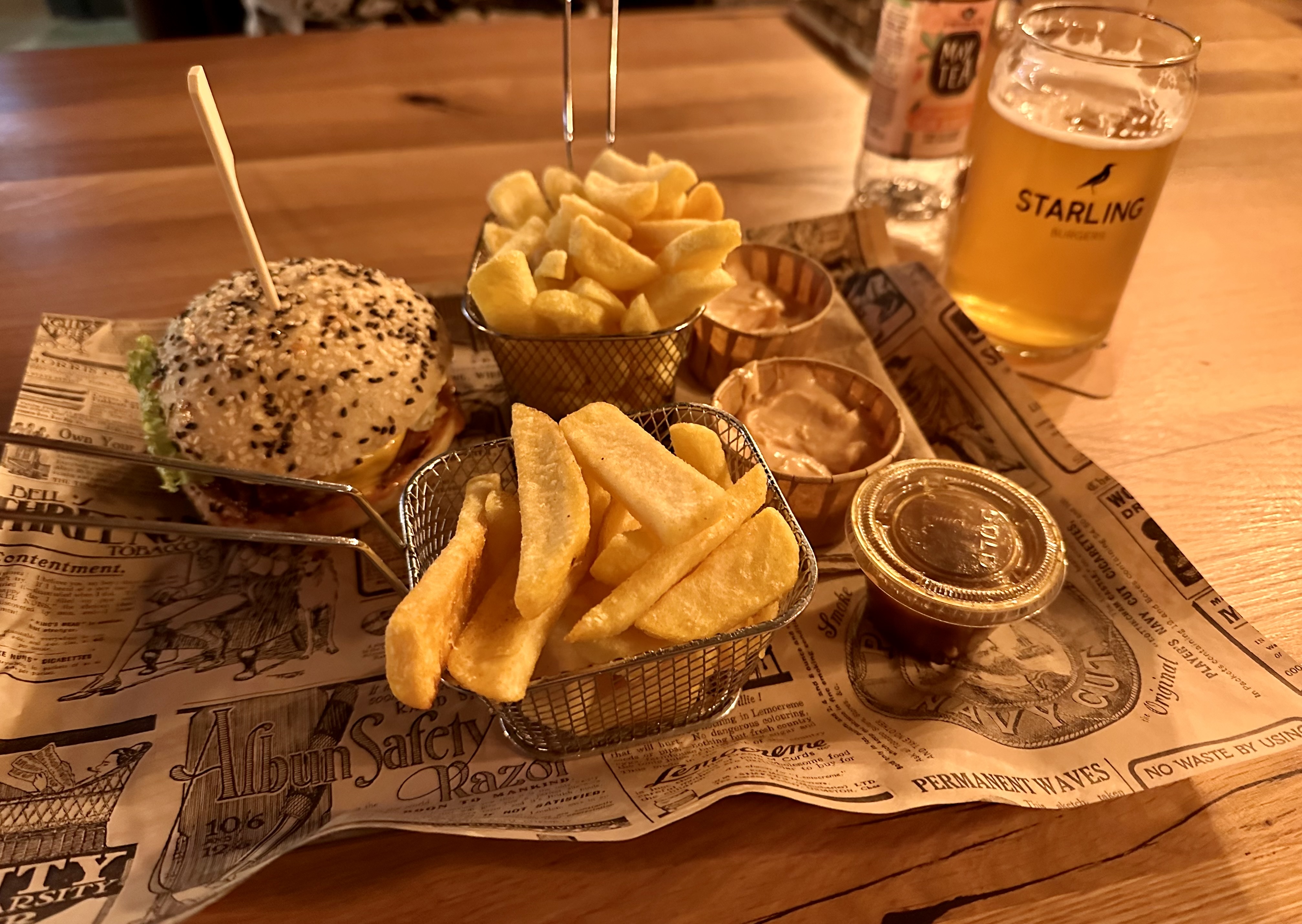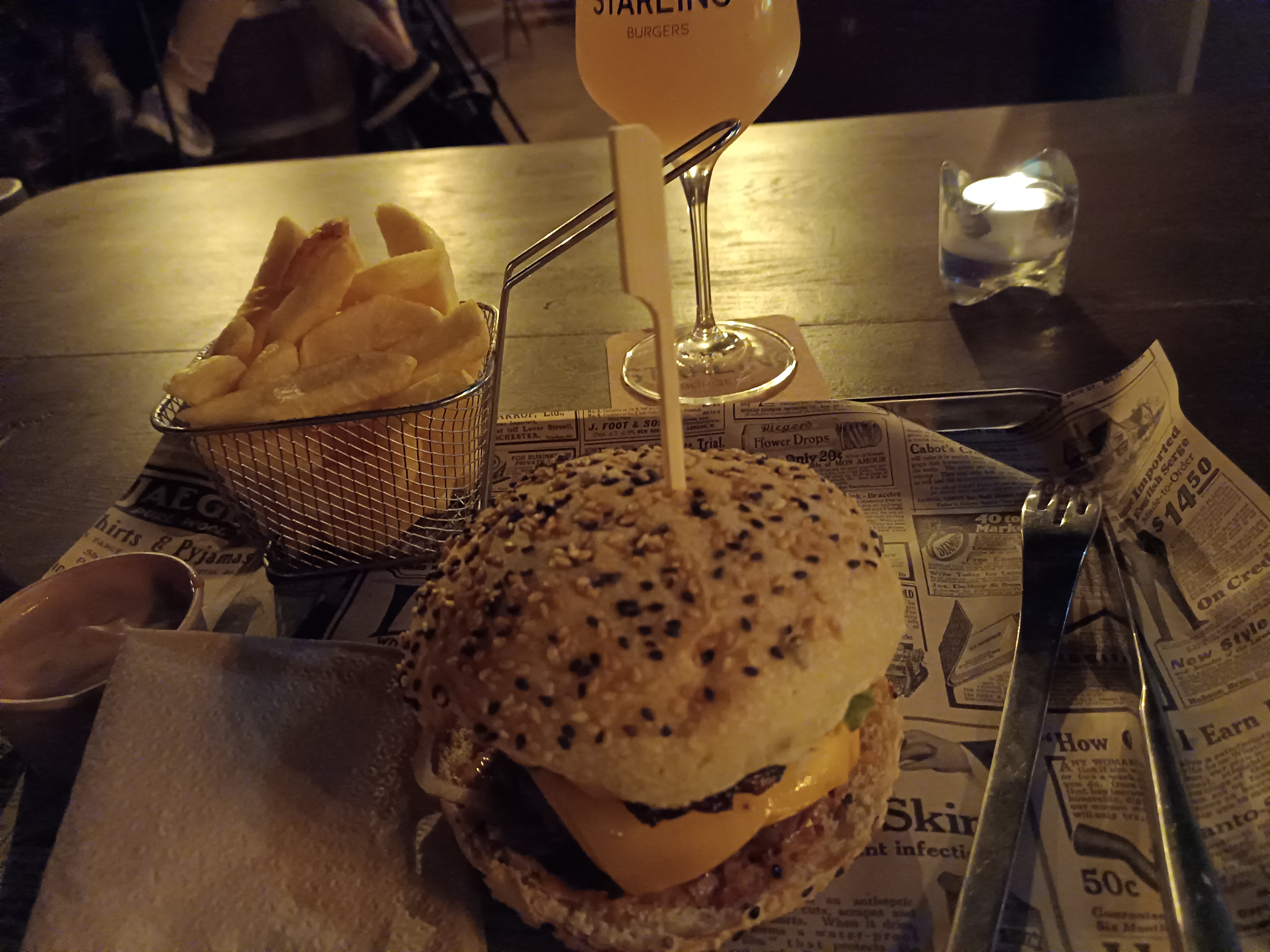 En descendant dans la cave qui sert de bar Starling, je me demandais où j'étais tombé. Mais finalement, la salle est belle, avec une ambiance presque intimiste. Le bar dispose d'un grand choix de bières, et les burgers proposés sont bons pour un prix assez bas (comptez 15 euros pour un menu burger+boisson) Seul bémol : le service était un peu long, mais c'était justifié par le nombre de clients. Je recommande