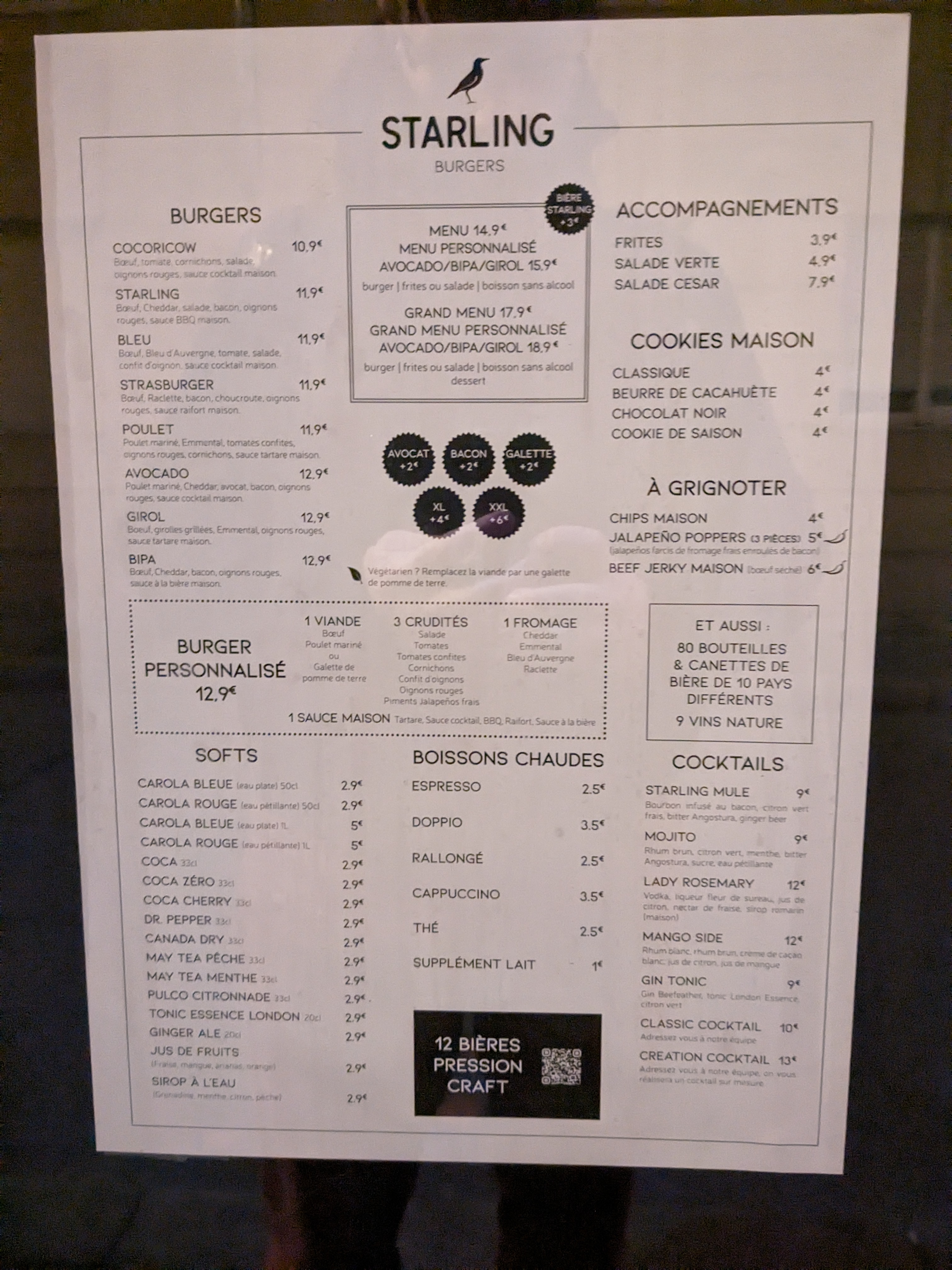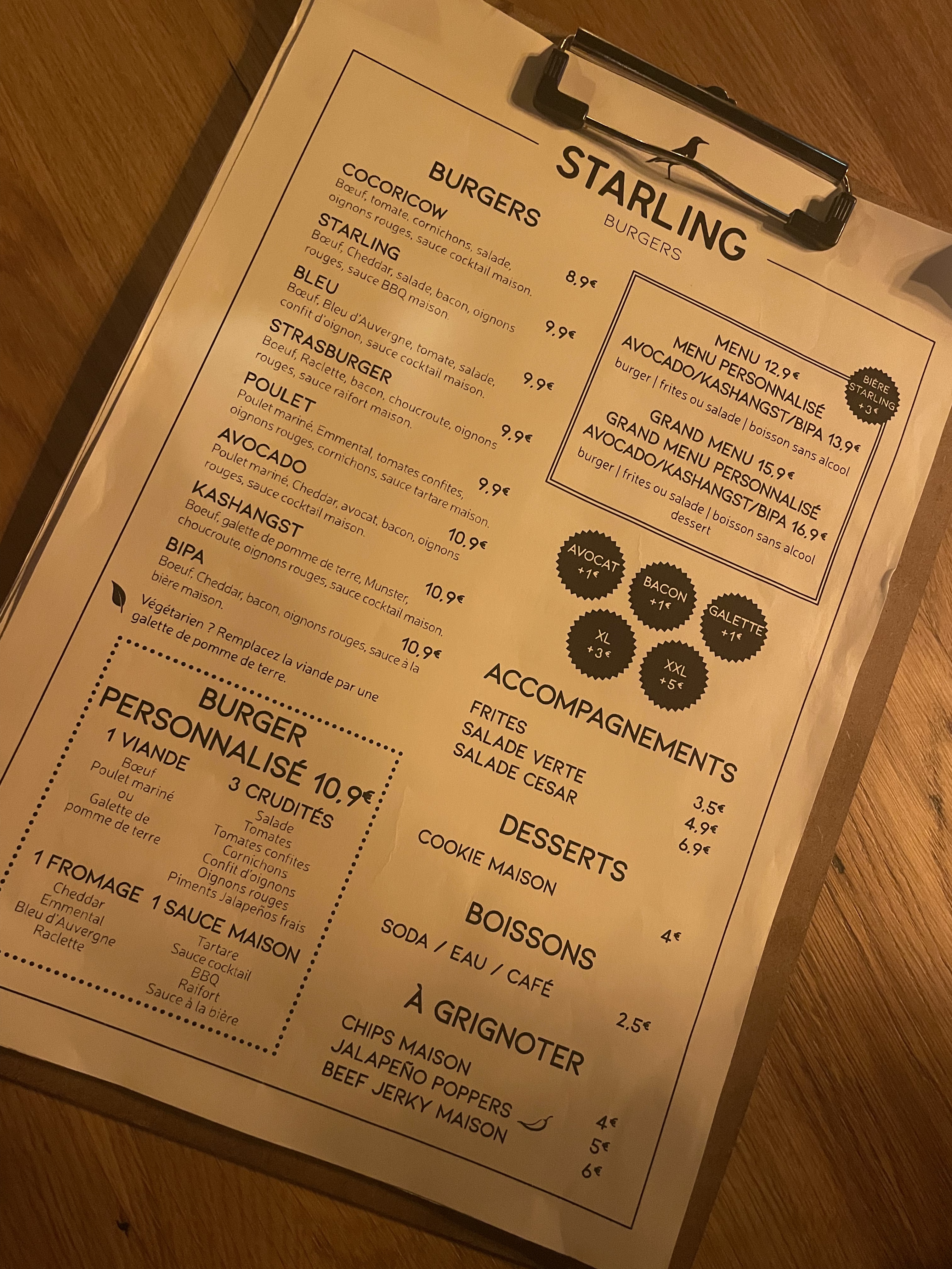 Magnifique expérience cette semaine au Starling du centre ! Les burgers et frites étaient délicieux ! Gros coup de cœur pour le beef jerky qui n'est pas dispo à celui de la Krutenau Un grand merci à notre serveur Jimmy pour sa sympathie et son service efficace et rapide !