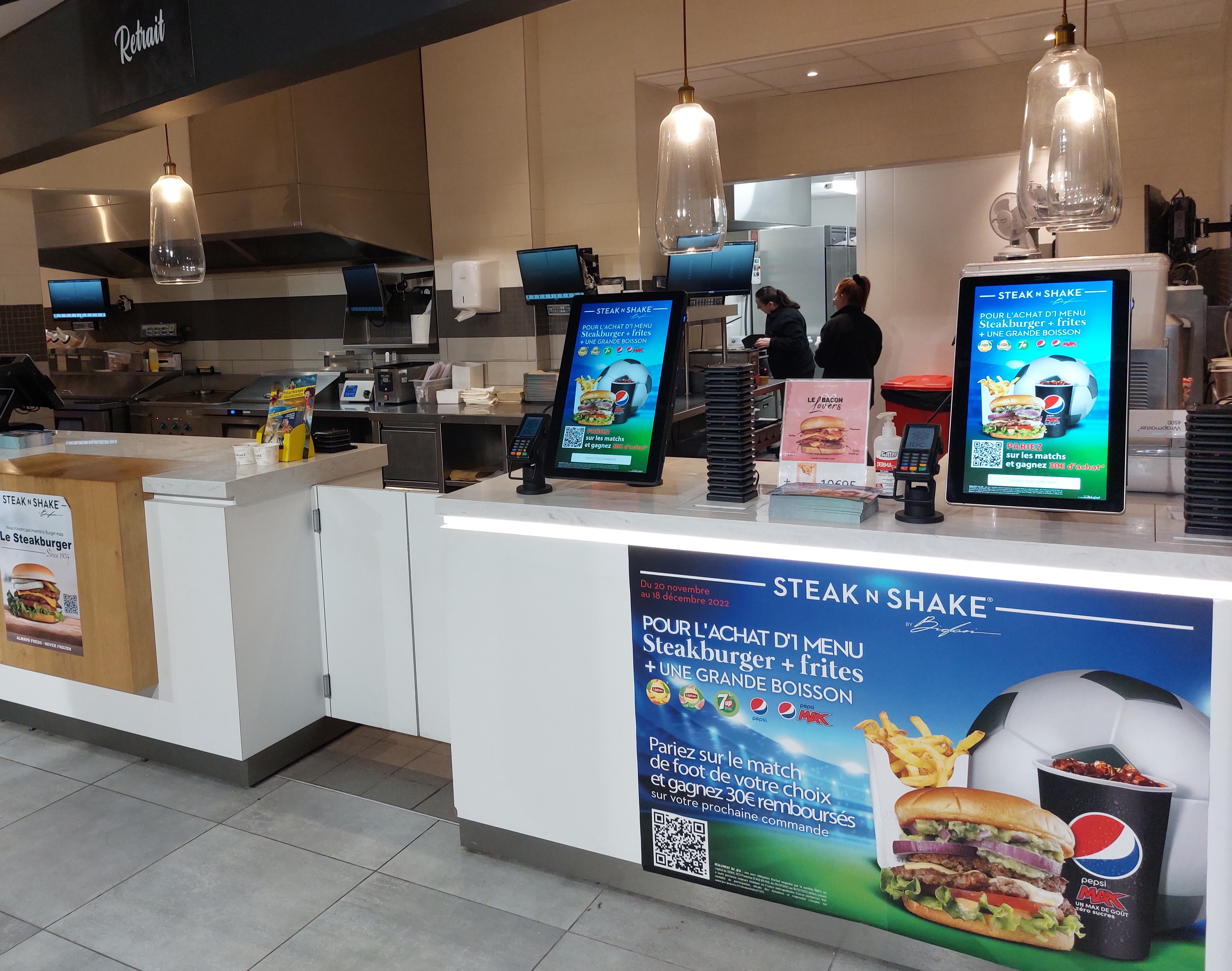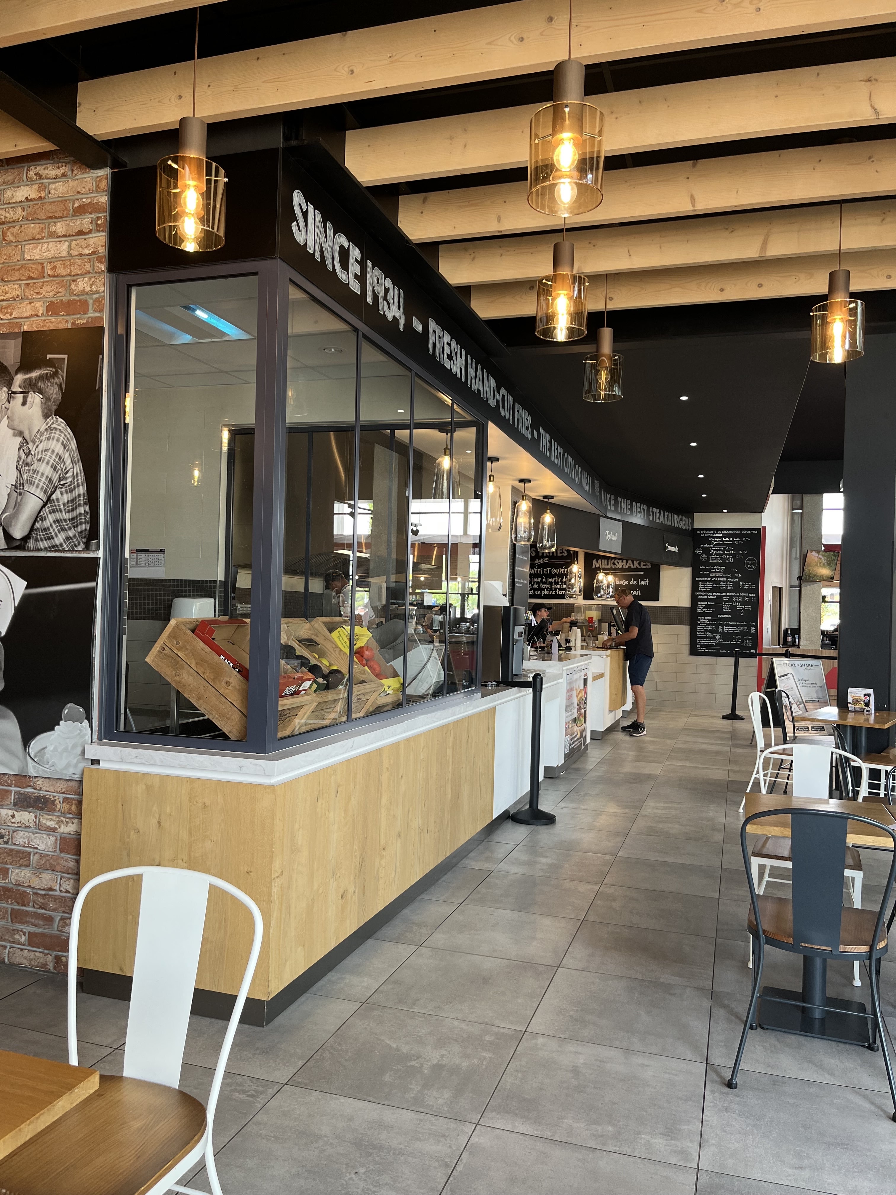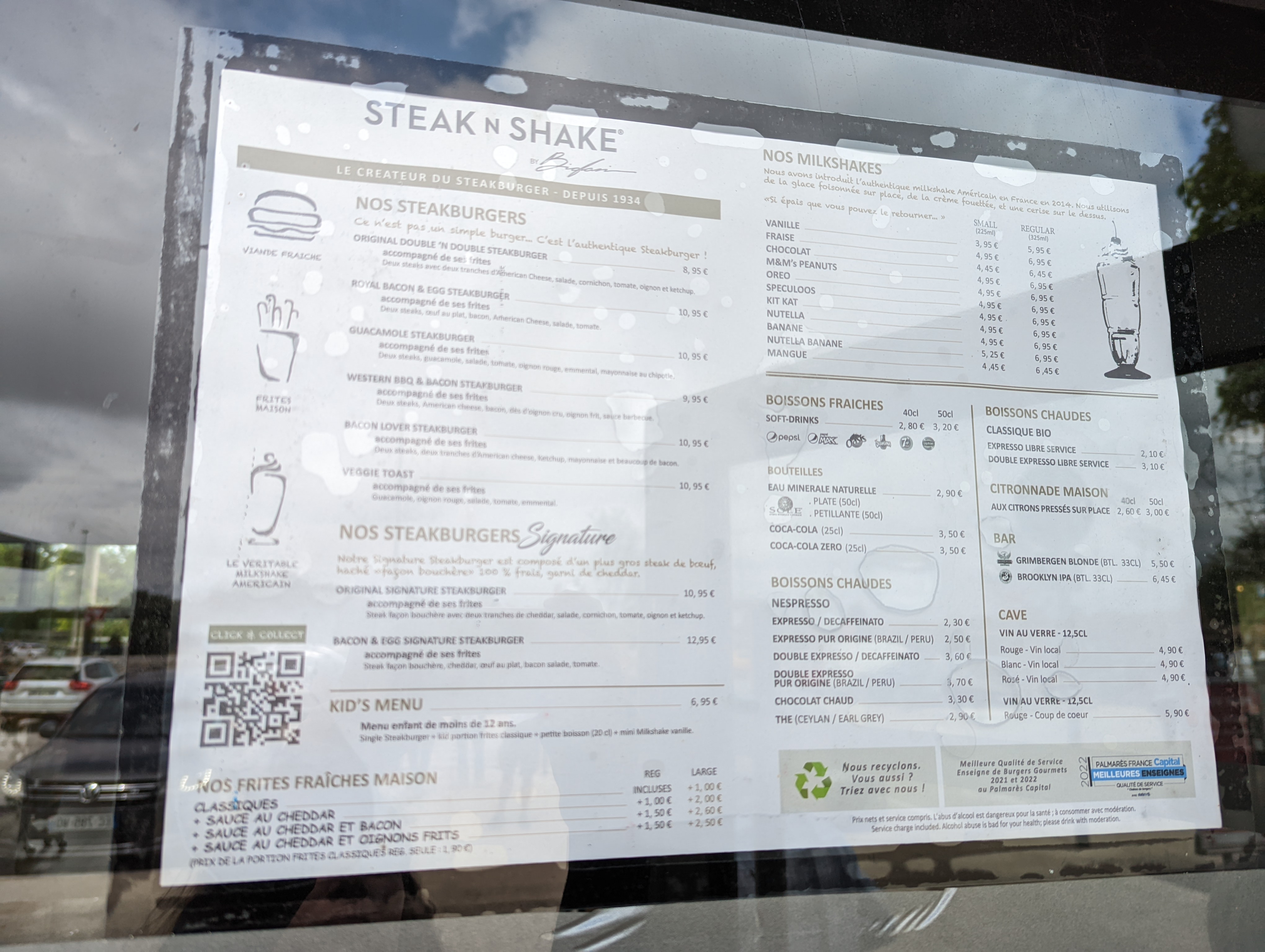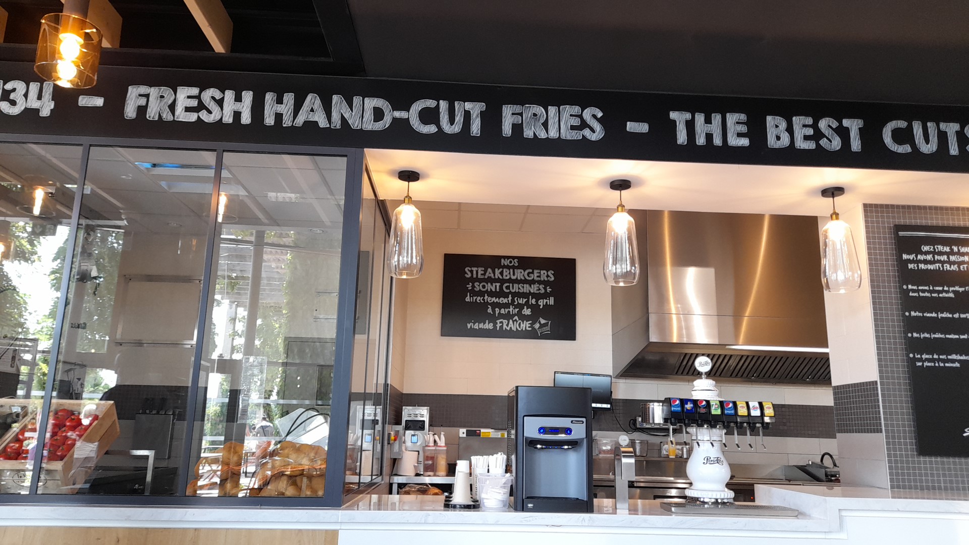 Cela fait des années que je m'arrête sur cette aire de repos. J'y ai toujours apprécié l'ambiance. Cette fois ci l'absence de fréquentation à fait que je me suis approché du fond des locaux. Car malheureusement il faut avoir le nez sur le tableau pour savoir de quoi il s'agit. Mauvaise communication. Très bel aspect des burgers. Malheureusement ça s'arrête là. S'appeler STEAK 'n shake et n'être même pas capable de former son personnel afin de cuire correctement l'élément principale du plat est déplorable. Intérieur quasiment cru. Pain relevant plus de la brioche constitué principalement d'air. Grosse déception. Y est beaucoup mieux déjeuner la fois précédente en prenant un sandwich sur le stand voisin très bien achalandé.