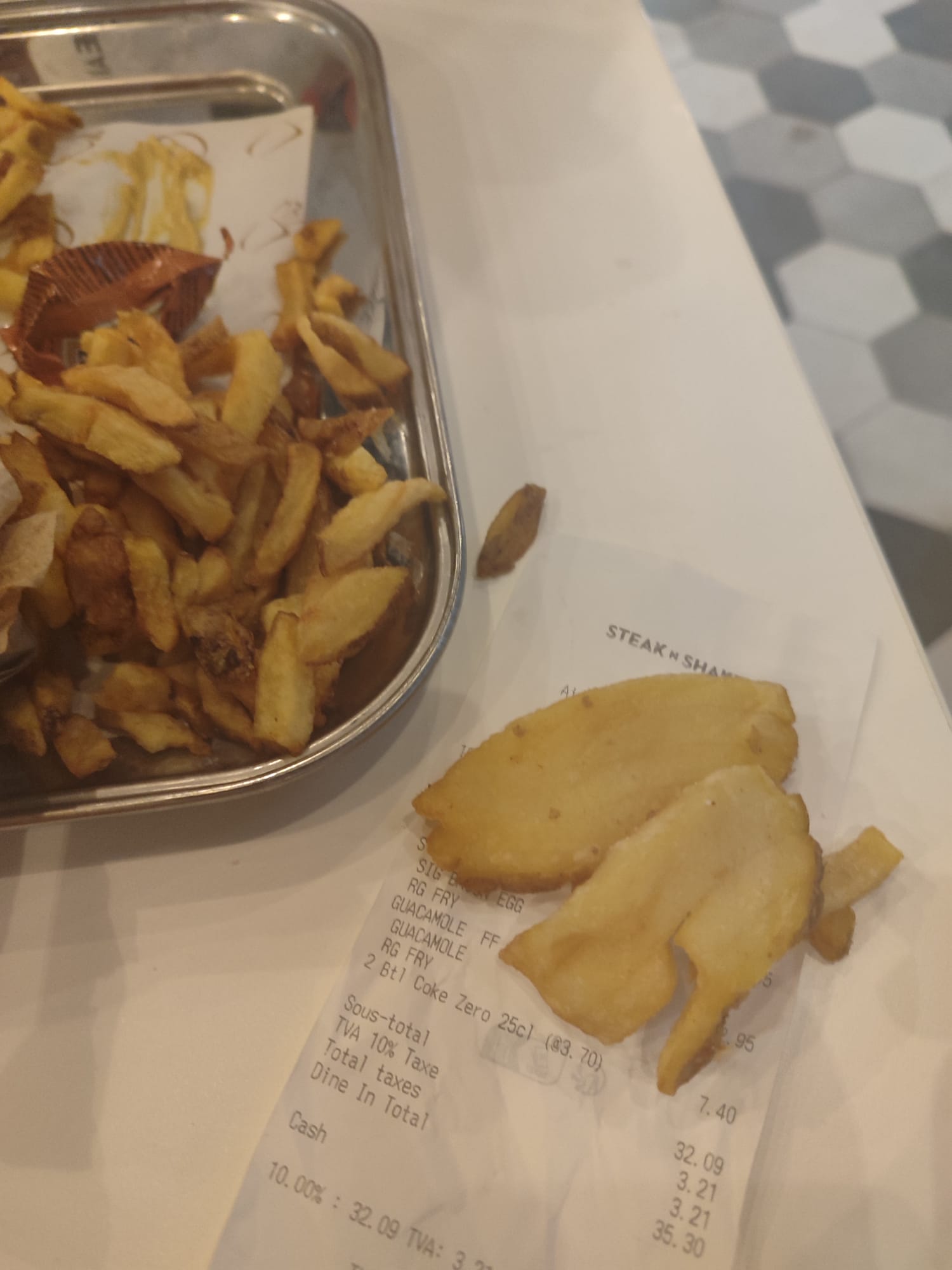 Bien le bonjour amoureux du goût, la moindre des choses quand le nom d'un restaurant comporte un mot en l'occurrence le mot Steak, il serait de bon aloi d'en ressentir la présence.... Merci a la vendeuse/poissonnière d'accueil la clientèle avec jovialité et bon humeur. A fuir si vous ne crevez pas la dalle, je préfère encore le sandwich triangle immonde a 7€ Au passage il me semble que sur la pancarte il était écrit frite fraîche et non frites sèche dont il me semble que la pauvre salière y est passé ! Celà fait seulement 5min que j'ai mangé et je souffre déjà, de plus la prochaine air de repos se trouve à une éternité... J'ai mal... Dans le pays de la gastronomie