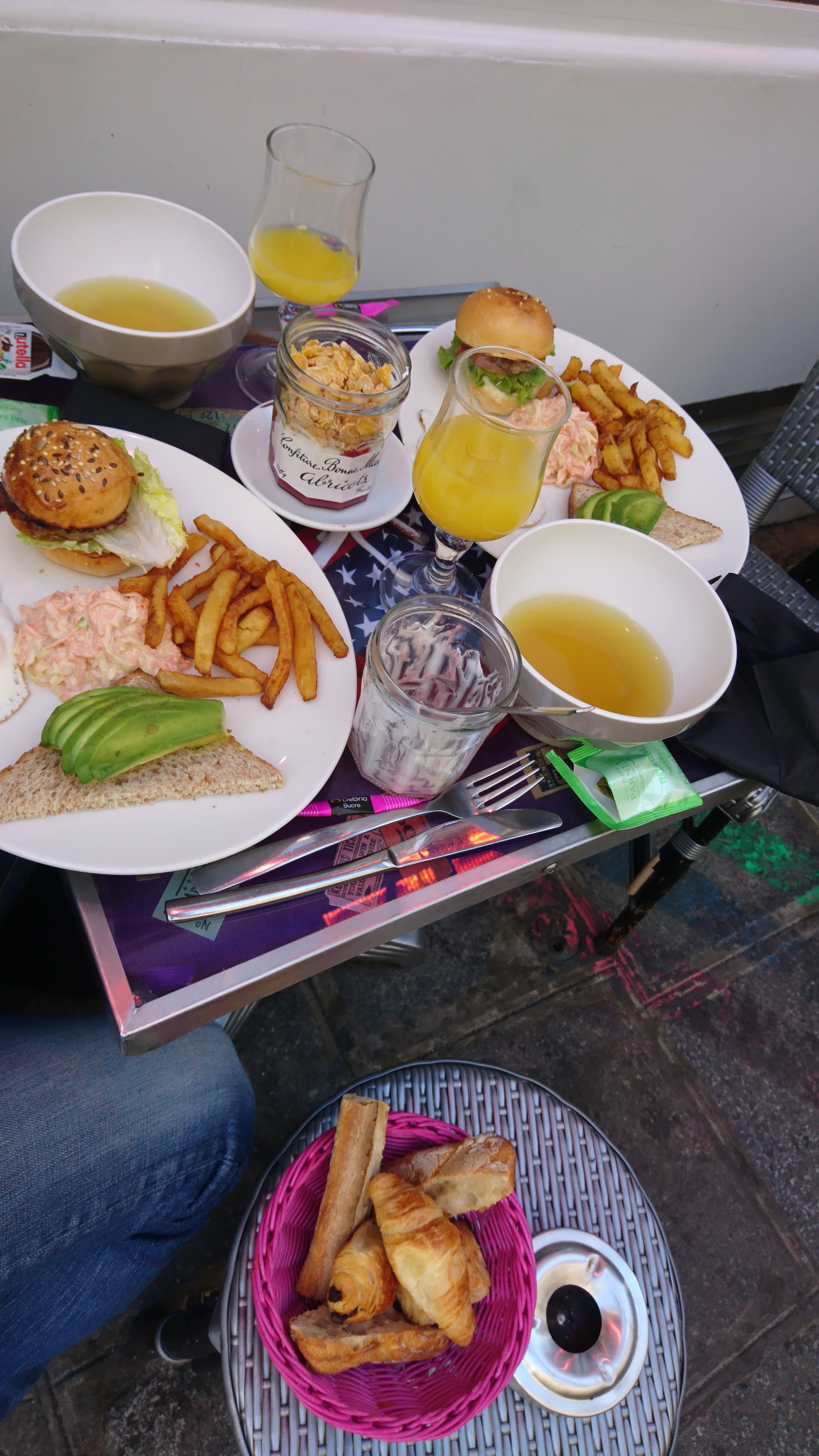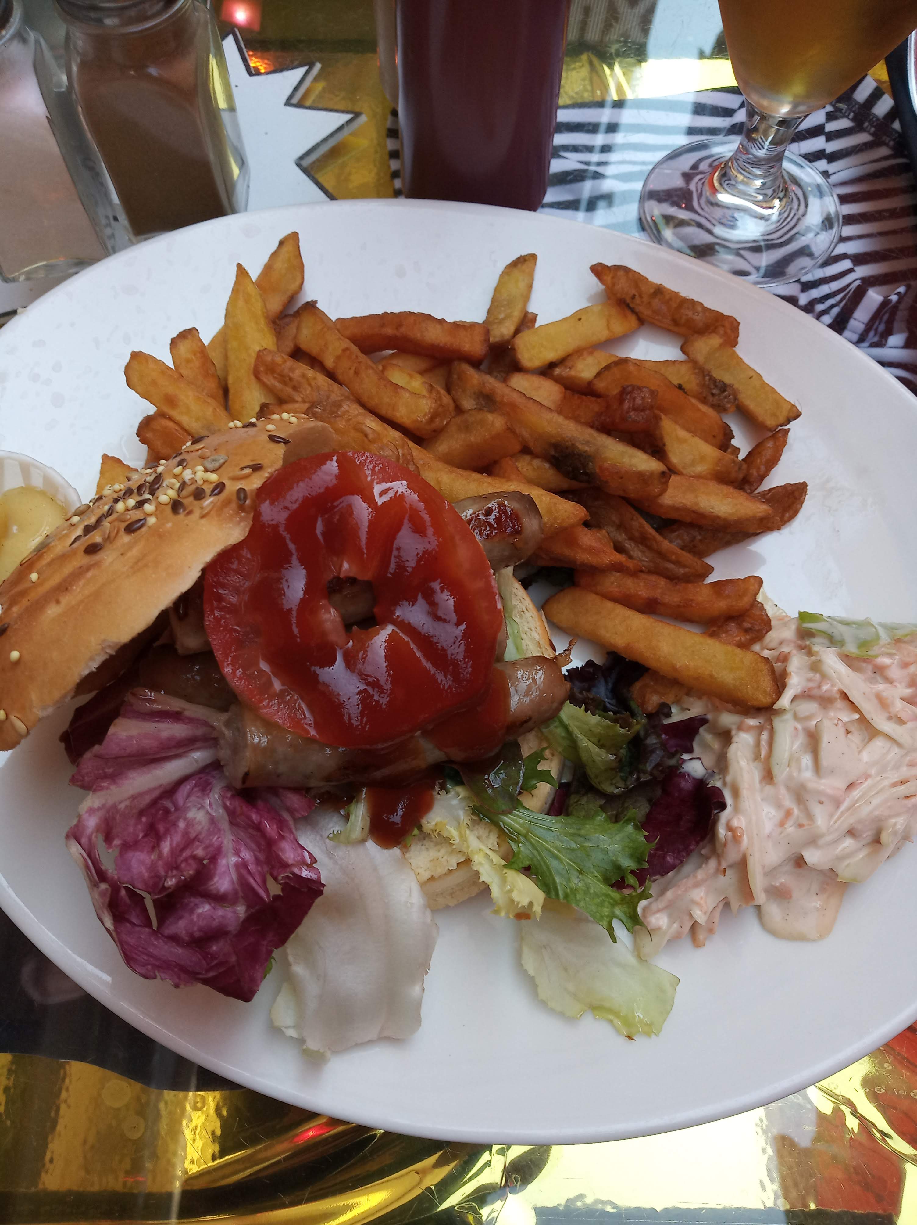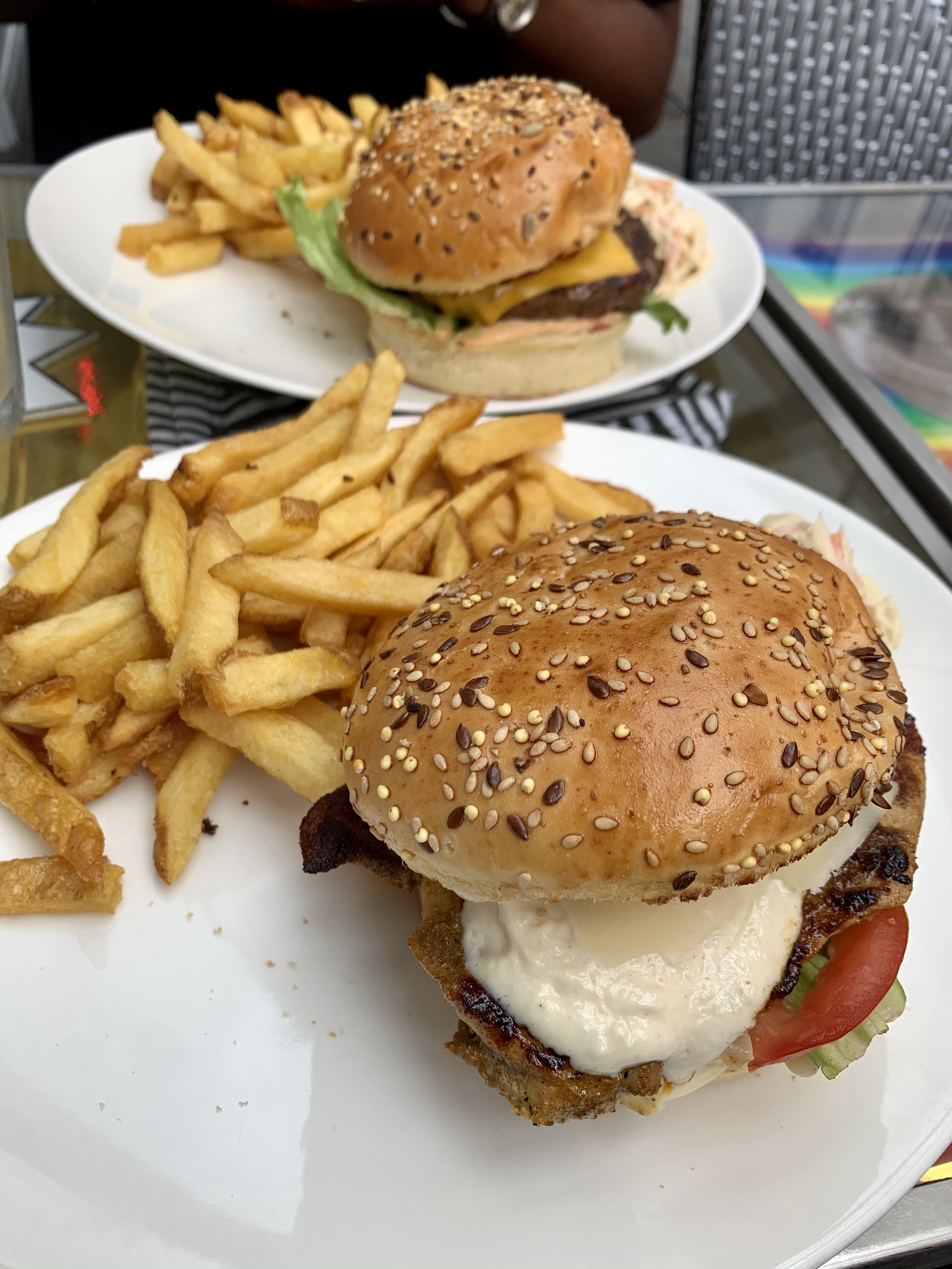 Très convivial, super ambiance. Le serveur sur qui nous sommes tombés était très sympa, il avait un super humour. Bonne qualité des plats, les frites étaient bien croustillantes. Au premier plan le fameux DSK (2 steaks haché), au second plan le végétarien la feuille de rose. Prochaine fois nous testerons le brunch.