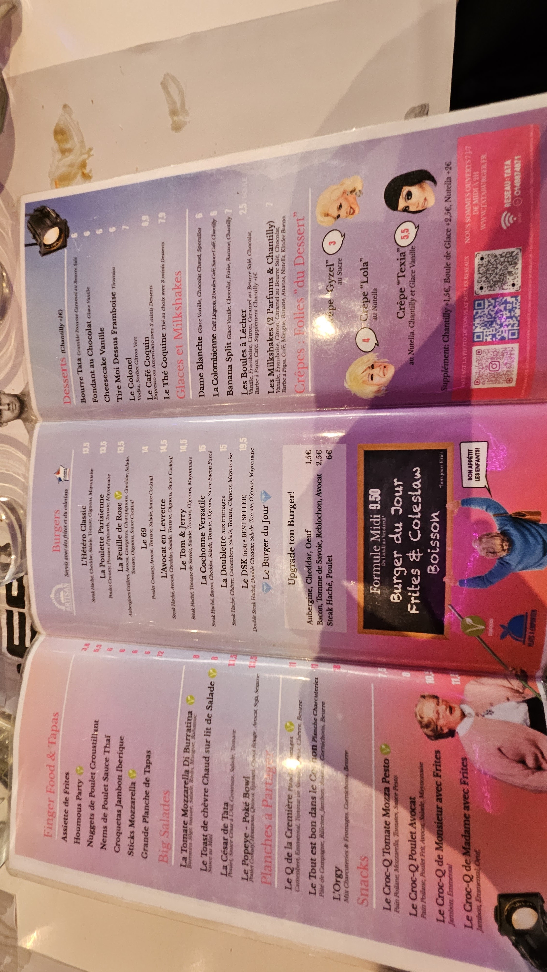 Un lieu insolite et très ouvert d’esprit qui proposent un assortiment de burgers différents ayant tous des noms originaux ! Des serveurs hyper friendly. Les burgers et frites étaient très bons et j’ai particulièrement adoré la tomme de Savoie qui s’est retrouvé dans Le Tom ‘n Jerry. Le crumble aux poires et au caramel était croustillant et moelleux en même temps c’était réjouissant.
