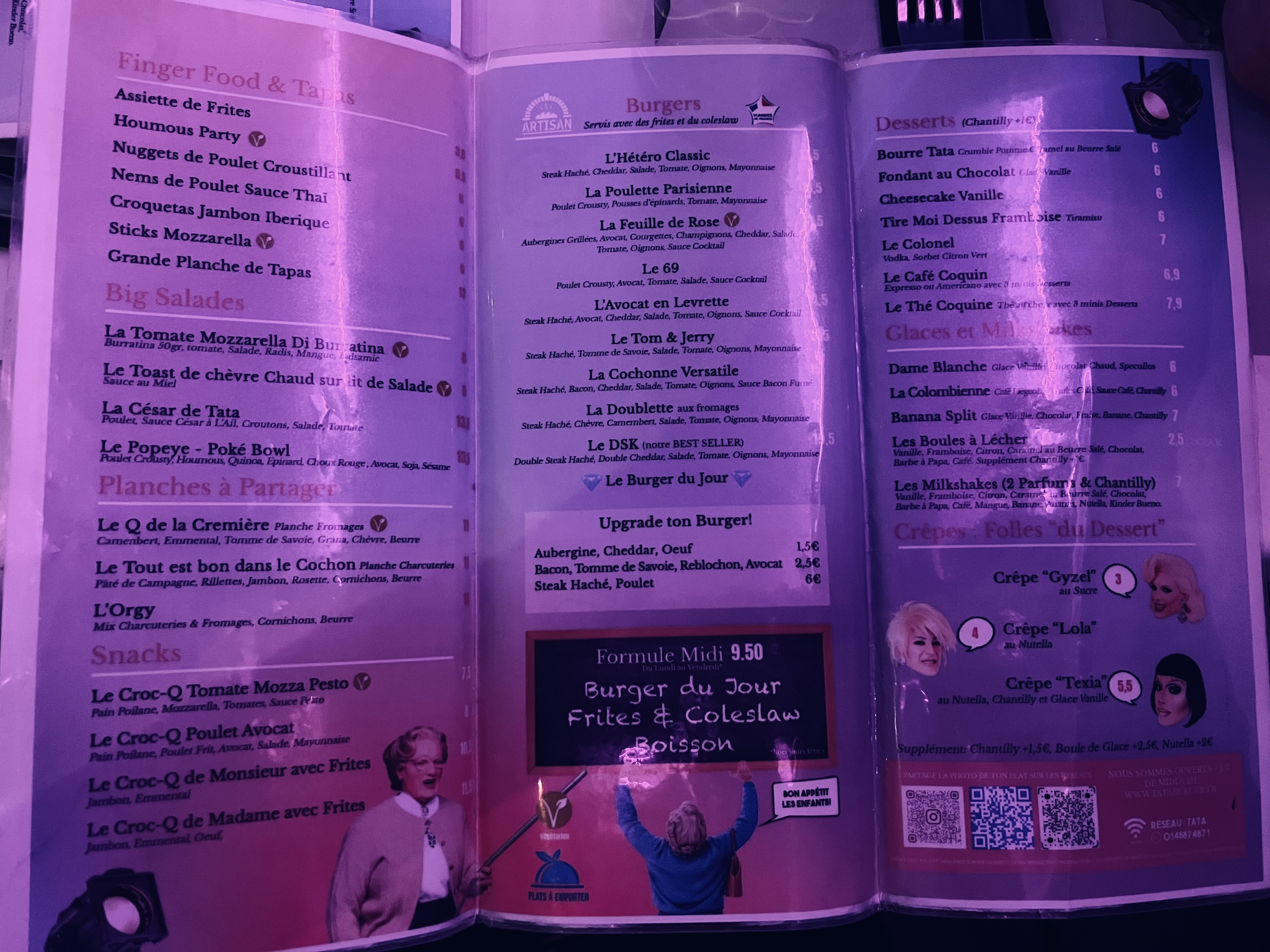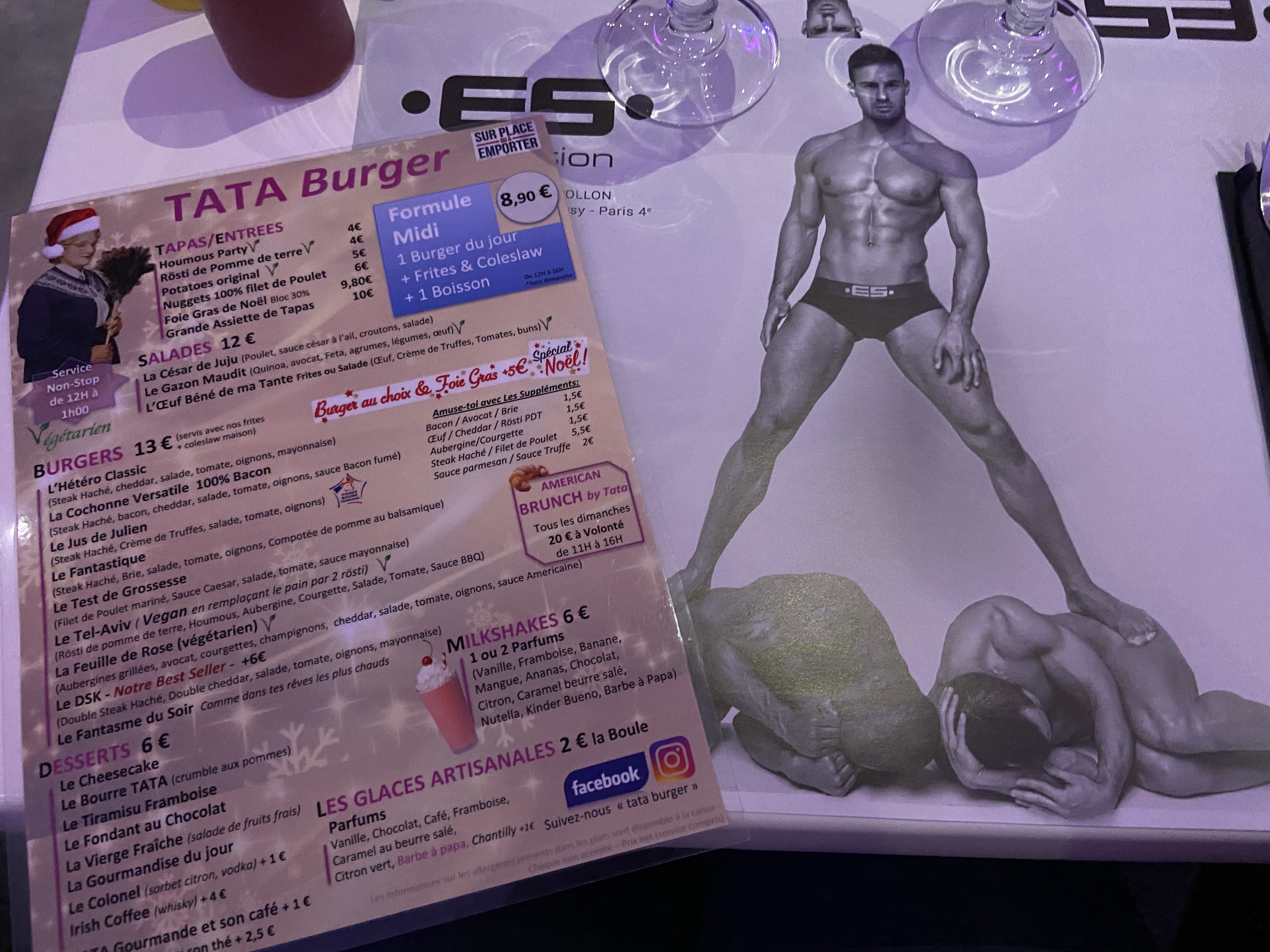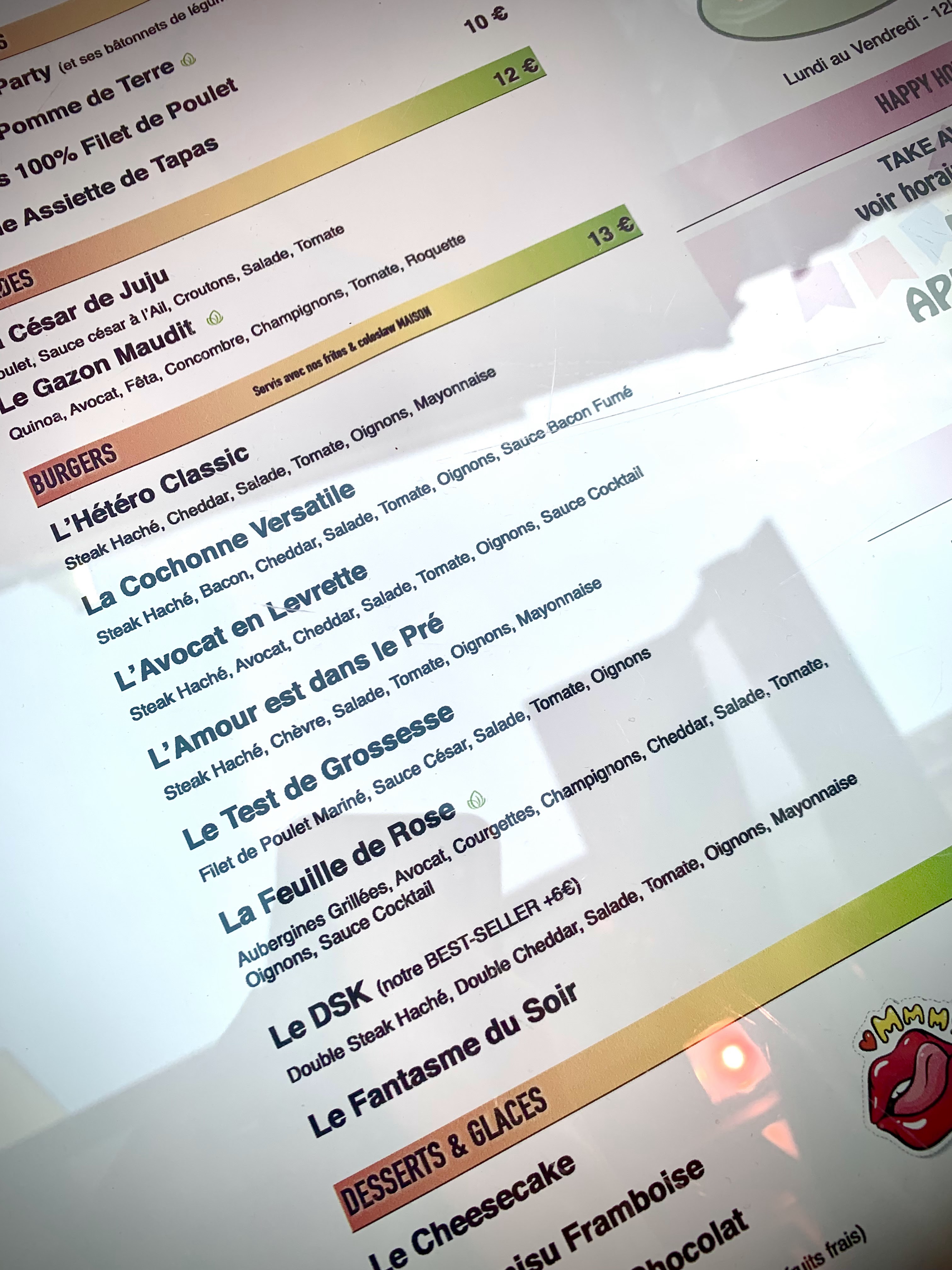 Burger hyper bons (j'ai été hetero le temps d'une soirée avec l'hetero classique et je ne l'ai pas regrettée haha) La carte est à hurler de rire, tous les noms de burgers ou de cocktails sont loufoques, on adore ! Marco est hyper gentil, gros coup de cœur pour sa bienveillance et son humour (et son t-shirt Spice girls bien sur) Un super spot à Paris !
