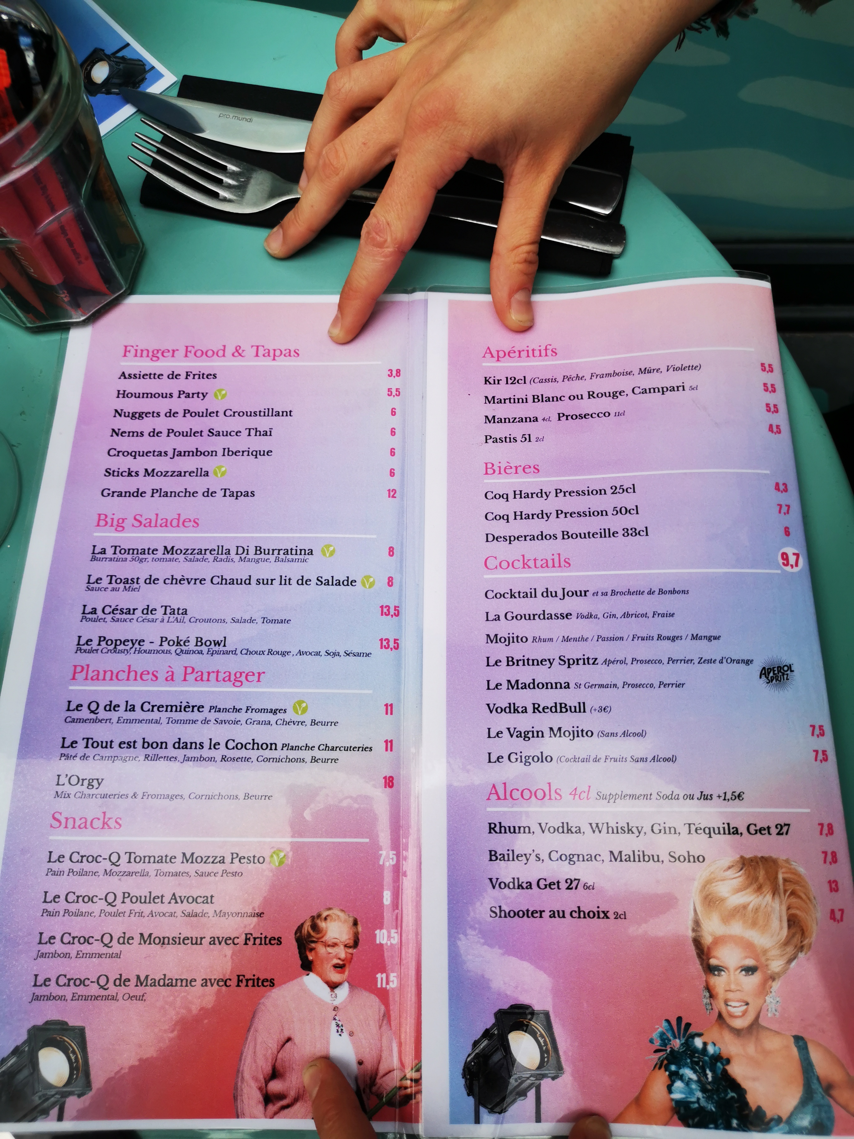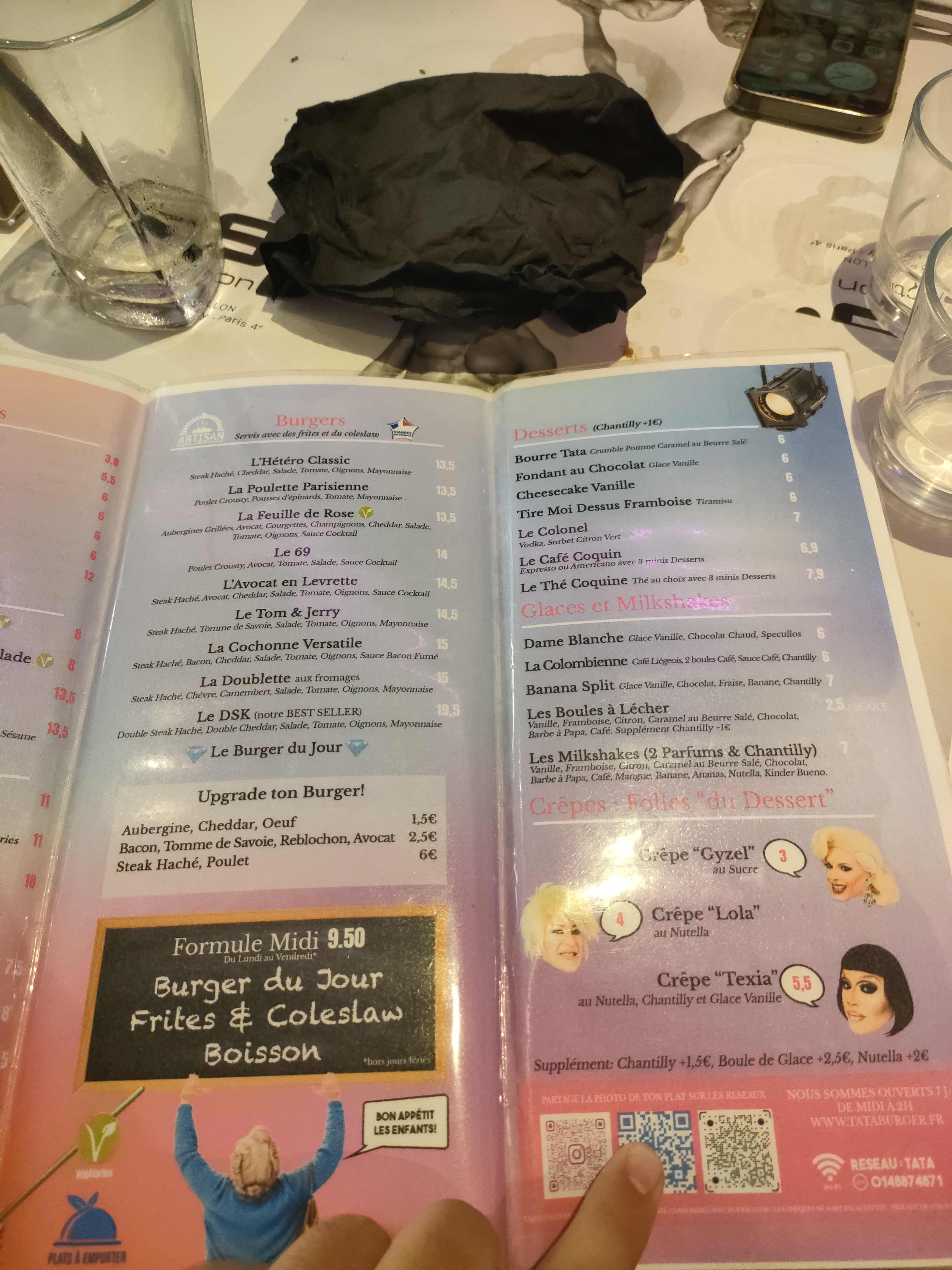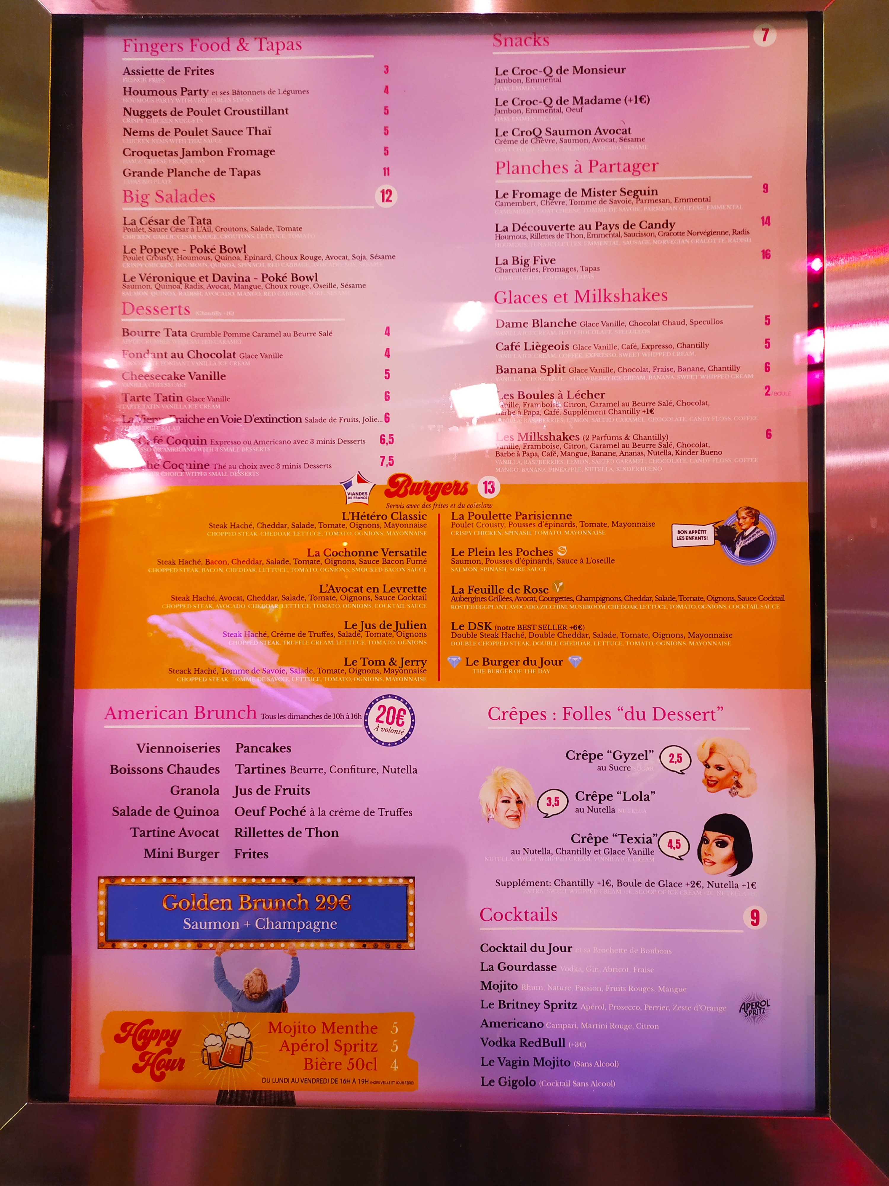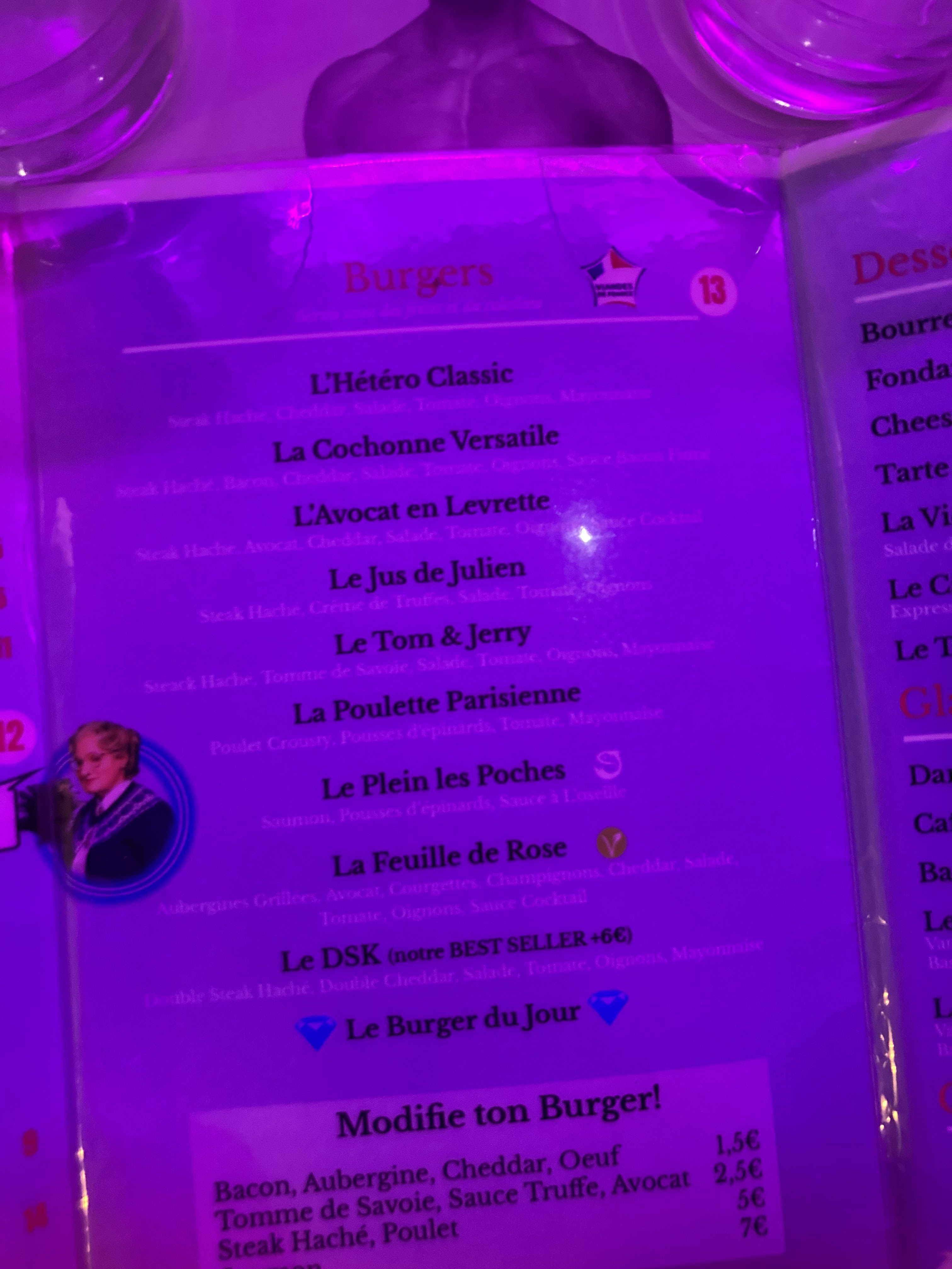 Burger hyper bons (j'ai été hetero le temps d'une soirée avec l'hetero classique et je ne l'ai pas regrettée haha) La carte est à hurler de rire, tous les noms de burgers ou de cocktails sont loufoques, on adore ! Marco est hyper gentil, gros coup de cœur pour sa bienveillance et son humour (et son t-shirt Spice girls bien sur) Un super spot à Paris !