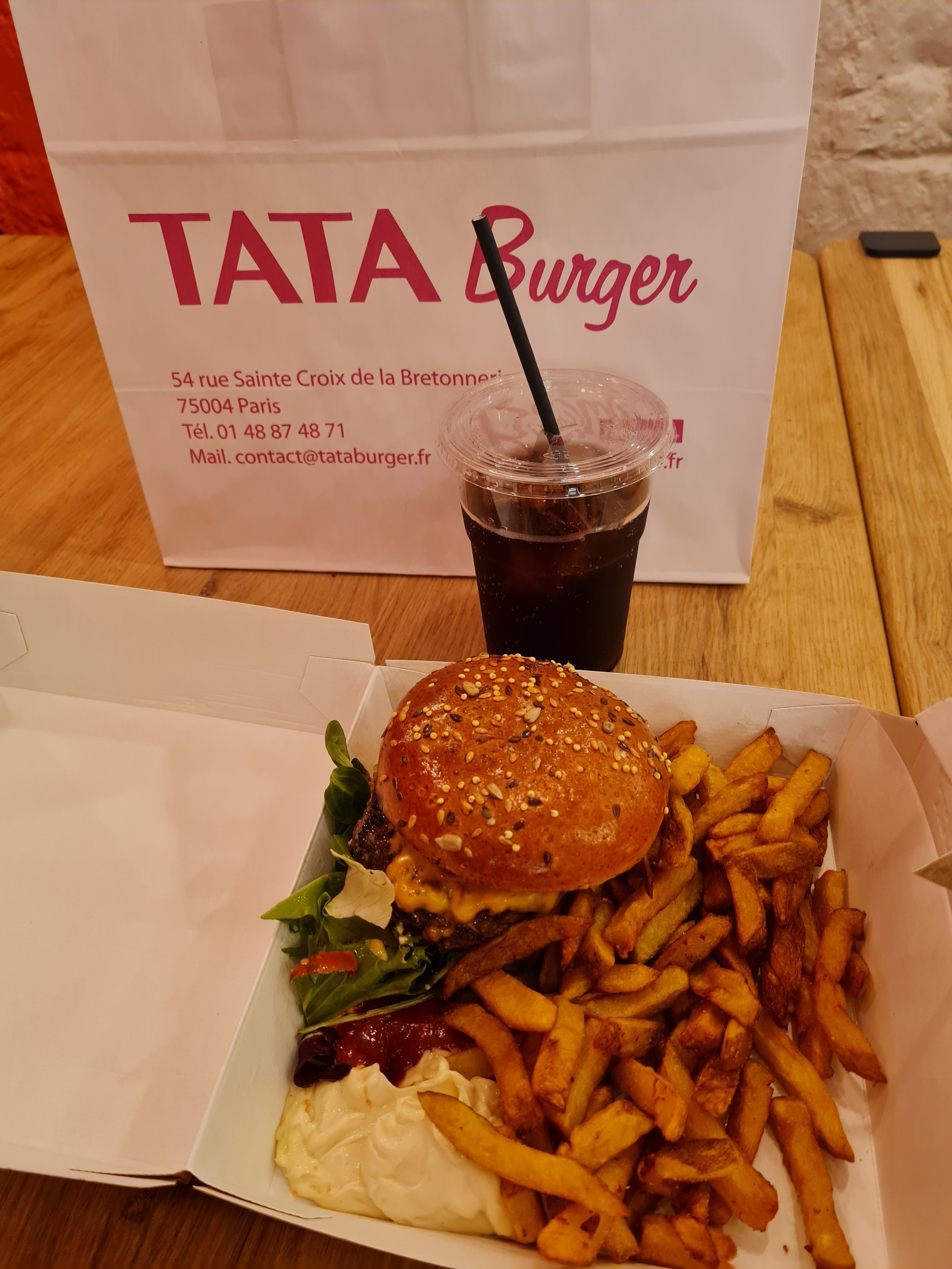Celà faisais un moment que je voulais goûter un burger de chez Tata burger, et j'en ai profiter de ma pause déjeuner d'aujourd'hui pour passer une commande et manger avant d'aller retourner bosser pas très loin. La personne qui venais nous compter nous à accueillis avec un bonjour mes petits chats, cette légèreté qui donne le sourire dans ce monde de brute aigris. Le serveur super sympa et le service ultra rapide (10min même pas pour réceptionner ma commande à emporter.) Le burger en lui-même bien garnis, le steak haché à beaucoup de goût les frites maisons, avec la mayonnaise et le ketchup super bonnes. Je recommande et je n'hésiterais pas à y retourner une prochaine fois.