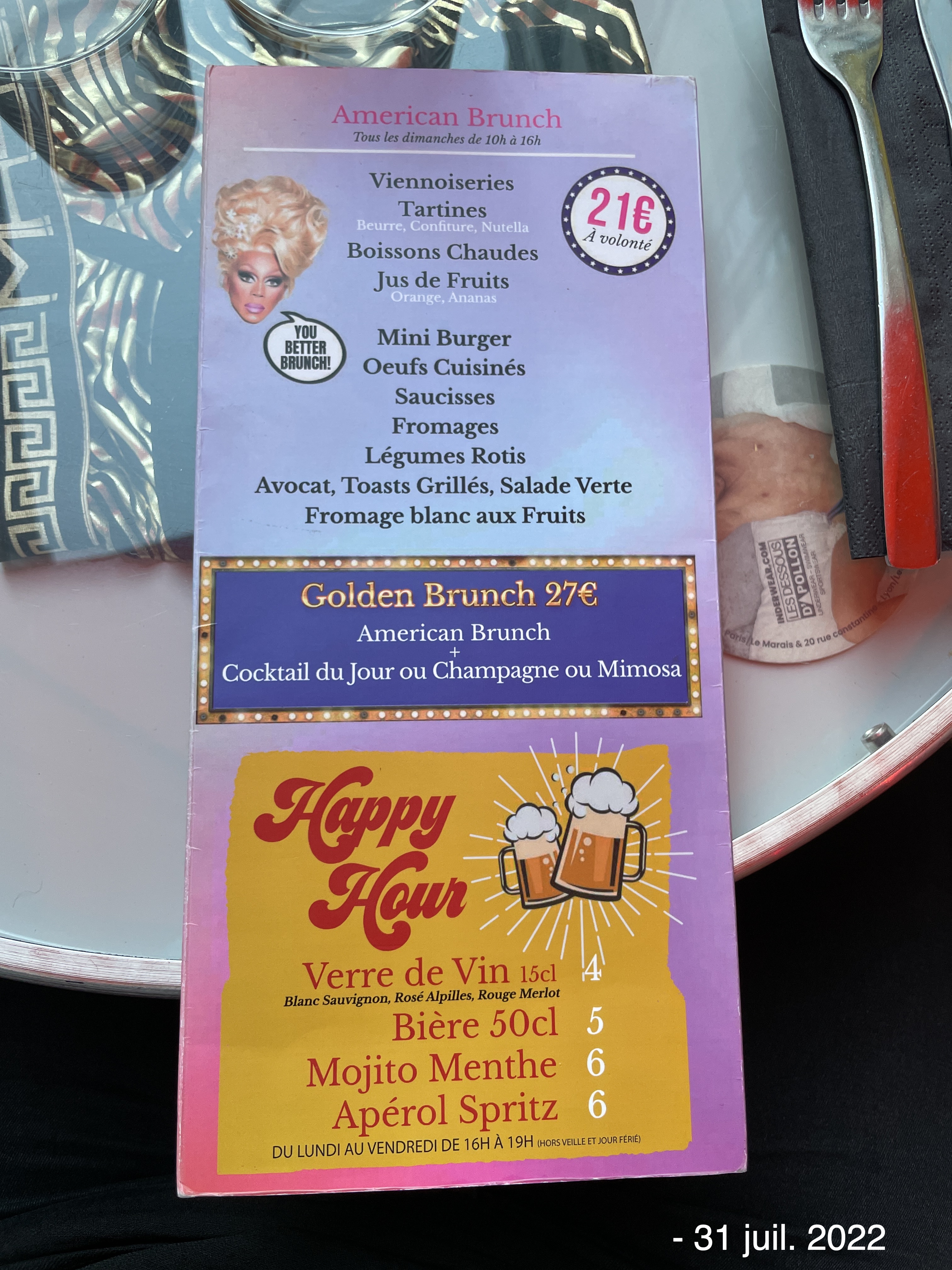 Le lieu INCONTOURNABLE du Marais ! L'ambiance est à l'image de ses serveurs : chaleureuse, conviviale et folle ! Ce qui fait qu'on s'y sent super bien 😊 Le brunch est copieux et de qualité et à volonté ! J'y retournerai la prochaine fois que je viendrai dans le coin. Pensez à réserver vos places ! Eh oui, quand on propose un super bon service, on a une belle notoriété et on est forcément très demandé ! Merci pour votre bonne humeur ! Dommage que les restos ne prenenr pas l'exemple sur vous. Simplice, nature, aimable, bon voilà les clés du succès.