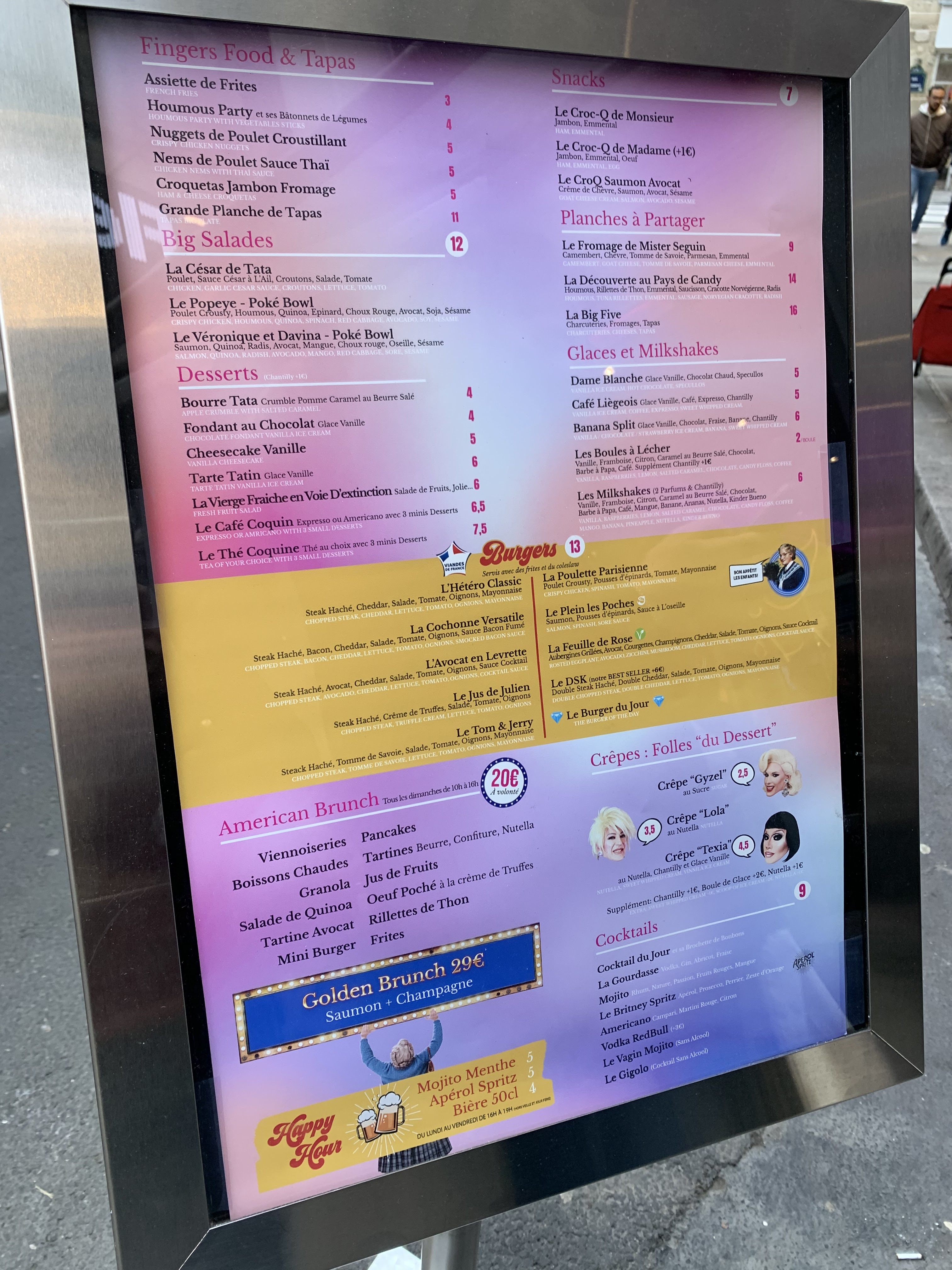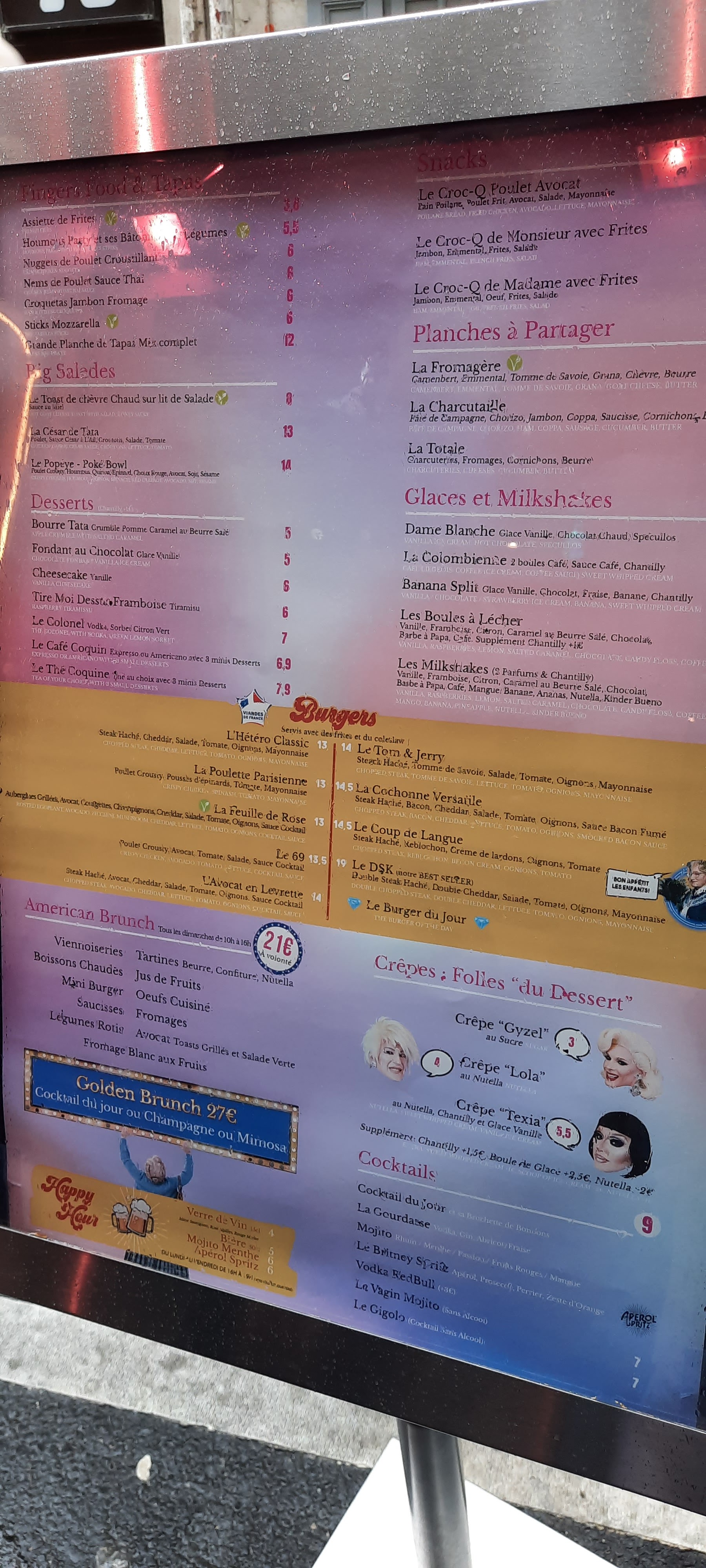 Les noms des plats sont très drôles et le rapport qualité-prix est bon. Le service est au top, serveurs sympas et prévenants. L'ambiance générale est... conforme au marais ;)