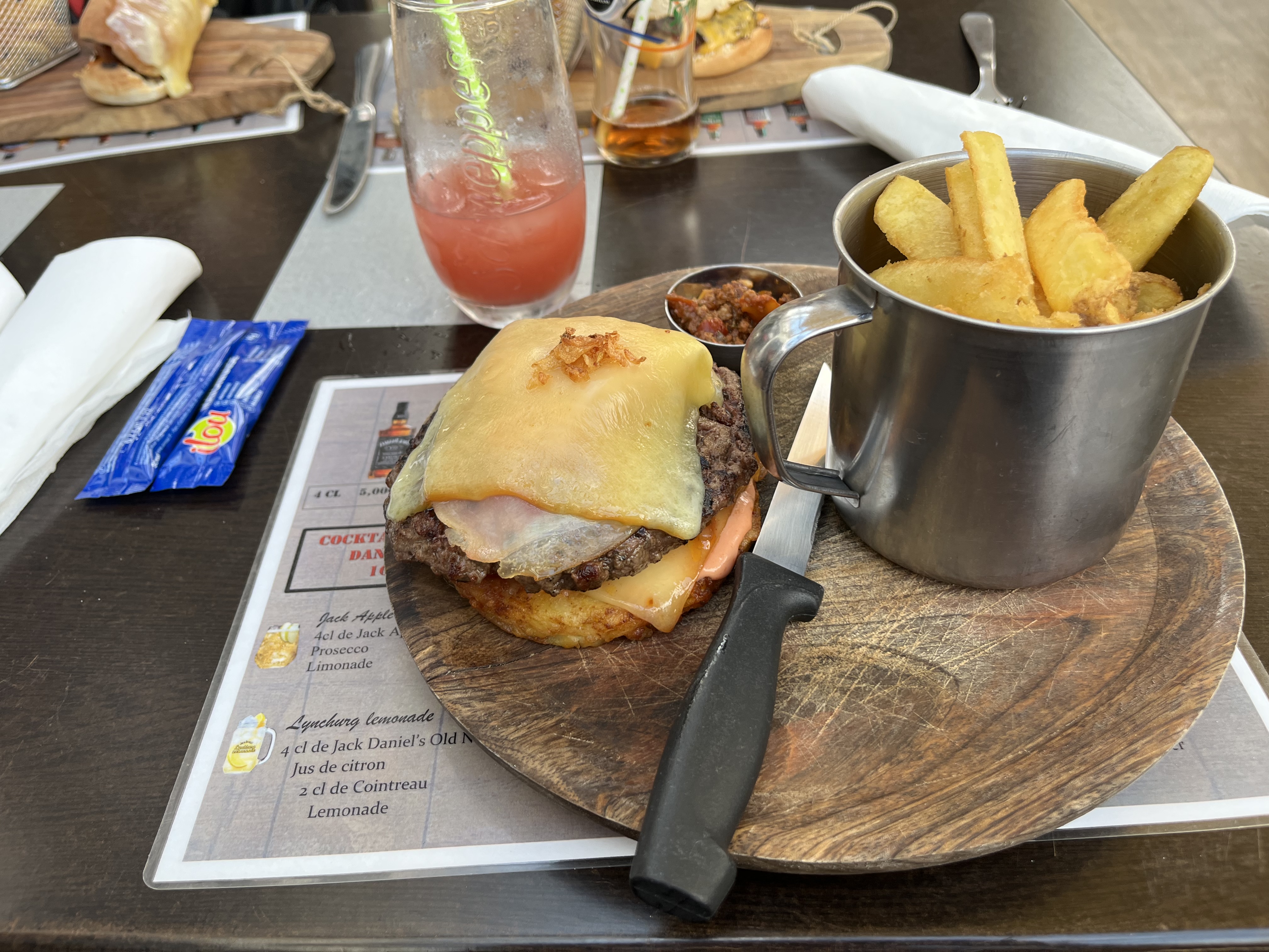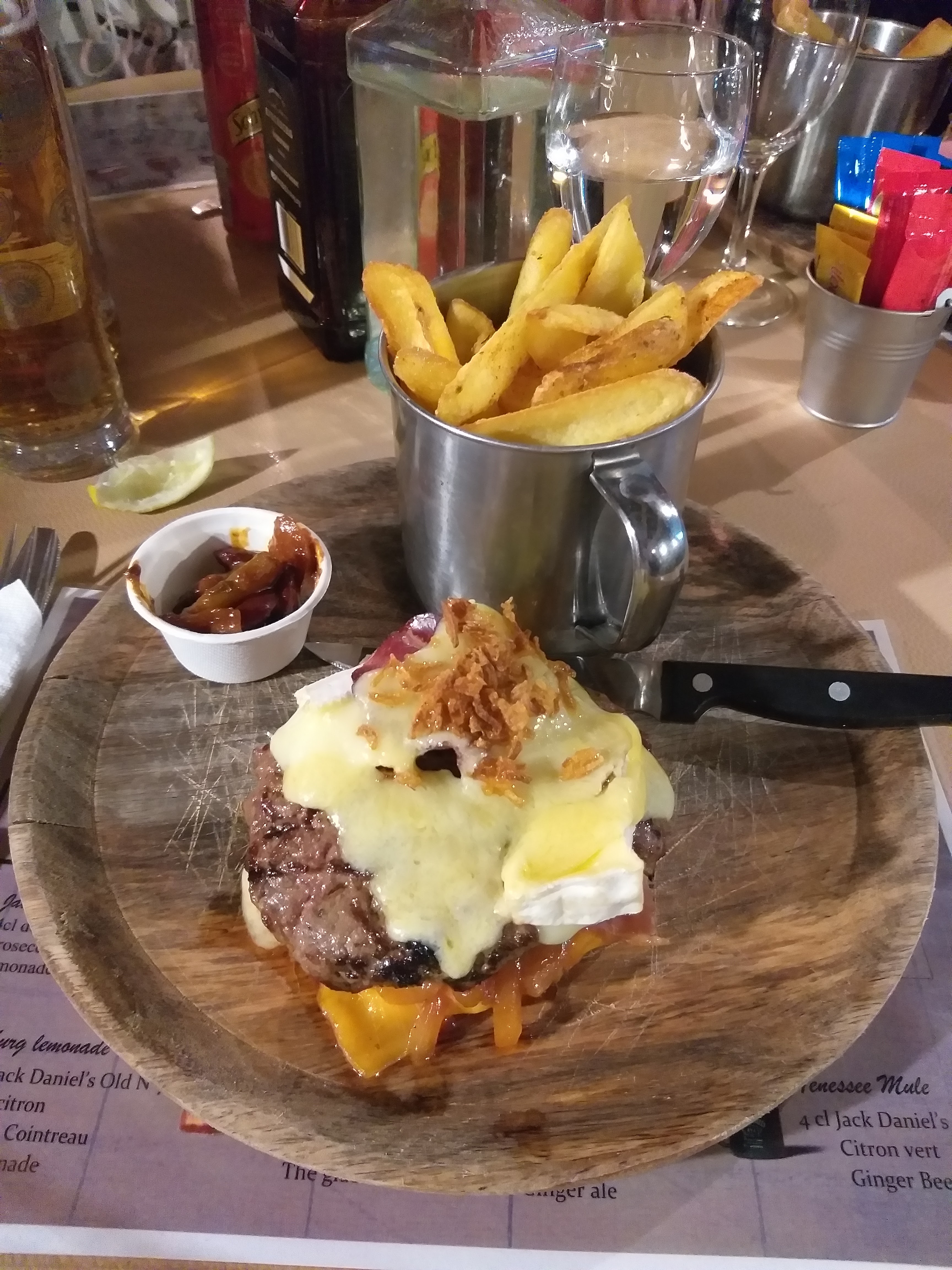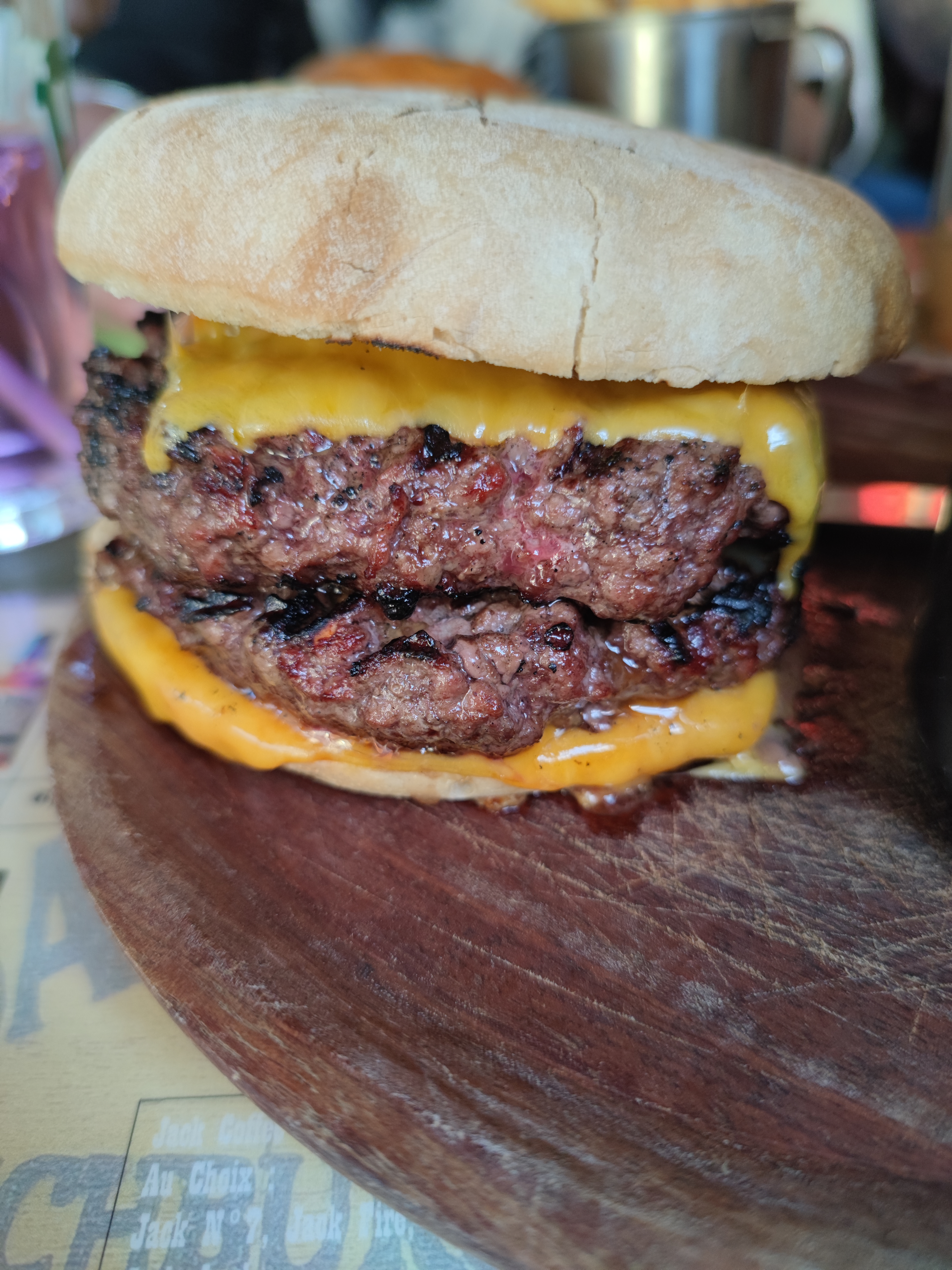 Hamburgers plus que copieux et très bon. Un vrai Burger avec 2 gros steaks qui ont du goût et bien garnis Très bon rapport qualité prix : en comparaison moins cher que le menu Signature au McDo. Sauce Chili pour accompagner les frites. Cocktails jack Daniels à découvrir. Diabolo pour enfants servi à la pint. Très appréciable en ces périodes caniculaires.