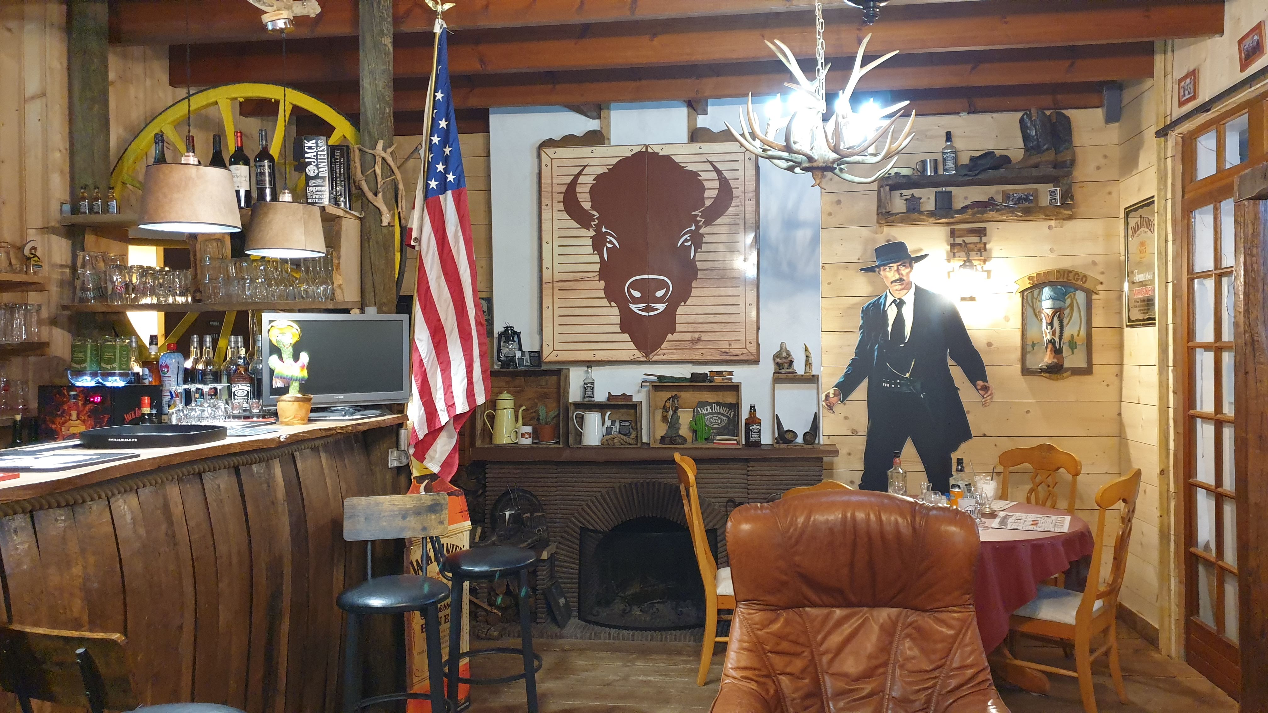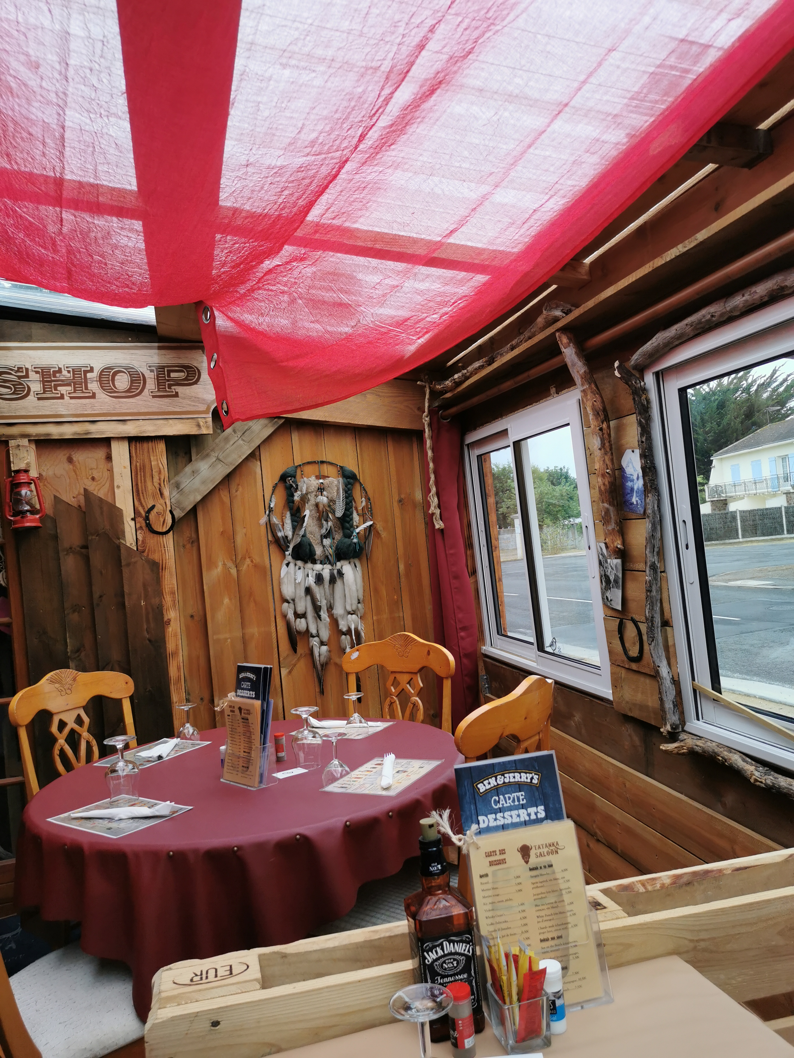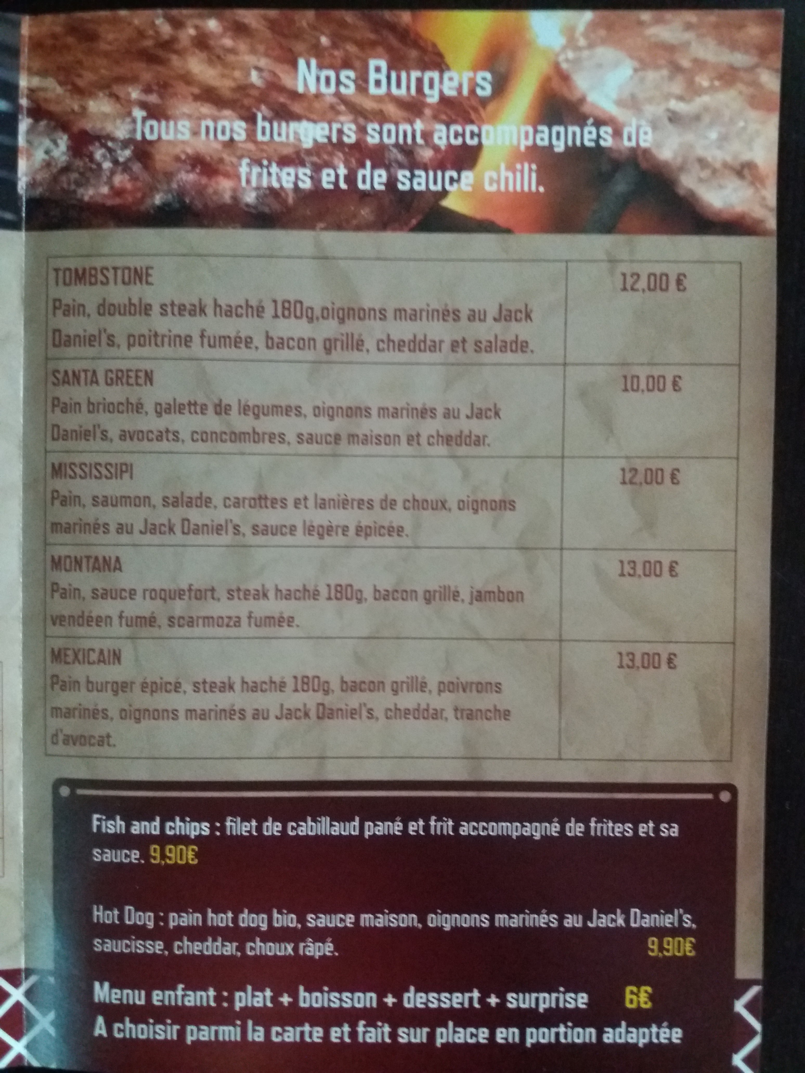 Super restaurant saloon avec enfin de gros hamburger a juste prix avec de la bonne viande des frites et sauce chili ainsi que les déserts maison super ambiance far-west accueil formidable absolument recommandé famille nombreuse petit budget et on peut aussi emporté un vrai régal foncé