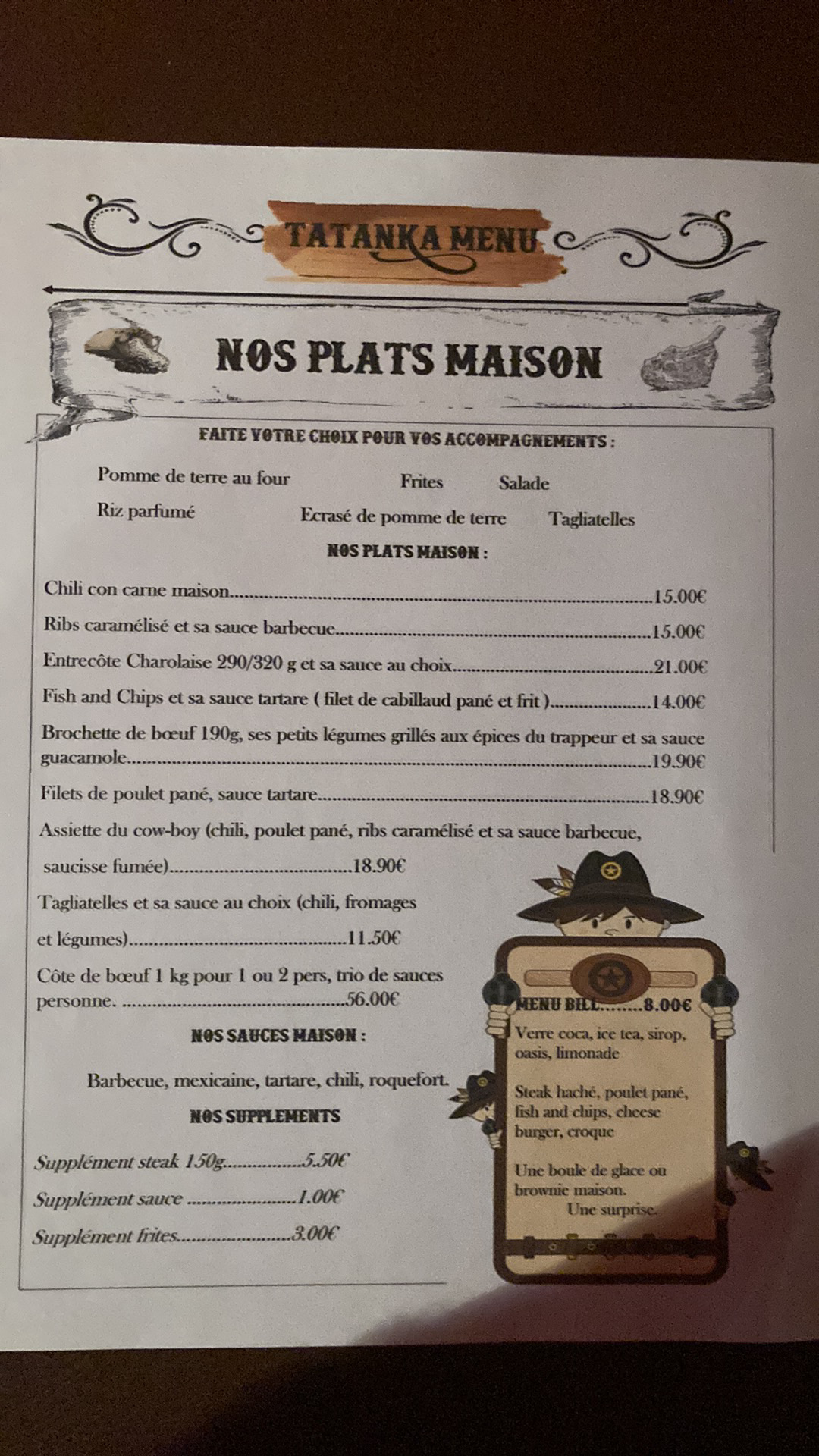 Nous avons passé une excellente soirée au Tatanka Saloon ! Amabilité de la patronne lors de la réservation, accueil très courtois et agréable par le patron, un service au top attentionné avec les enfants, une carte fournie (la liste des hamburgers et celle des whiskies m'ont impressionné), des plats délicieux avec un vrai savoir-faire maison, ... Le tout dans une ambiance hors du temps. Ils sont tous deux investis à fond et nous leur souhaitons la meilleure réussite dans les nombreux projets qu'ils ont dans les cartons ;). Merci !