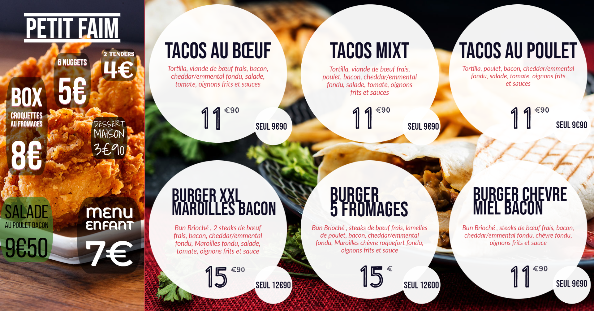 J ai adoré. Je recommande sans hesiter. Des produit frais a prix abordable. A refaire tres prochainement. Le burger maroille une tuerie et le taccos mix a tomber par terre. Allez y vous ne serait pas déçu !