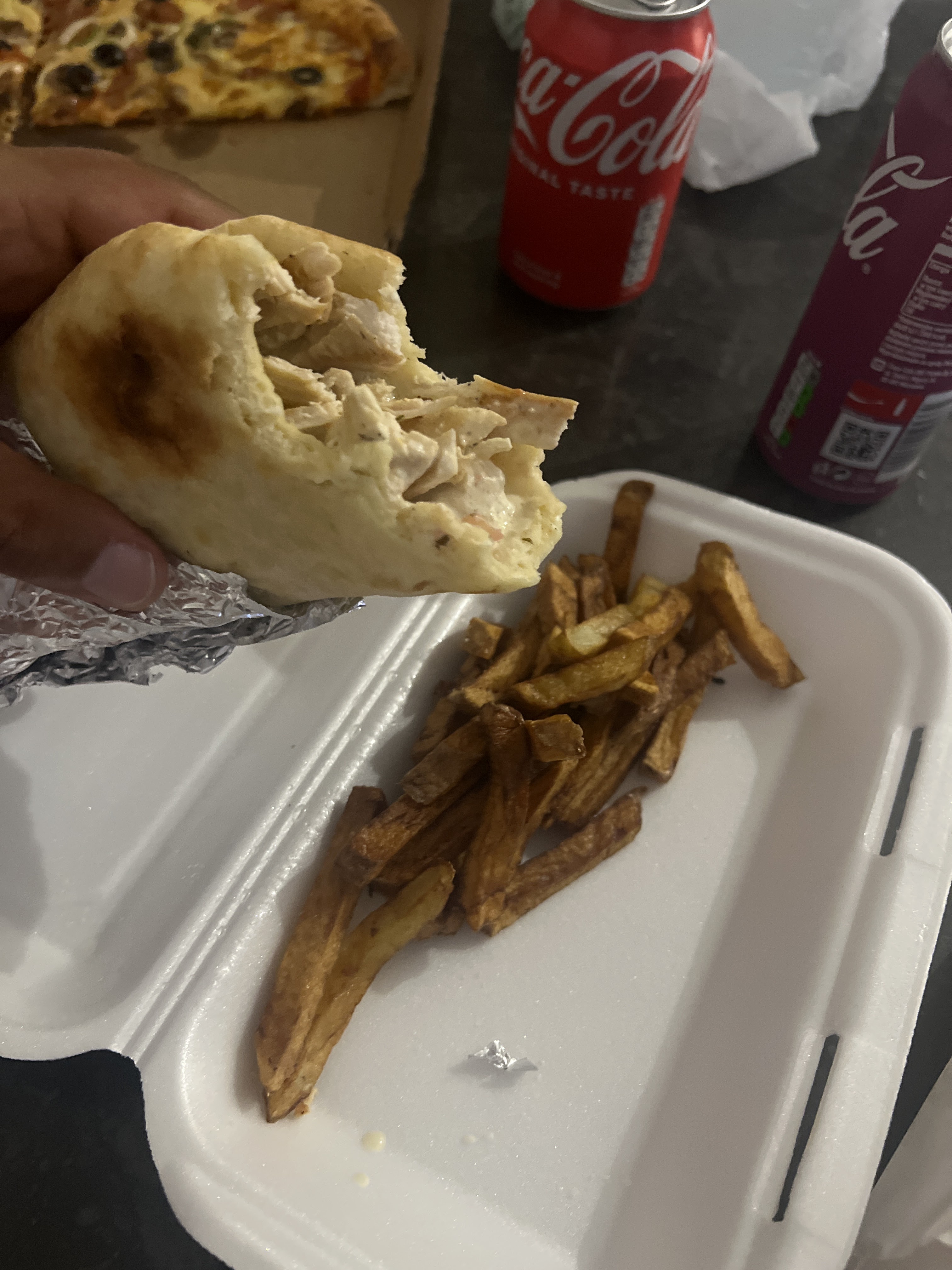 Frite avec goût de congelée.. le kebab même pas garnis j’ai jamais vu un kebab aussi peu garnis. Déçu.
