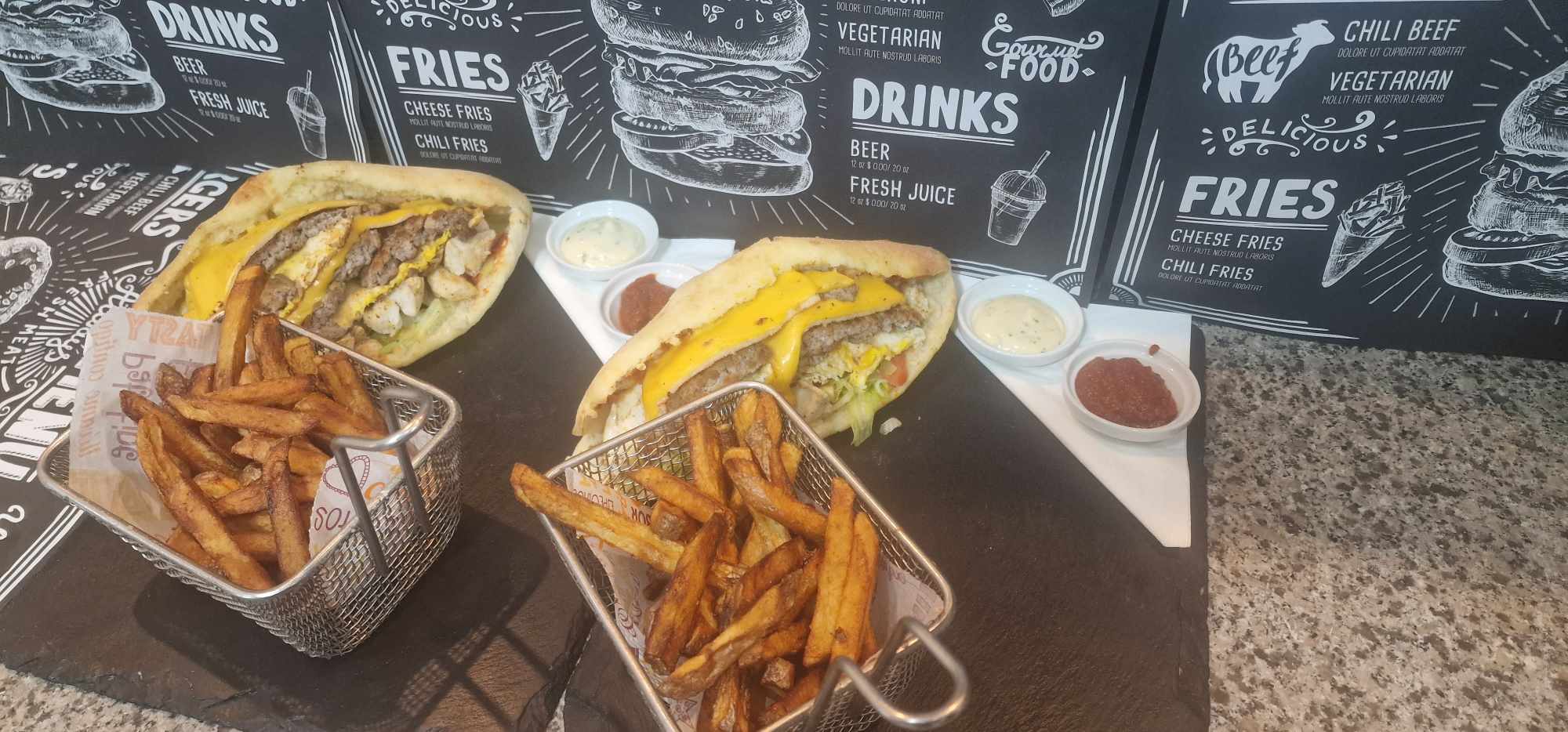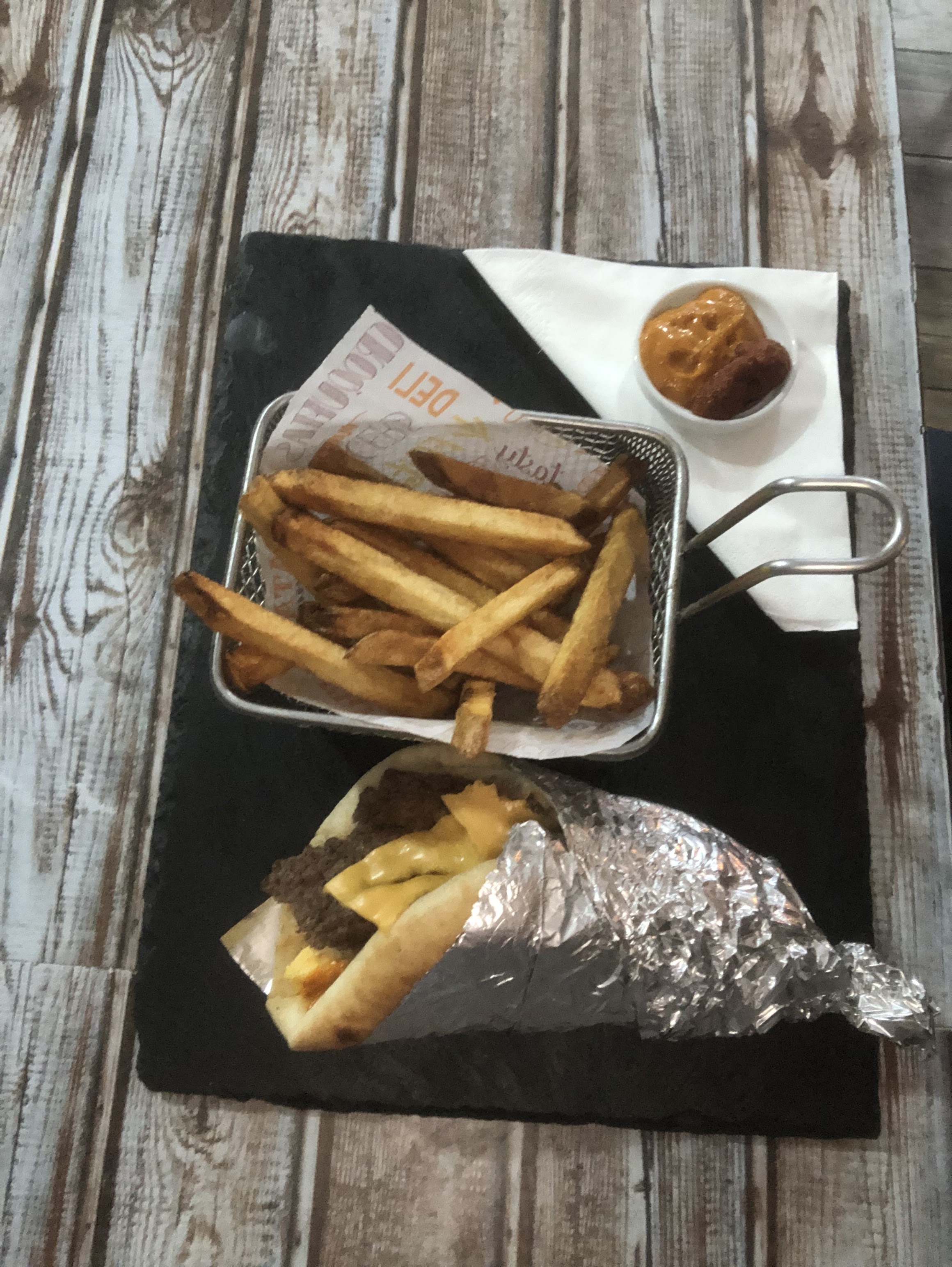 1h30 d’attend, même à macdo l’es steak sont mieux cuit, le pain dur est sec et les frittes était noyé de supplément cheddar et le supplément cheddar était vraiment mauvais et le frittes était même pas cuit