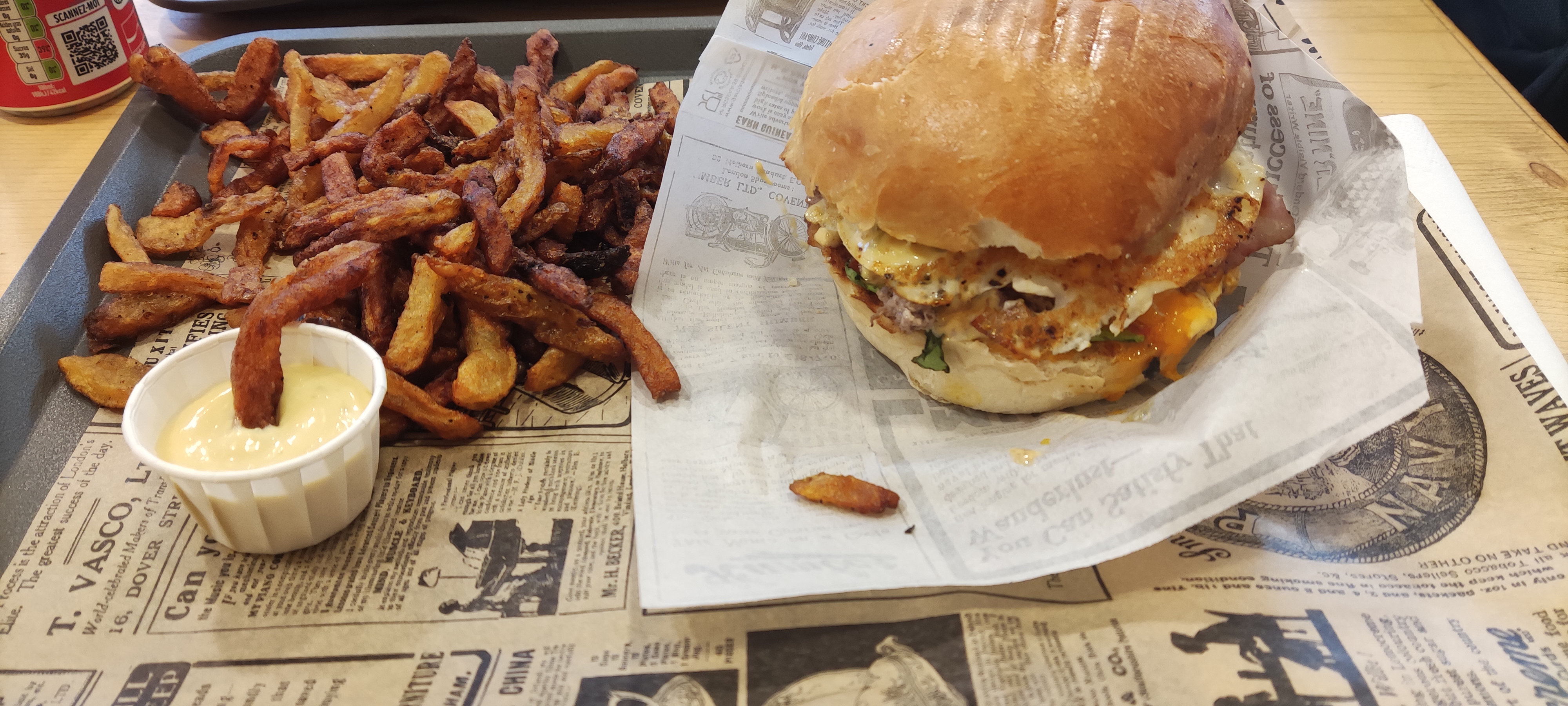 Mon burger était bon mais aurait mérité une assiette et des couverts à cause de l'oeuf. 16e en menu avec un coca et des frites jeté sur le plateau sans récipient, OK c'est sûrement un concept moi je n'aime pas trop. Menu enfant 10e 5 nuggets et des frites avec un dessert. Qui devait être un kinder surprise, annoncé Sur les cartes, à la place j'ai eu 4 bonbons... Pas super comme dessert pour nos enfants.. Frites annoncés fraîches mais c'était clairement pas le cas. Aucun service, ça fume de tous les côtés, bref je n'y reviendrais pas.