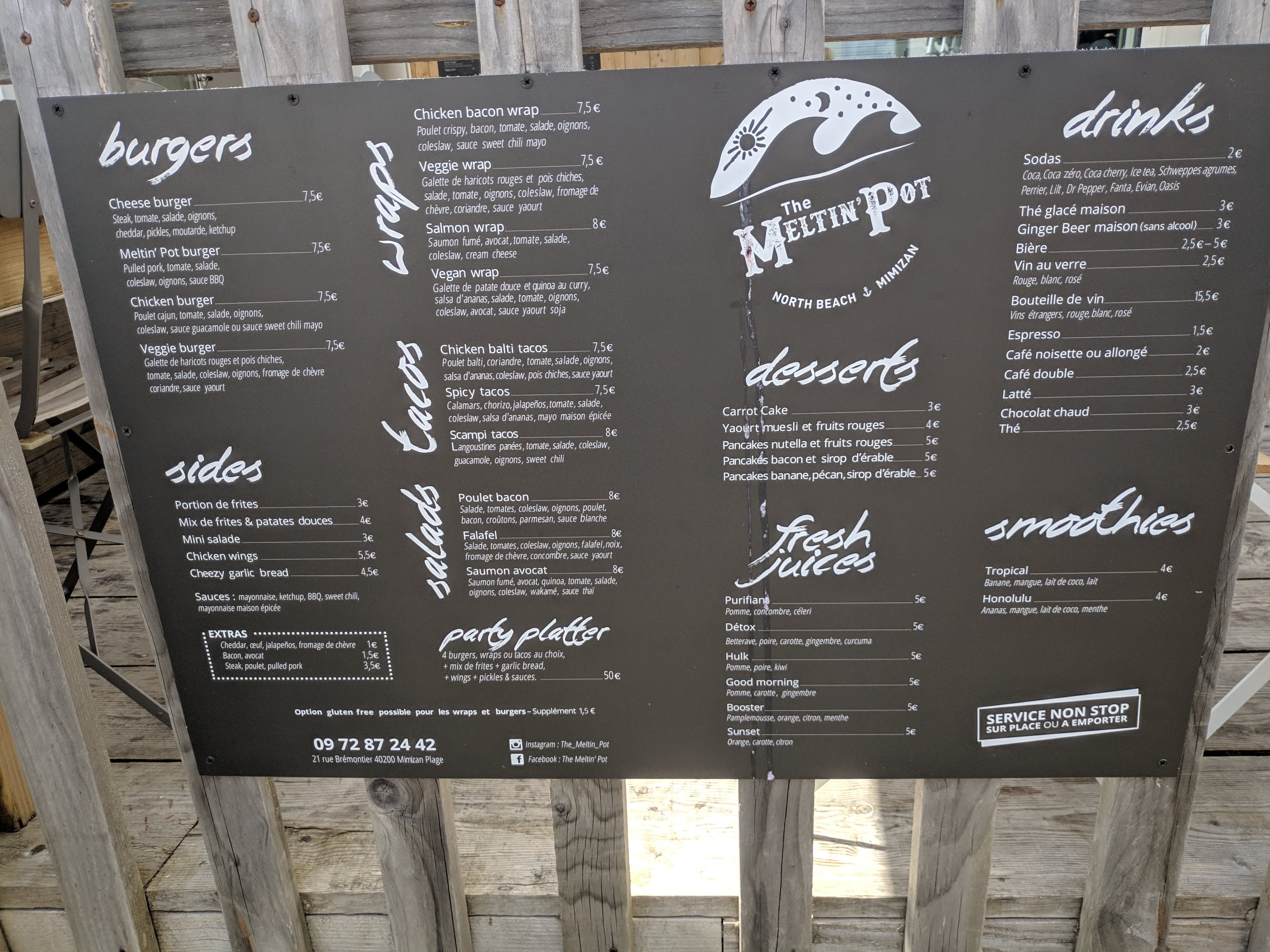 En période de forte affluence prenne le temps de vous renseigner. Accueil au top . Burger melting pot couteux et genereux idem pour le veggie wrap. Je recommande .