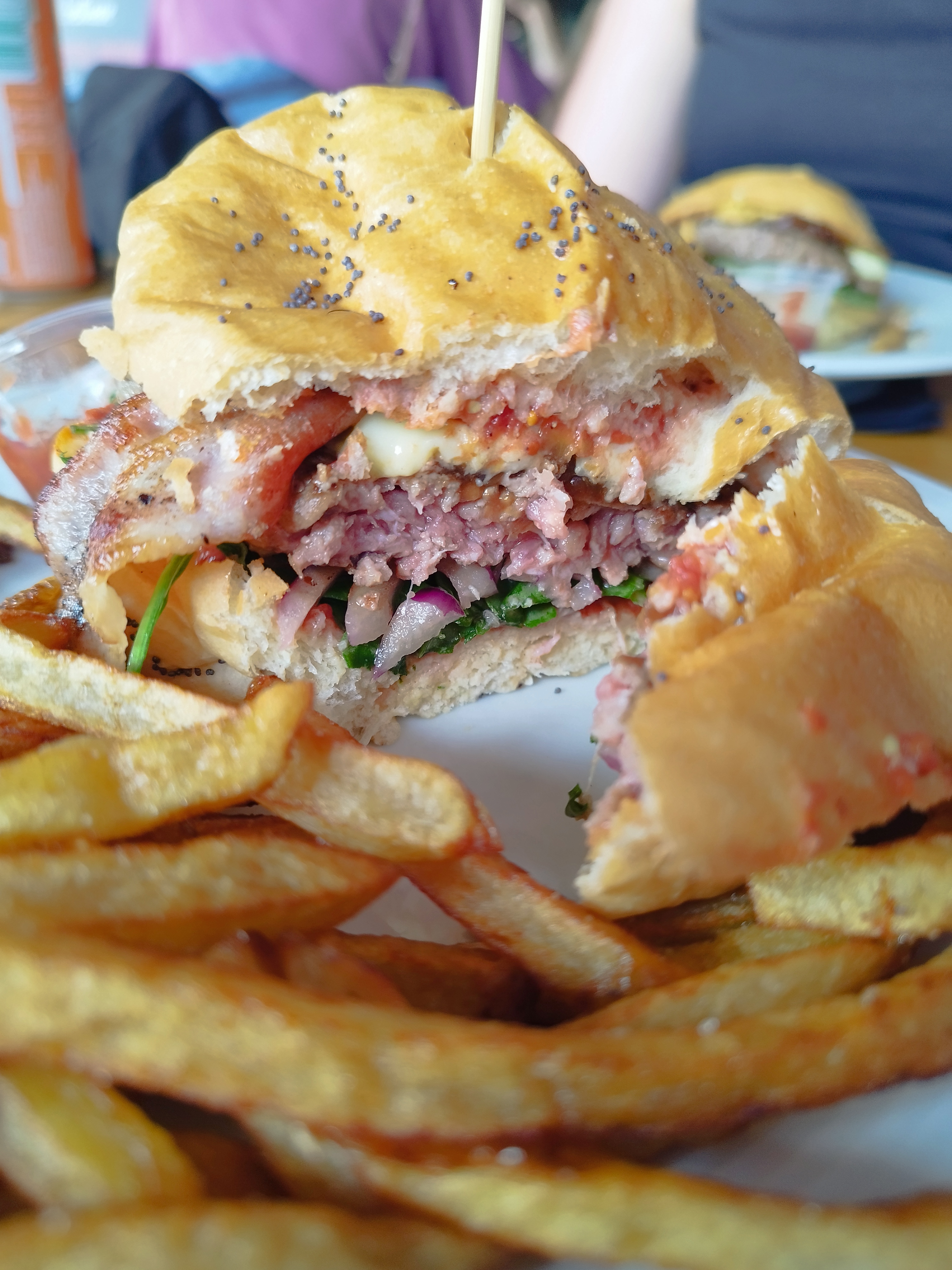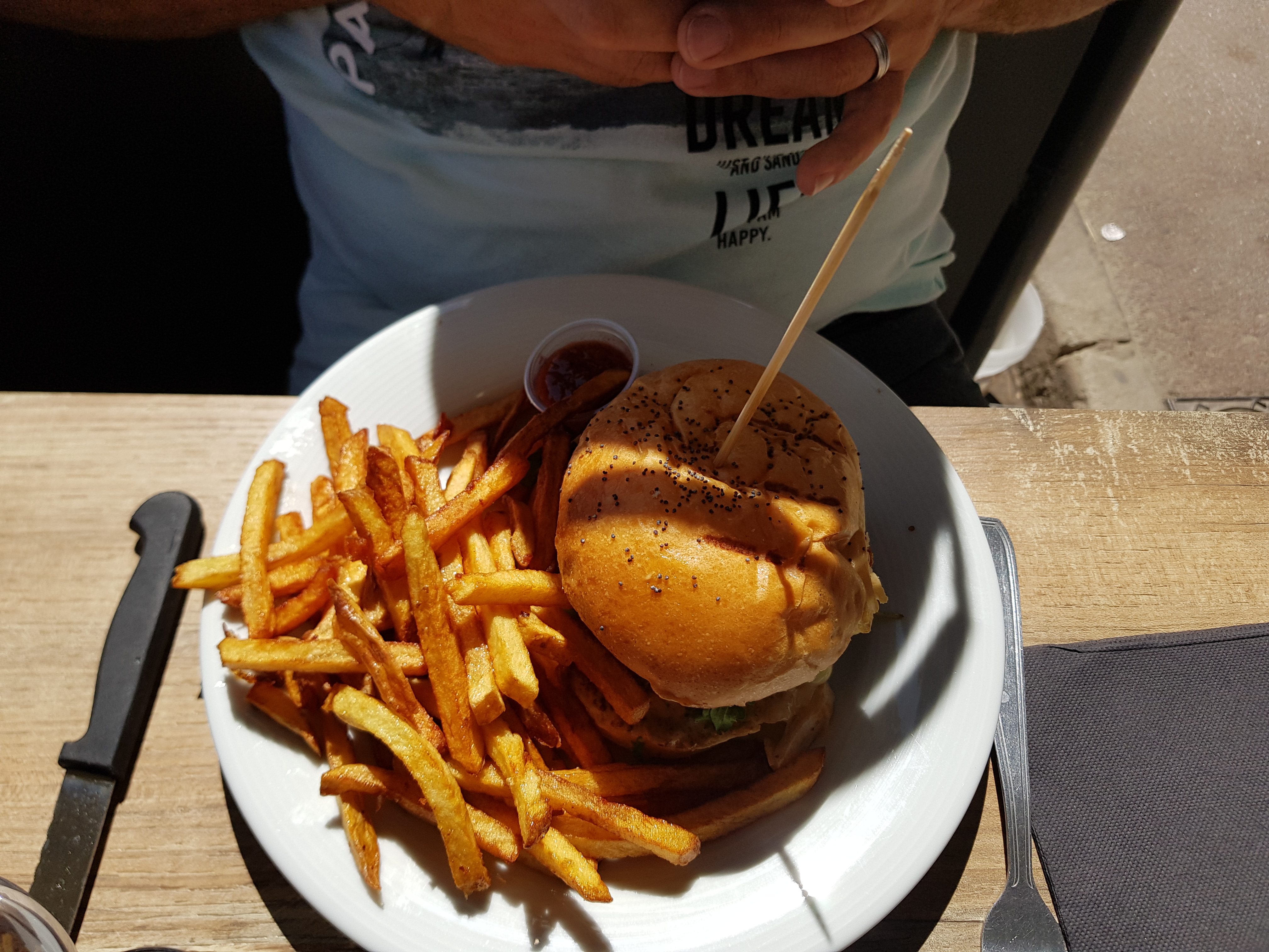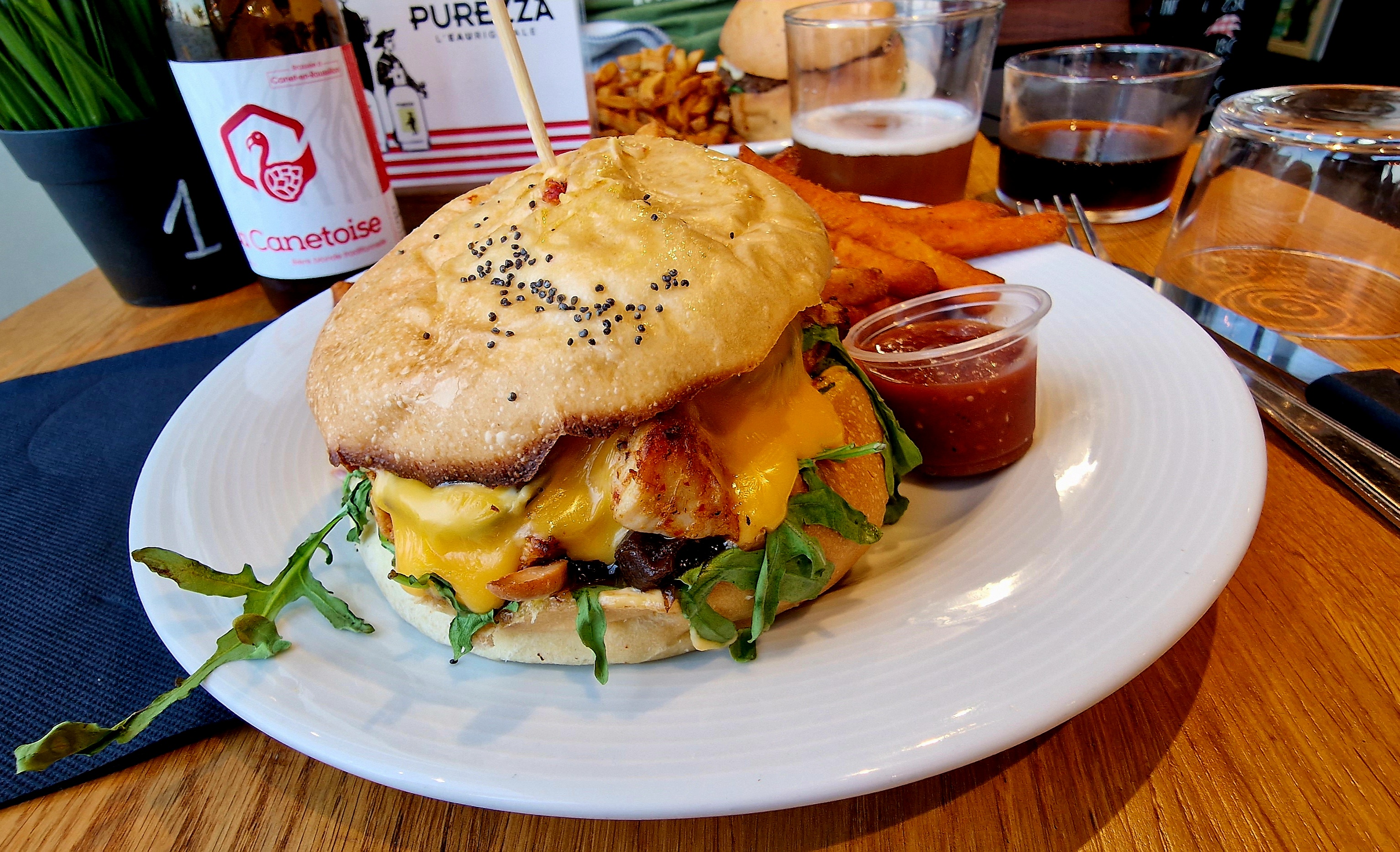 Un bon choix sur le menu. Burger classique est un incontournable avec frites et servi avec le sourire. A déguster sur place sur la terrasse ou à l’intérieur.
