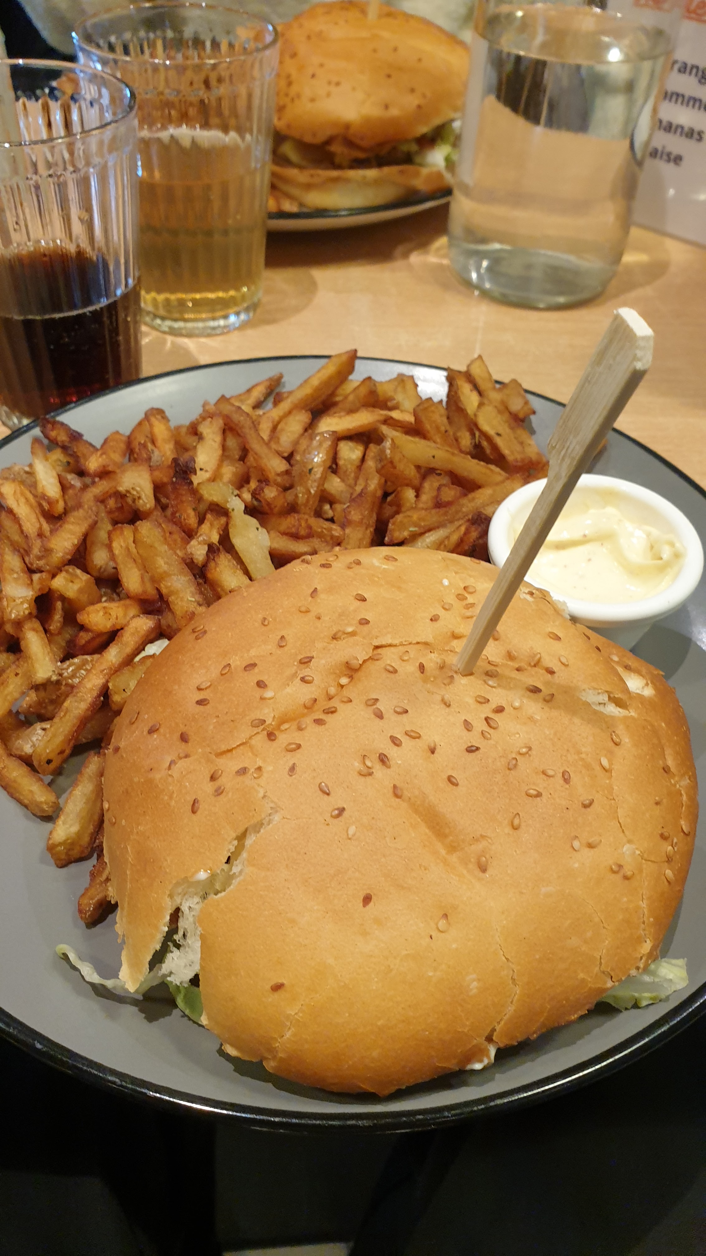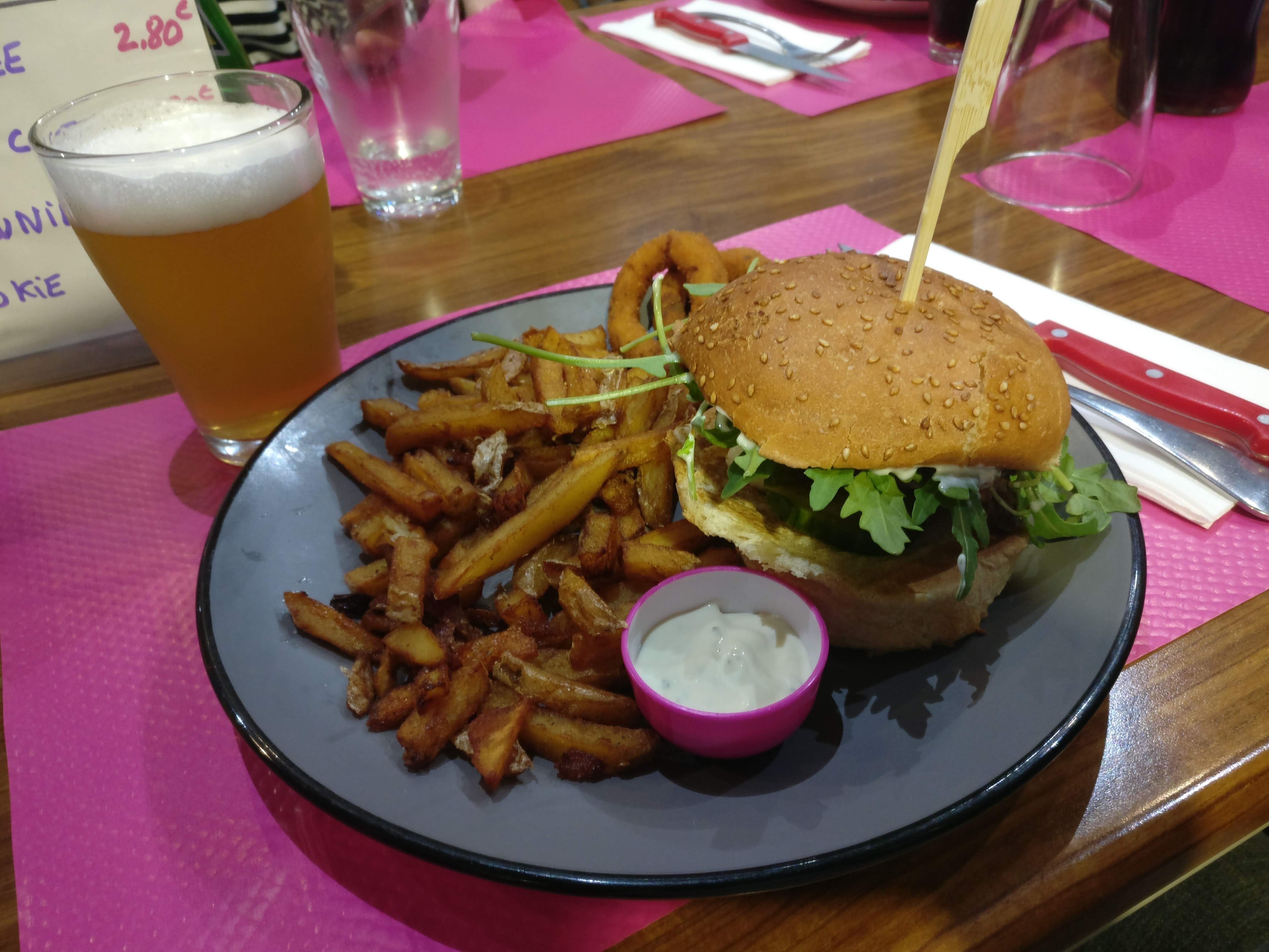 Quel plaisir de pouvoir manger un burger vegan qui soit aussi bon ! C'est vraiment une bonne idée de proposer différents choix de garnitures et de sauce (pour ma part caviar d'aubergines, champignons, poivrons, sauce barbecue), je me suis régalée ! Les frites sont excellentes également : frites maison (ça se sent !) et surtout pas recouvertes de sel comme on le voit hélas trop souvent.