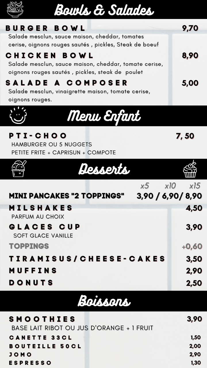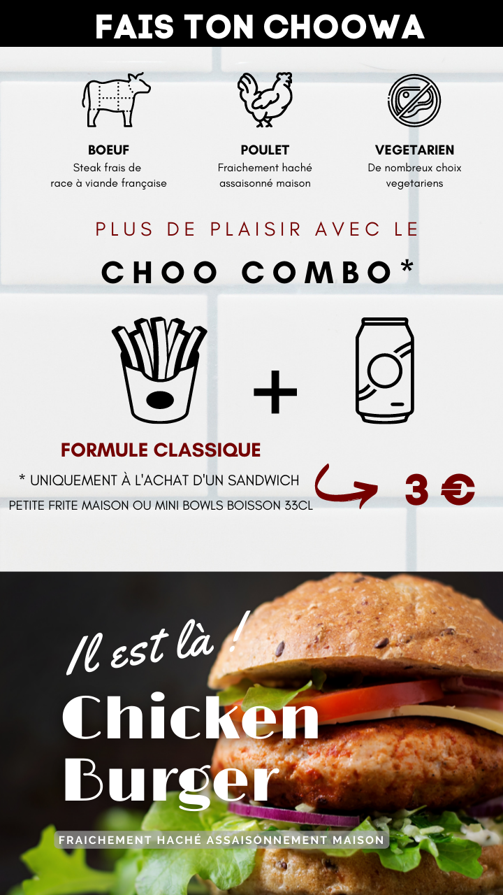 Bonjour J’ai commandé 2 Choowe avec ma mère (qui n’est pas très burger a la base) avec les formules boisson + dessert C’était excellent et même ma mère a adoré c’est vraiment du fait maison même les desserts ! Franchement on a vraiment énormément aimé de A a Z J’encourage tout le monde sans hésitation à goûter c’est très très bon et l’accueil est très agréable donc c’est PARFAIT !