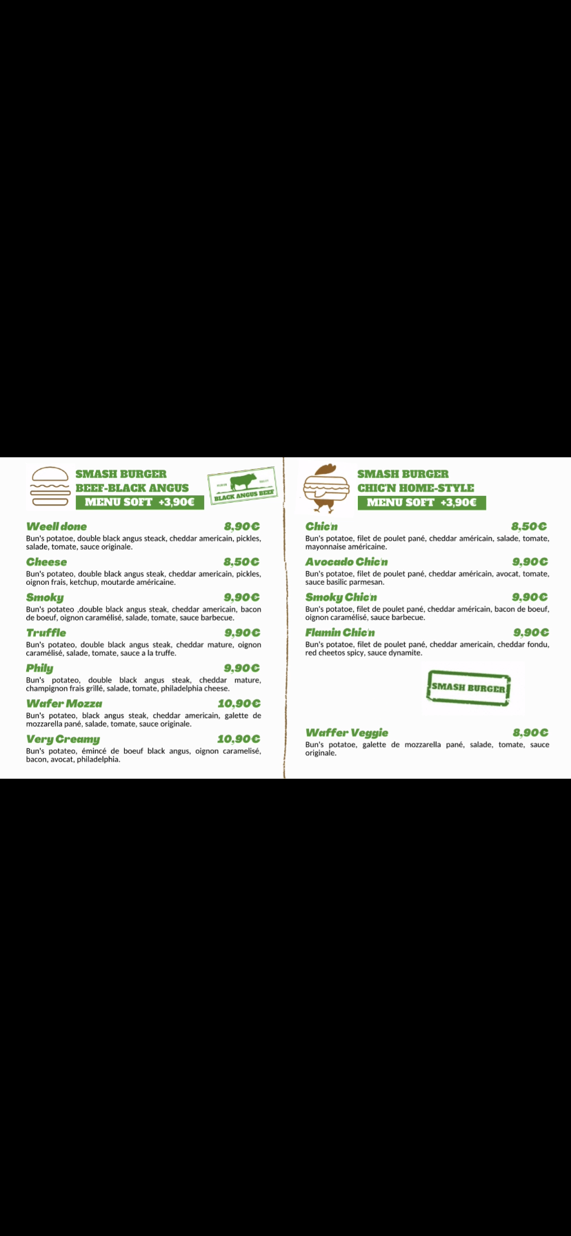 Après l'avoir découvert sur les réseaux sociaux depuis quelques semaines et étant une adepte des smash je me suis rendue dans l'enseigne. La publicité fait l'éloge d'une qualité de viande (black angus) et d'une carte riche mais j'ai été surprise du résultat. La qualité des sandwich ne vaut pas trop le prix (8,9 le burger seul et ajouter 3,90 donc 4€ quoi pour une frite et boisson). Le smash en lui même n'est pas top niveau saveur et est assez décevant. Les frites sont servies en revanche très généreusement (coup de coeur pour les curly fries). Il faut compter 8euros pour un menu enfant comprenant une frite des nugget et une boisson.. Le black angus pourrait sûrement expliquer le prix du burger mais un menu enfant sans même un dessert ou une petite récompense ne vaut vraiment pas le prix..! Bref, ce commentaire n'est pas pour nuire mais pour vous aider à améliorer car il ne va pas faire long feu..