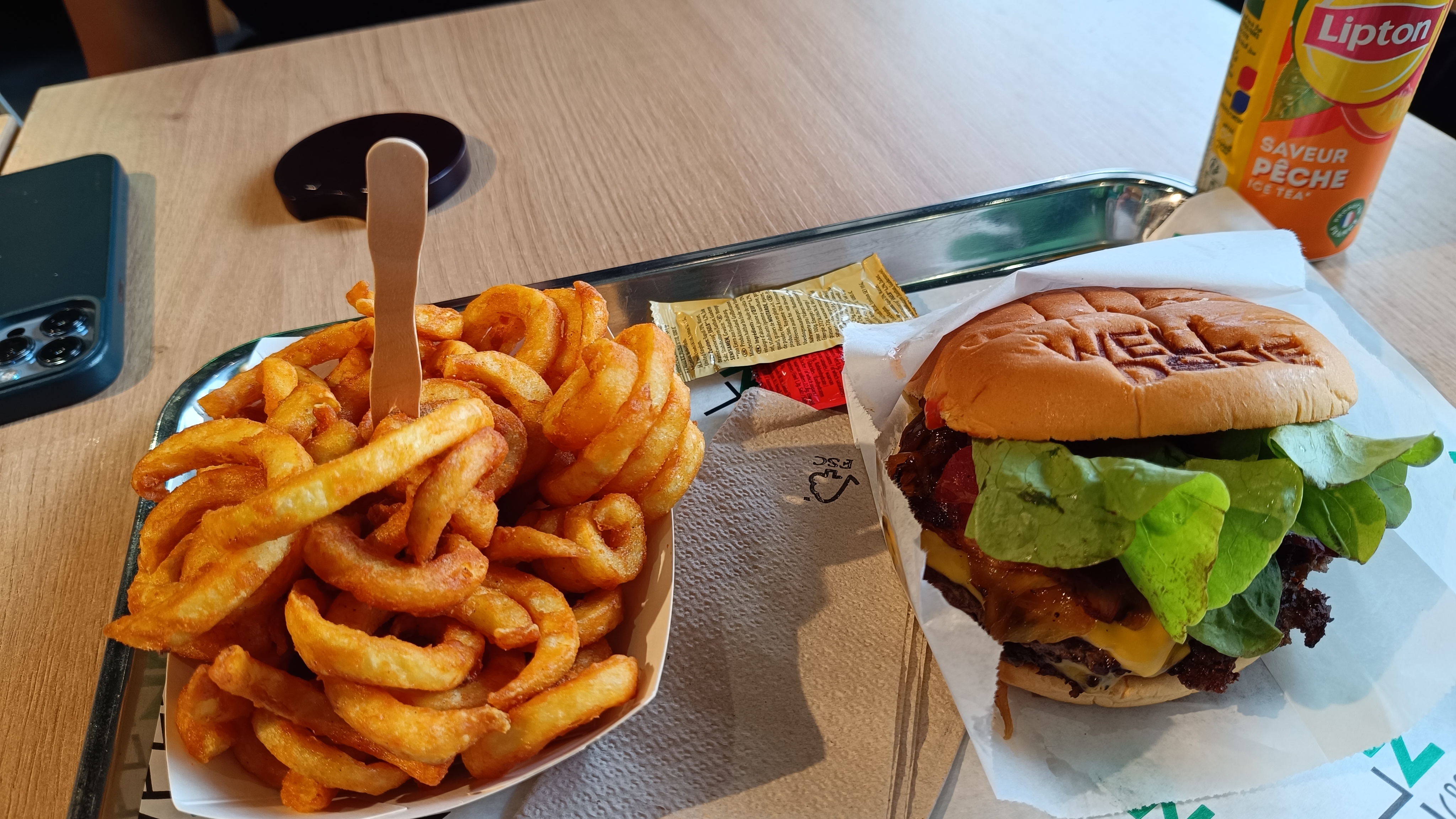 Ce ne sont pas les meilleurs smash de ma vie mais ils sont bons. Les frites torsadées sont top pour une fois je me suis régalée avec les accompagnements. Dommage pour les sauces mayo ketchup pas très bonnes. Très bruyant car QG des lycéens d'à côté 😅